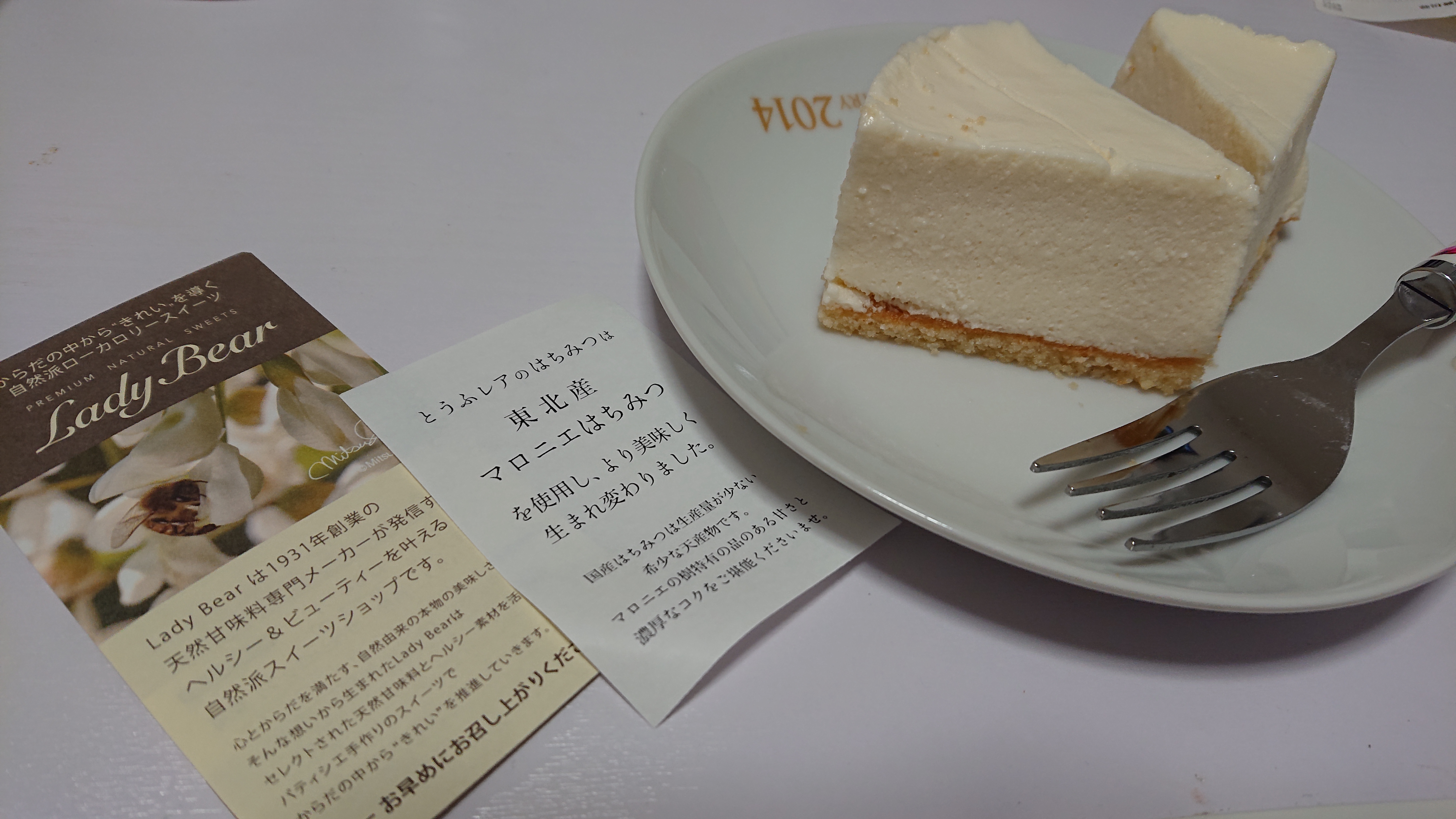 解凍を終えた状態でいただくと、先程とは異なりチーズケーキの部分の滑らかさがたまりません。少しお豆腐の香りがしますが、二種類のはちみつとアガベシロップだけの甘みとは思えないしっかりとした甘さを、自家製レモンジュレのほろ苦さと共に口説くないケーキへと調和させてくれます。