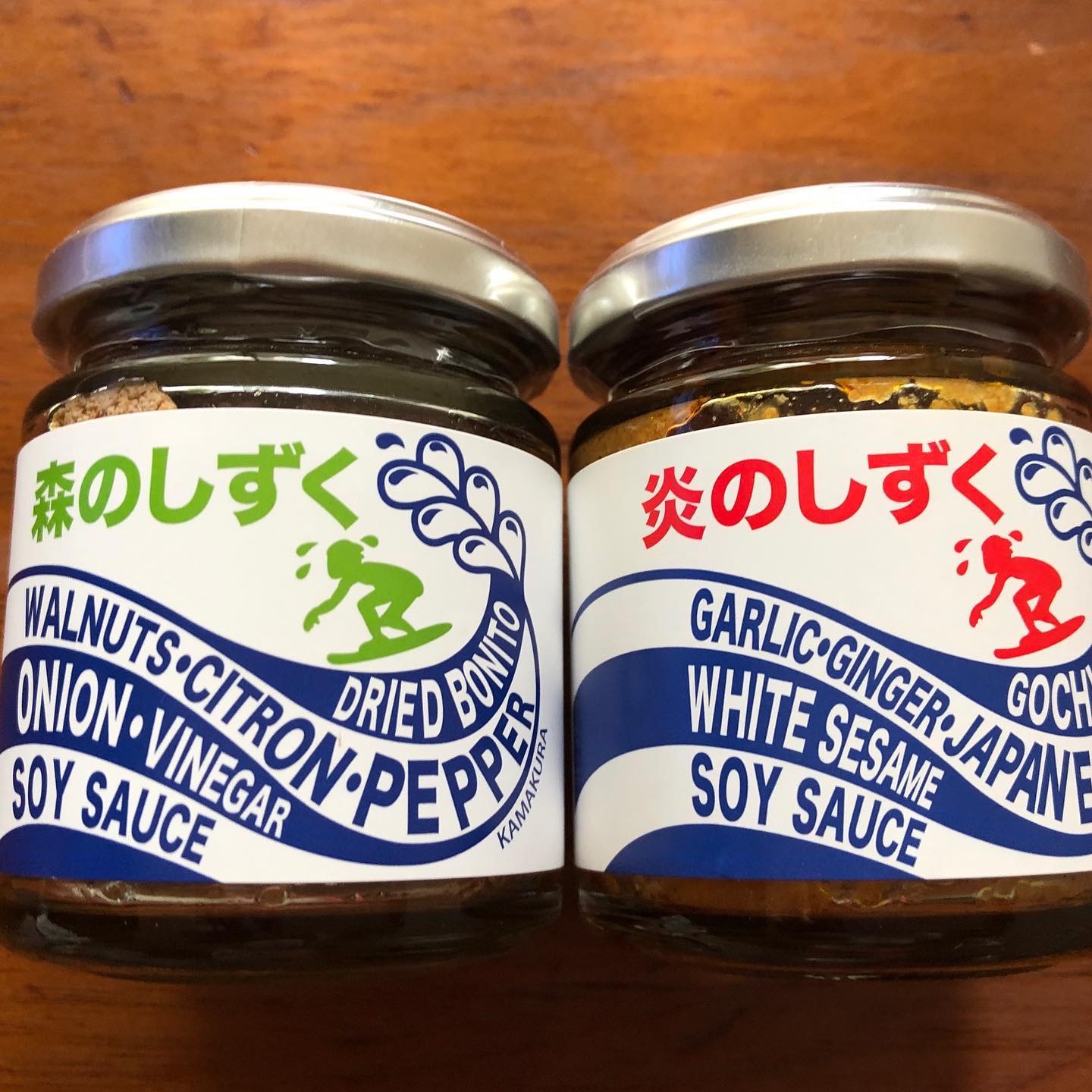 オリジナル調味料のピリ辛ダレの「炎のしずく」とくるみベースのおかずタレ「森のしずく」です。「炎のしずく」はニンニク、生姜、ネギとたっぷりのゴマに、コチュジャンをベースにしたピリ辛ダレ。しゃぶしゃぶや鍋にはもちろんのこと、ご飯やうどん、豆腐や茹で豚などにはよく合います。蒸し野菜や焼き野菜のトッピングにもおすすめ。「森のしずく」は、くるみをベースに鰹節で旨味を加え、柚子胡椒でスッキリした味わい。豆腐やごはんのトッピングやおにぎりの具などごはんのお供として大活躍。どちらも無添加なので安心して楽しめます。