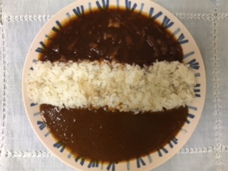 カレーとハヤシライスソースを別々に器に盛ります。ご飯はソ-スがかけられるぐらいの器に別に盛ります。ご飯の上に2種類のソ-スをかけて混ぜずにお召し上がりください。
