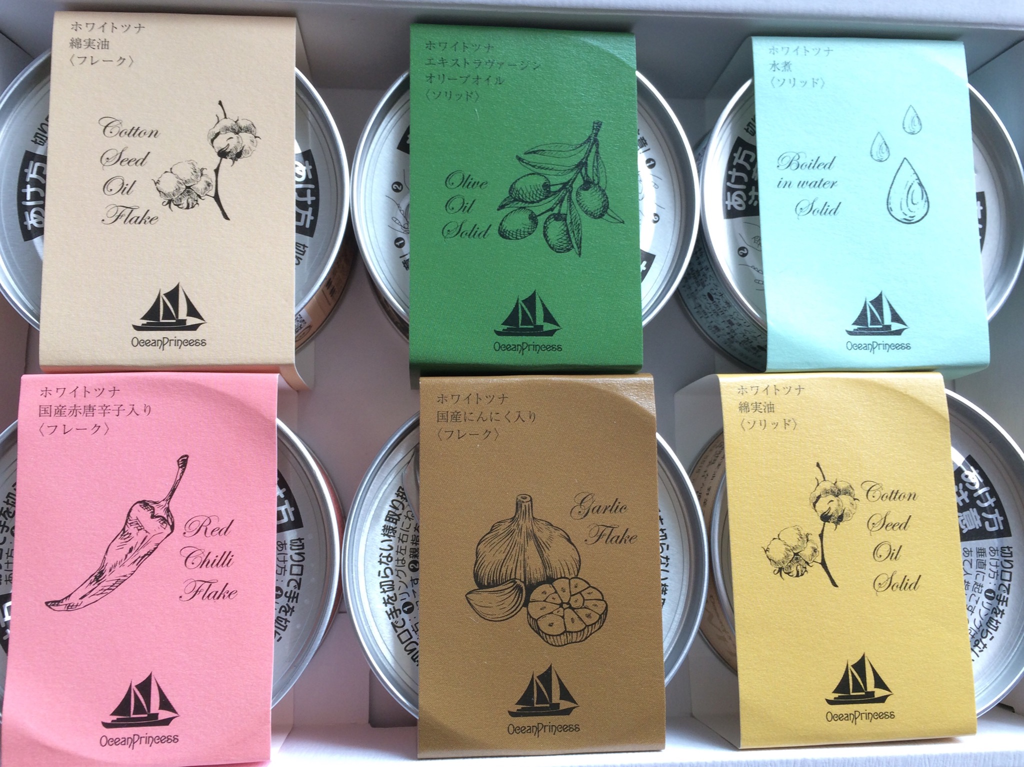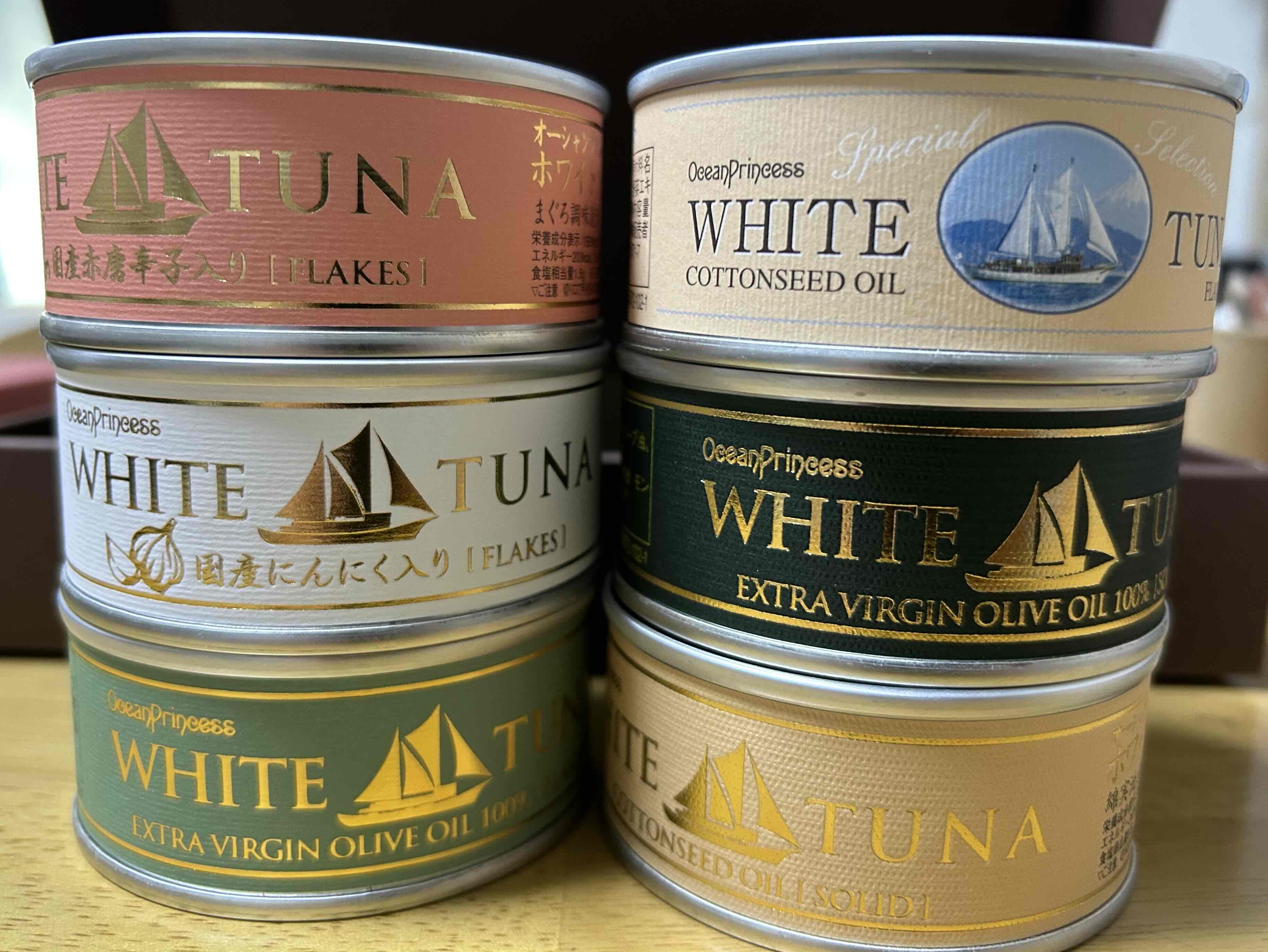 三陸沖水揚げの一本釣りの夏びん長まぐろのツナ缶で、塊りタイプのソリッド・フレーク。オリーブオイル・綿実油。国産赤唐辛子入り。国産にんにく入り。の6種類入っています。