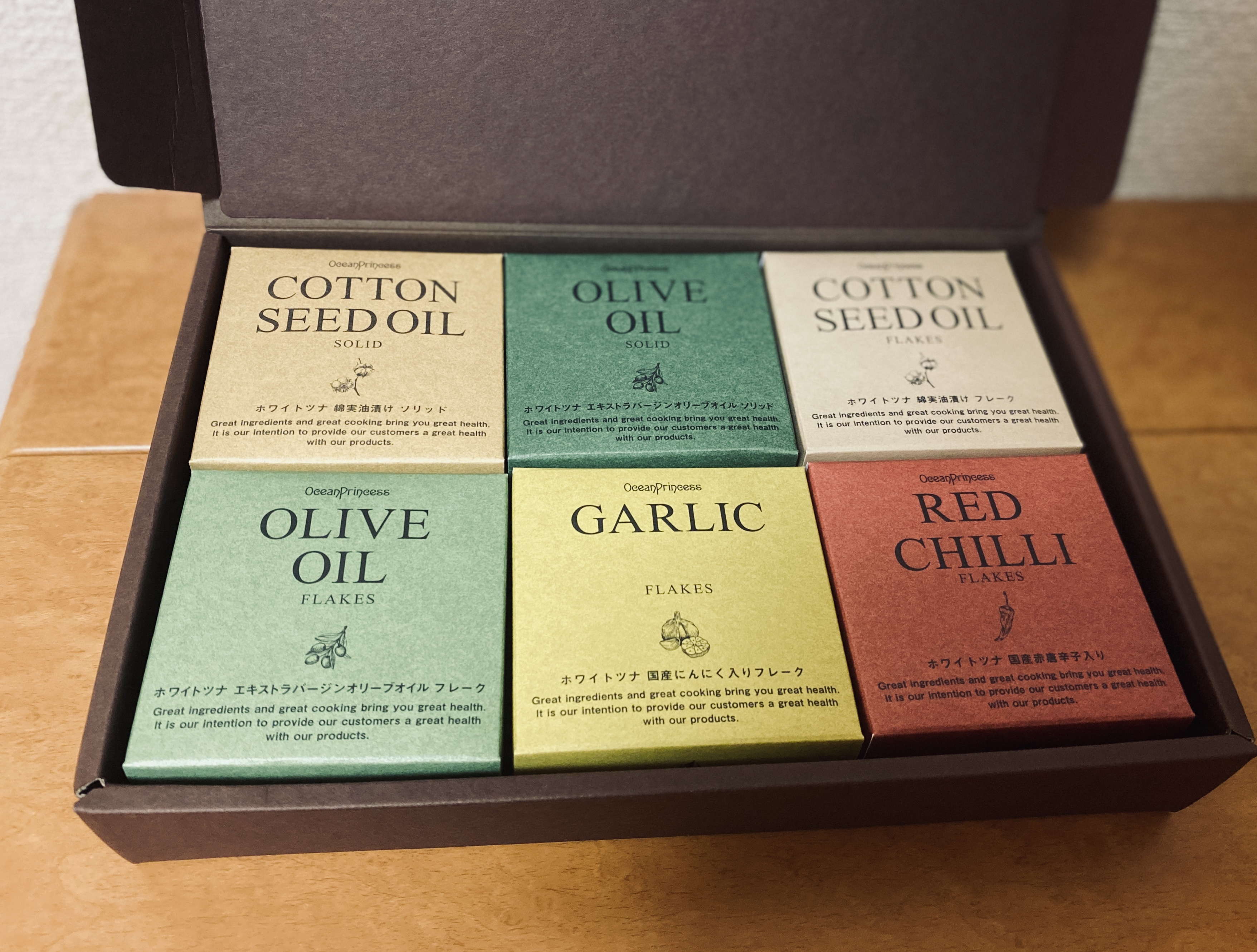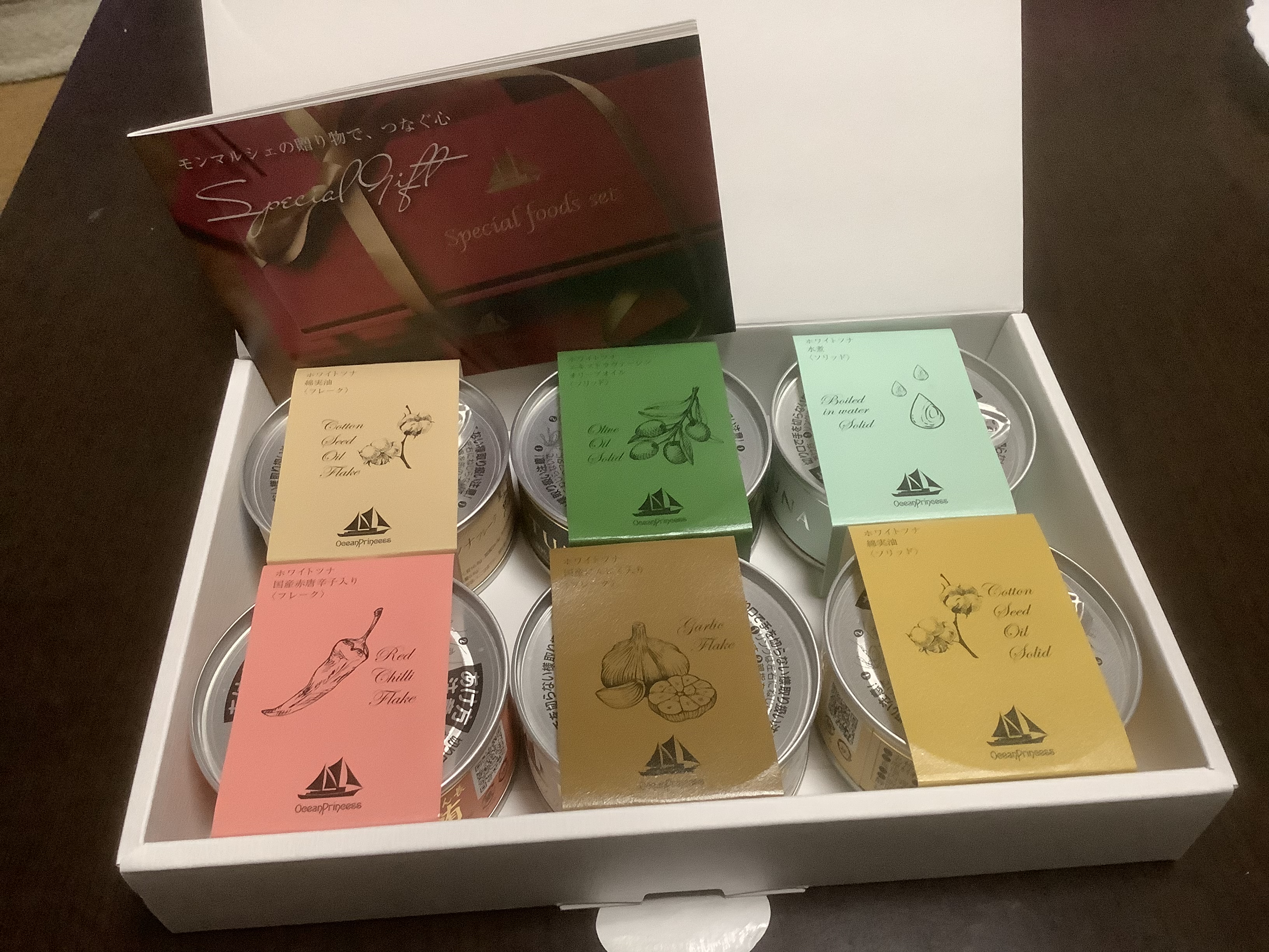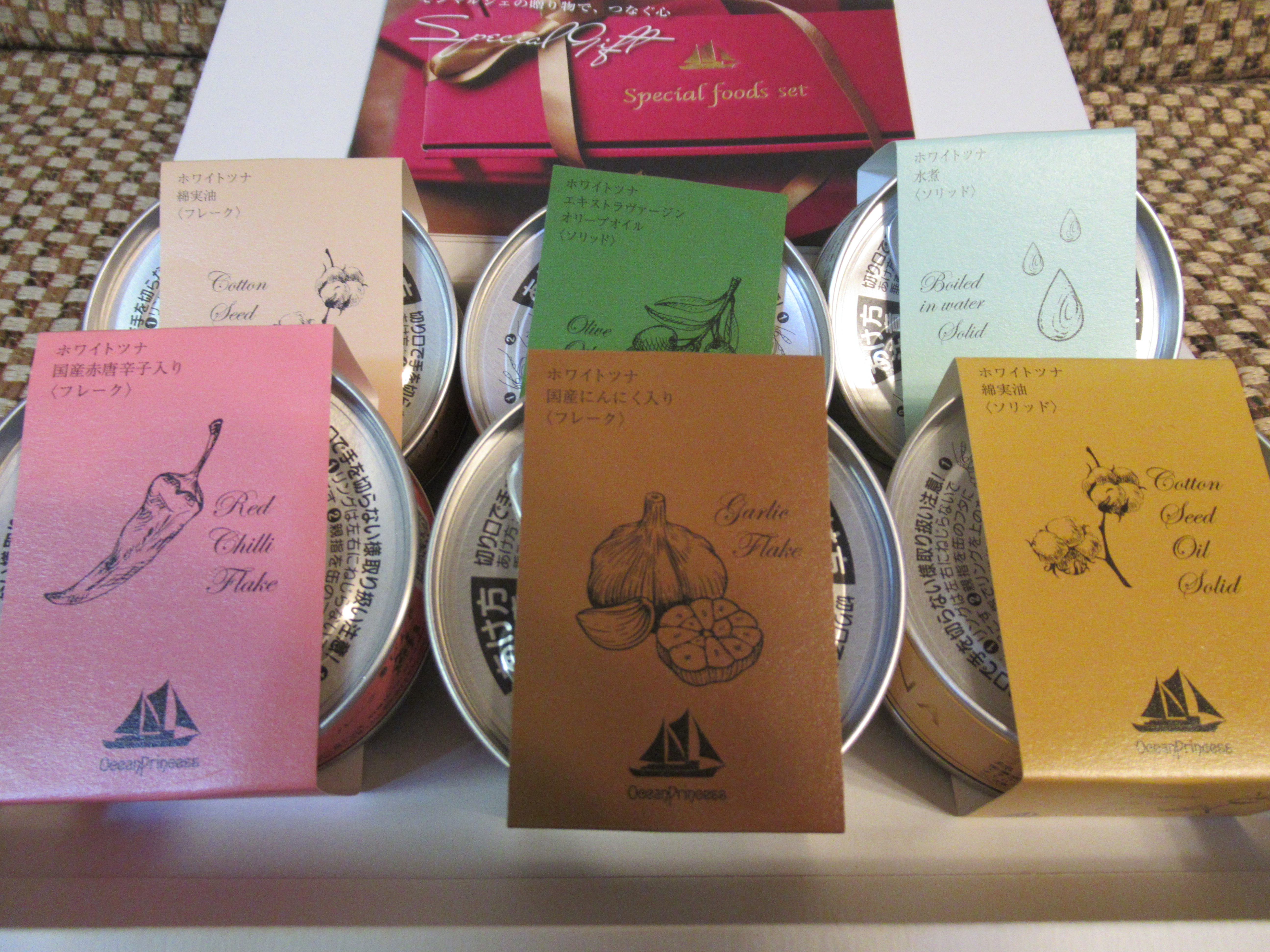 箱を開けると、6種類のカラフルでおしゃれな箱に1缶ずつツナ缶が入って、並んでいました。ツナ缶のラベルもおしゃれで、高級感があります。