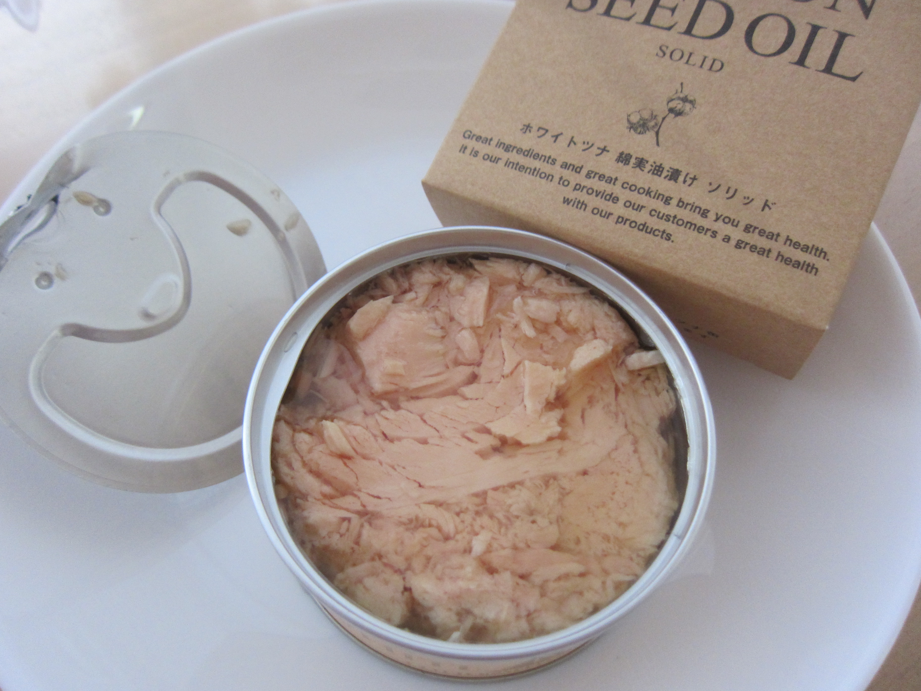 ・綿実油(ソリッド)缶詰いっぱいにぎっしりとまぐろの身の食感を残した塊りの状態で入っていて、丁寧に作業していると思いました。あっさりとした油で、まぐろの旨味を感じました。しっかりとした食感で、満足感があると思いました。