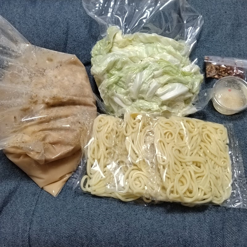 ずっしりと重たい段ボールを開けると、真空パックされたスープ、お野菜、麺、唐辛子、にんにくが入っていました。
