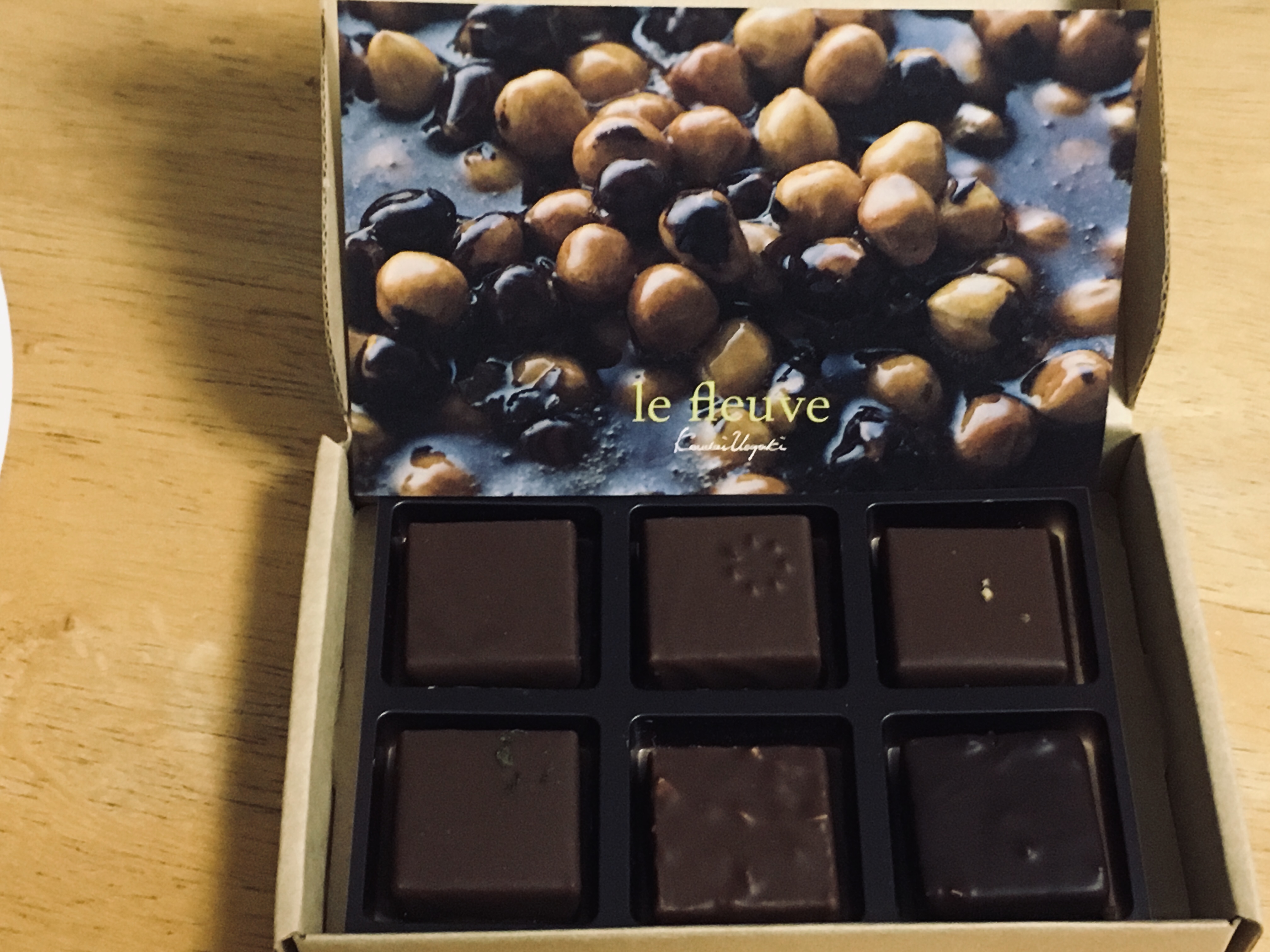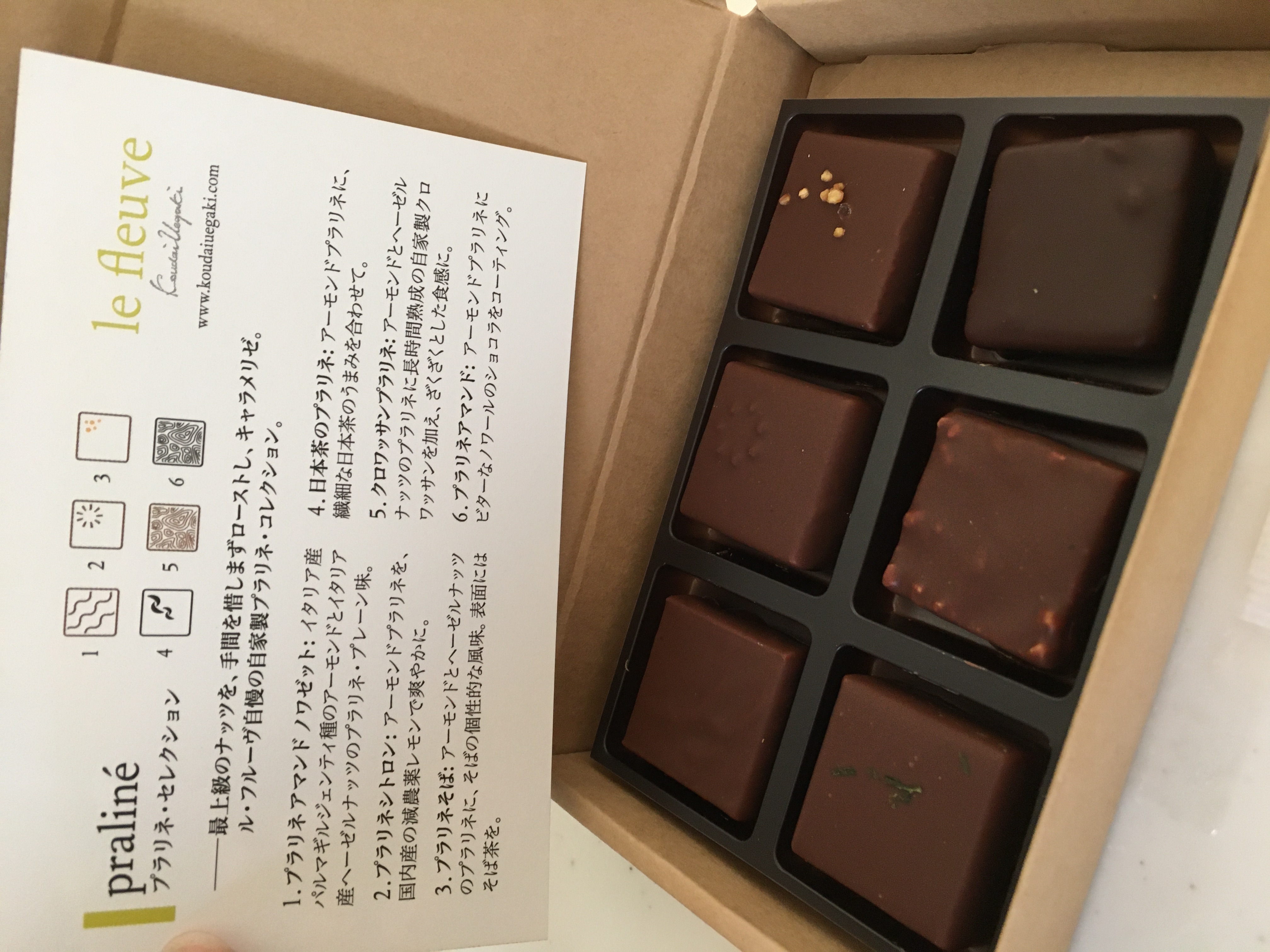 小ぶりの洗練された箱を開けると、繊細なショコラが6個並んでいます。最上級のナッツを、手間を惜しまずローストし、キャラメリゼした薫り高い自家製プラリネを贅沢に使った6種類のコレクションボックスとのことです。同封されていた冊子を拝見させていただきましたが、京都伊勢丹のサロン・デュ・ショコラに出店されているそうで、期待が高まります!私は自分へのご褒美に高級ショコラティエでチョコレートを買うくらいチョコレートが好きなので、とっても楽しみです。