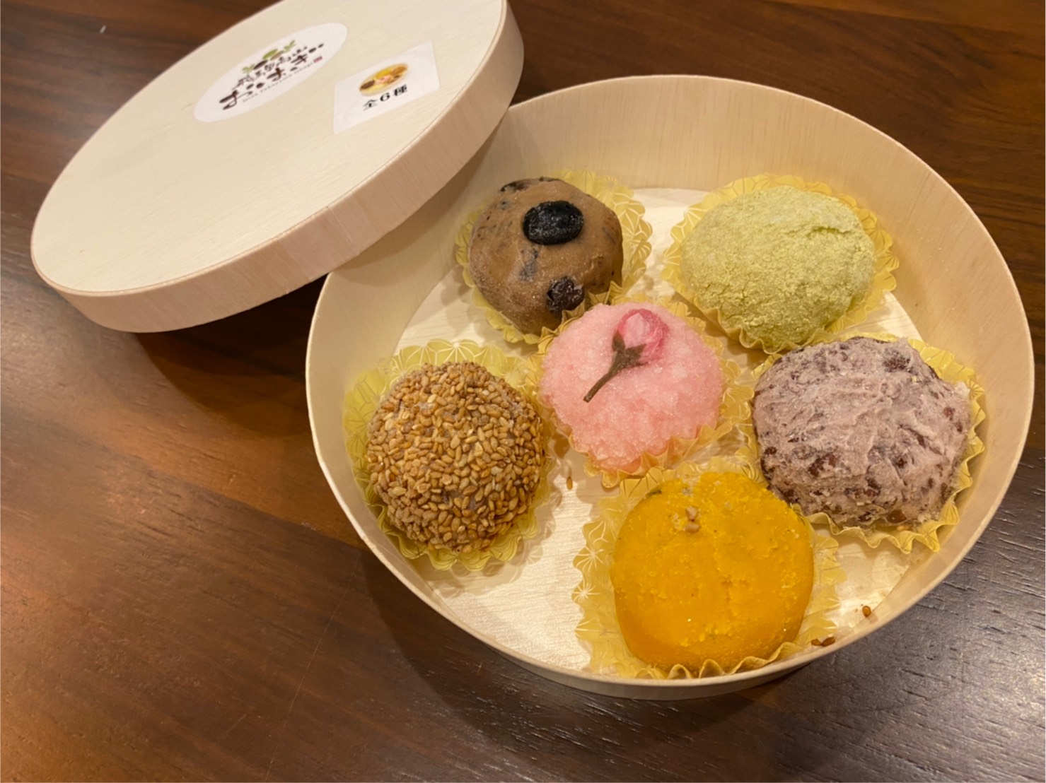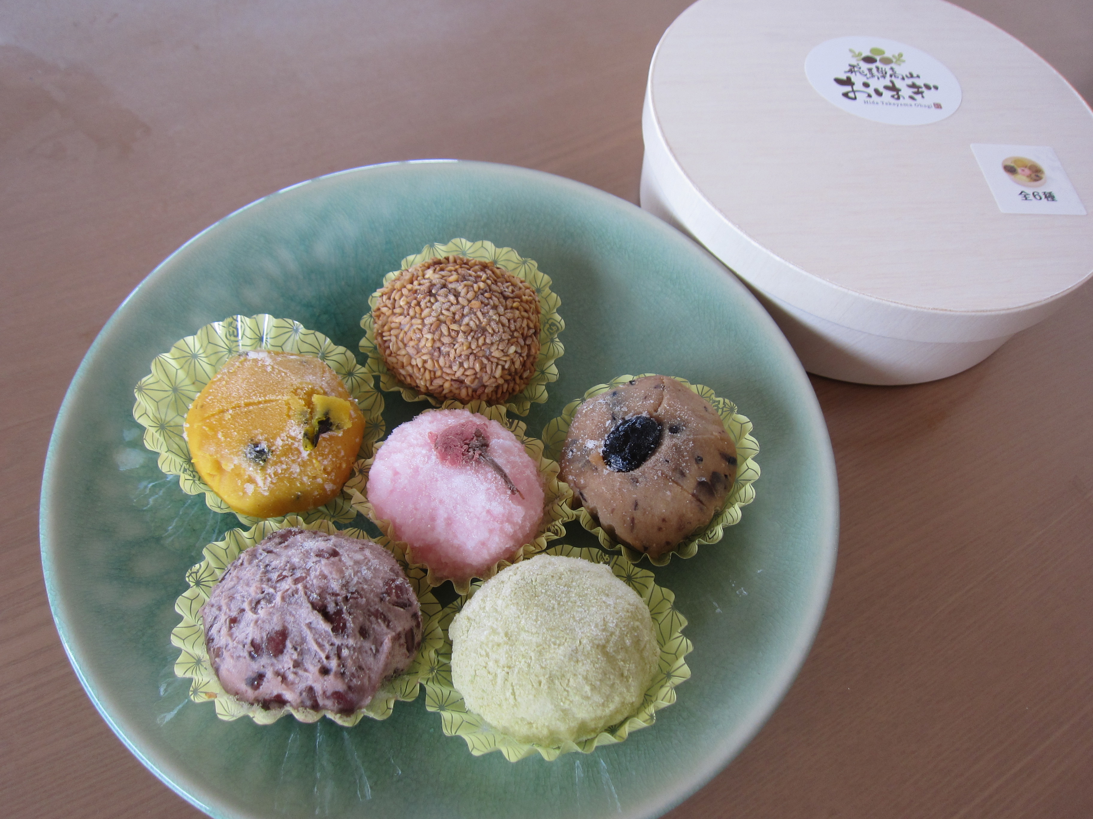 国内製造のあんこを使用したおはぎは、つぶあん、皮付かぼちゃあん、金胡麻つぶあん、黒豆きなこあん、きなこ抹茶あん、桜あんの全6種類のあんこを使った食べやすい40gサイズのおはぎを用意致しました。この小さなおはぎたちにも「高山もち」を使い弊社の製造技術によって飛騨地域外でも販売できるようになりました。寒暖差が生み出す深い甘み、粘り強い餅と飛騨の清水があわさり上品な味に仕上がりました。もちろん餅部分に砂糖は使用せず「高山もち」本来の味を堪能頂けます。