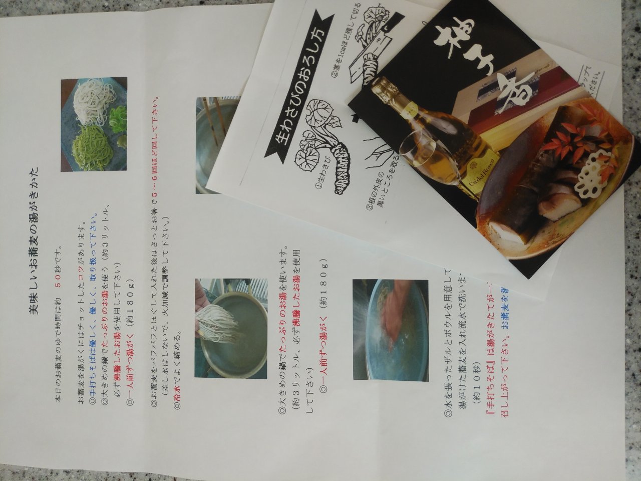 そして写真や絵付きの美味しいお蕎麦の湯がき方と生わさびのおろし方の説明書きが入っていました。