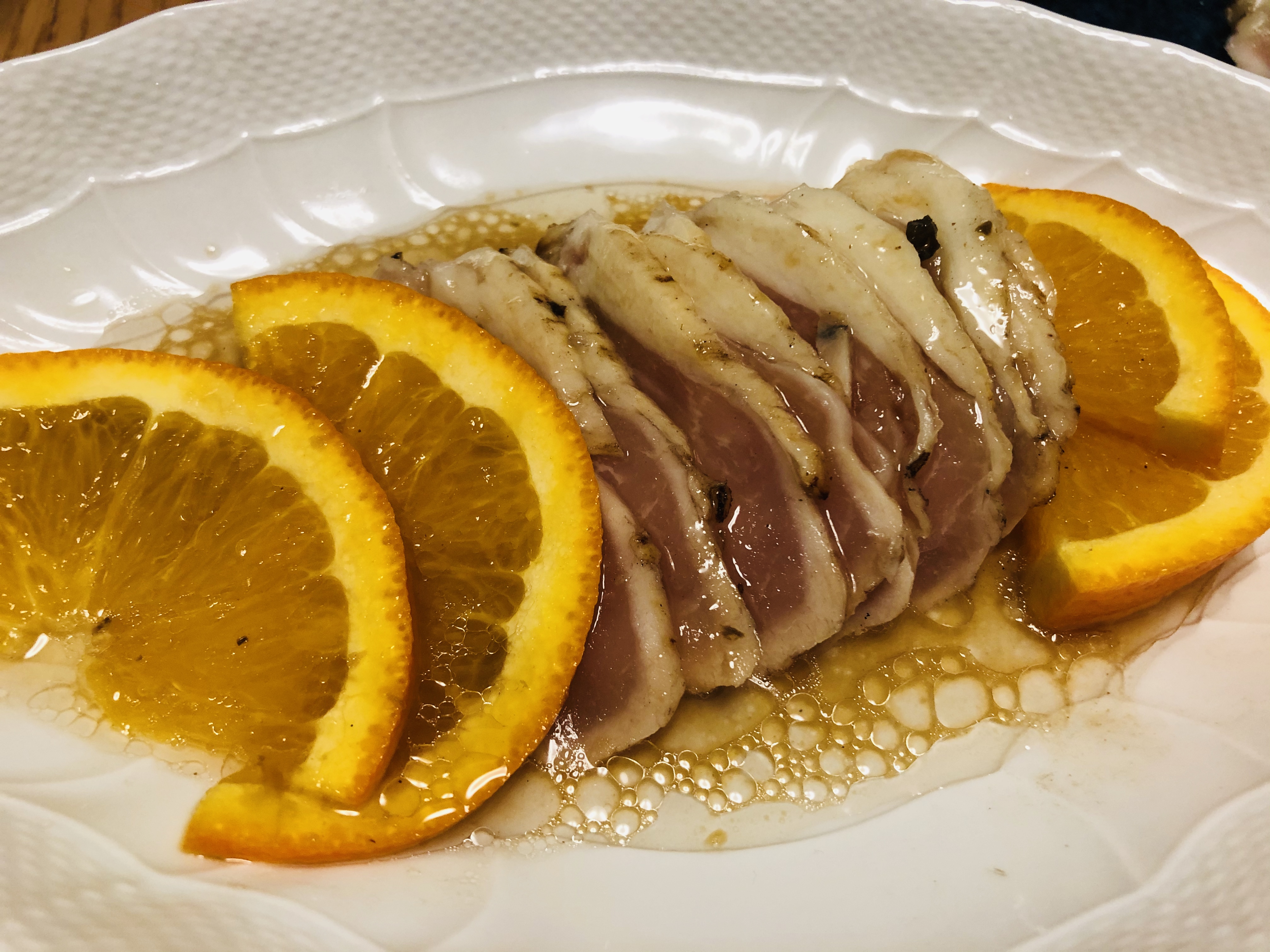 また、量が多めのため半分はおすすめのカルパッチョ風にしてドレッシングをかけ、更にはオレンジのスライスを添えました。