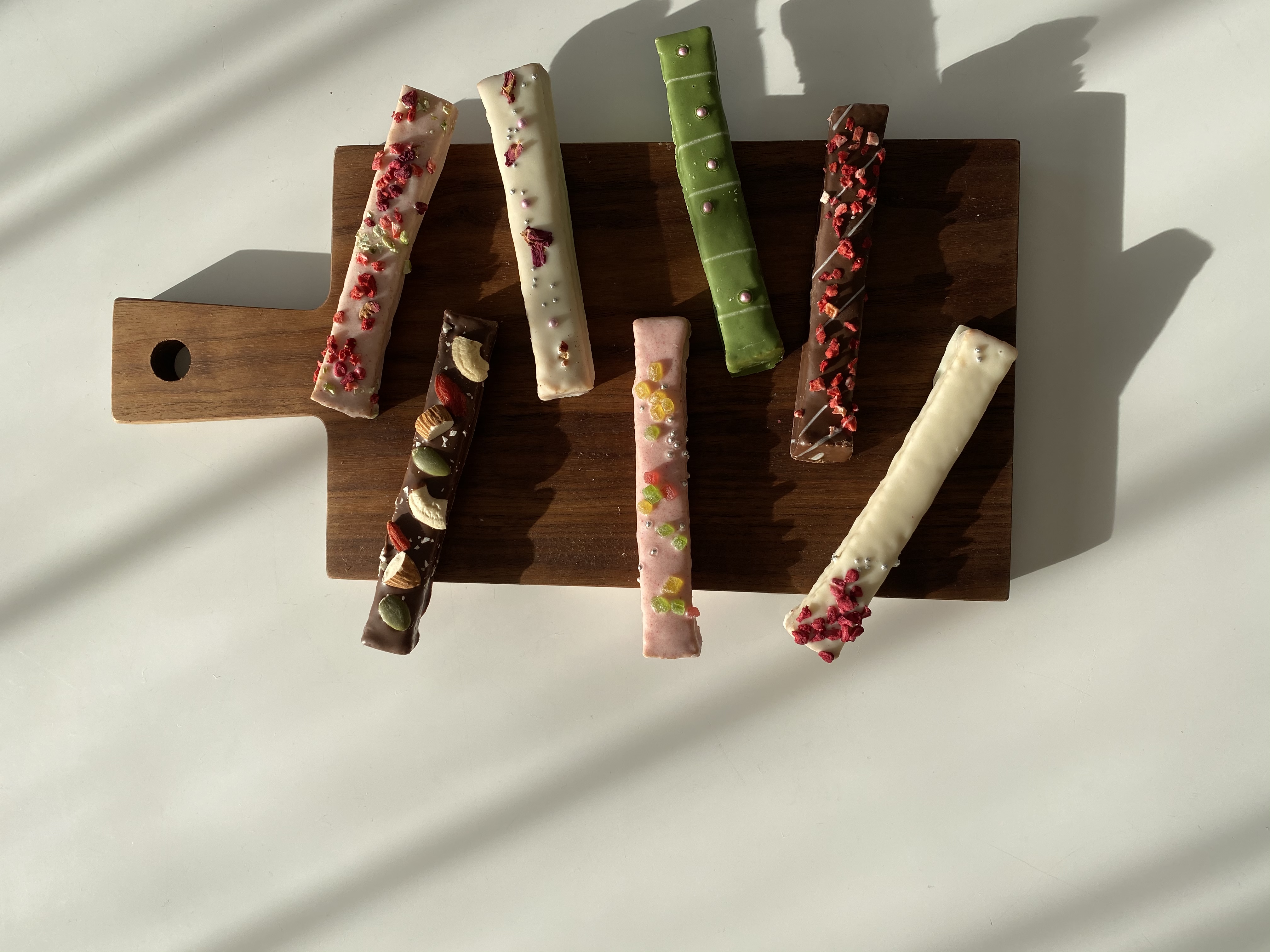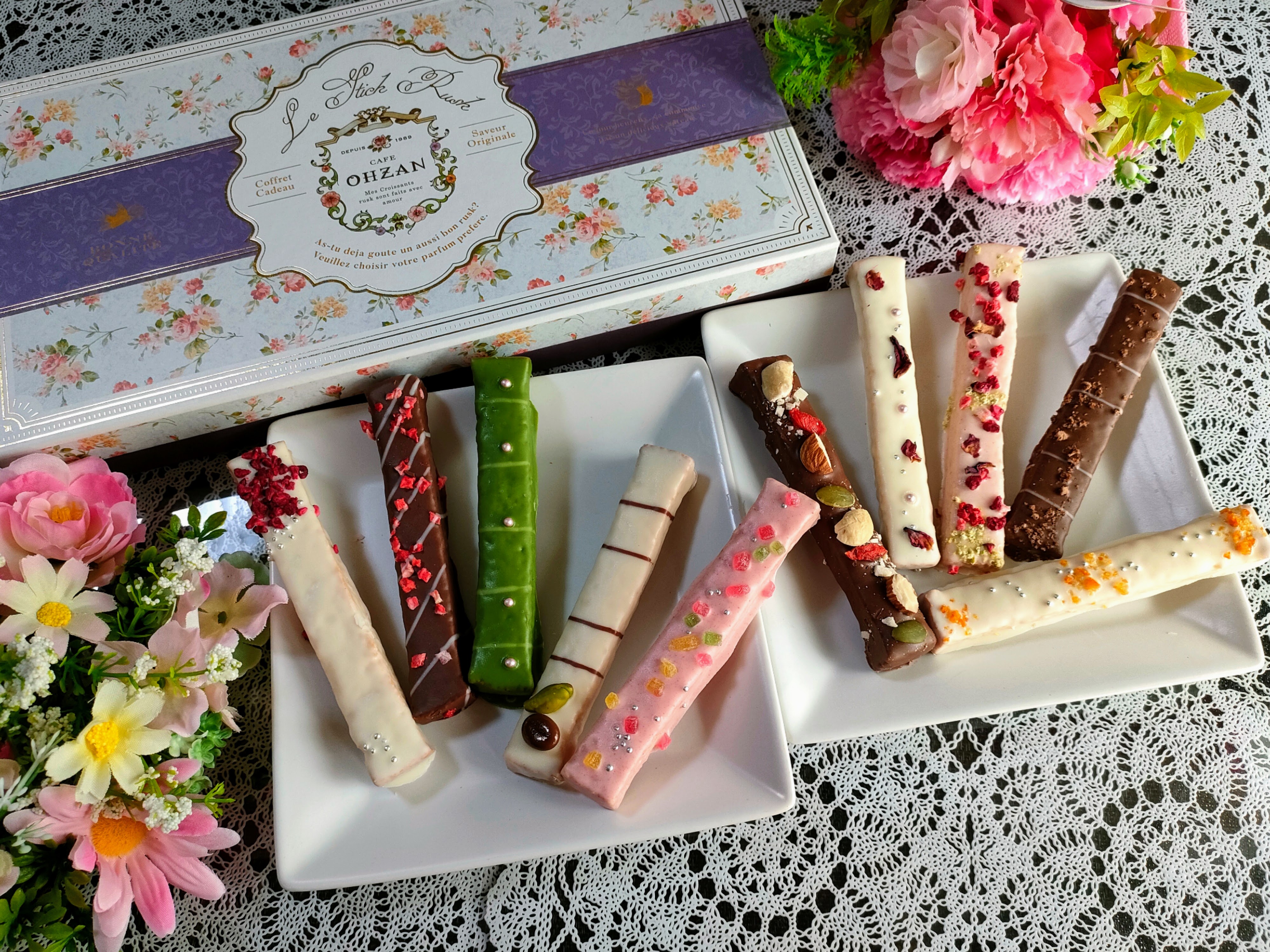ポップなトッピングと、色とりどりのチョコレートでコーディングされた「スティックタイプのラスク」です。すべて職人の手作業でひとつひとつ大切に作られた宝石のようなスイーツ。パンドゥミーを低温でじっくり焼き上げて、サクサクのスティックラスクに仕上げています。チョコレートコーティングしたスティックラスクに大人可愛いトッピングをあしらっているので、10種類のフレーバーと異なる見た目が楽しい商品。賞味期限も60日もあり、個別包装しているので手土産にもピッタリです。