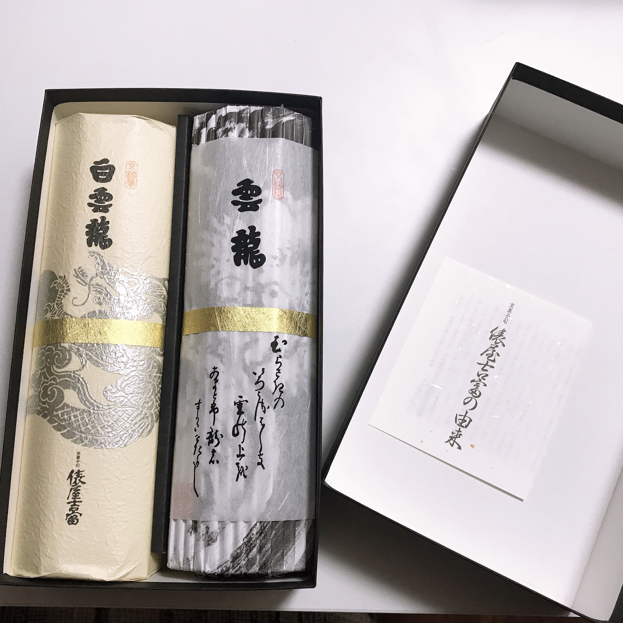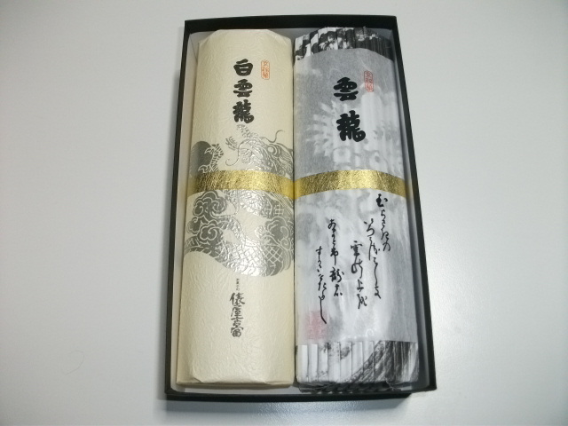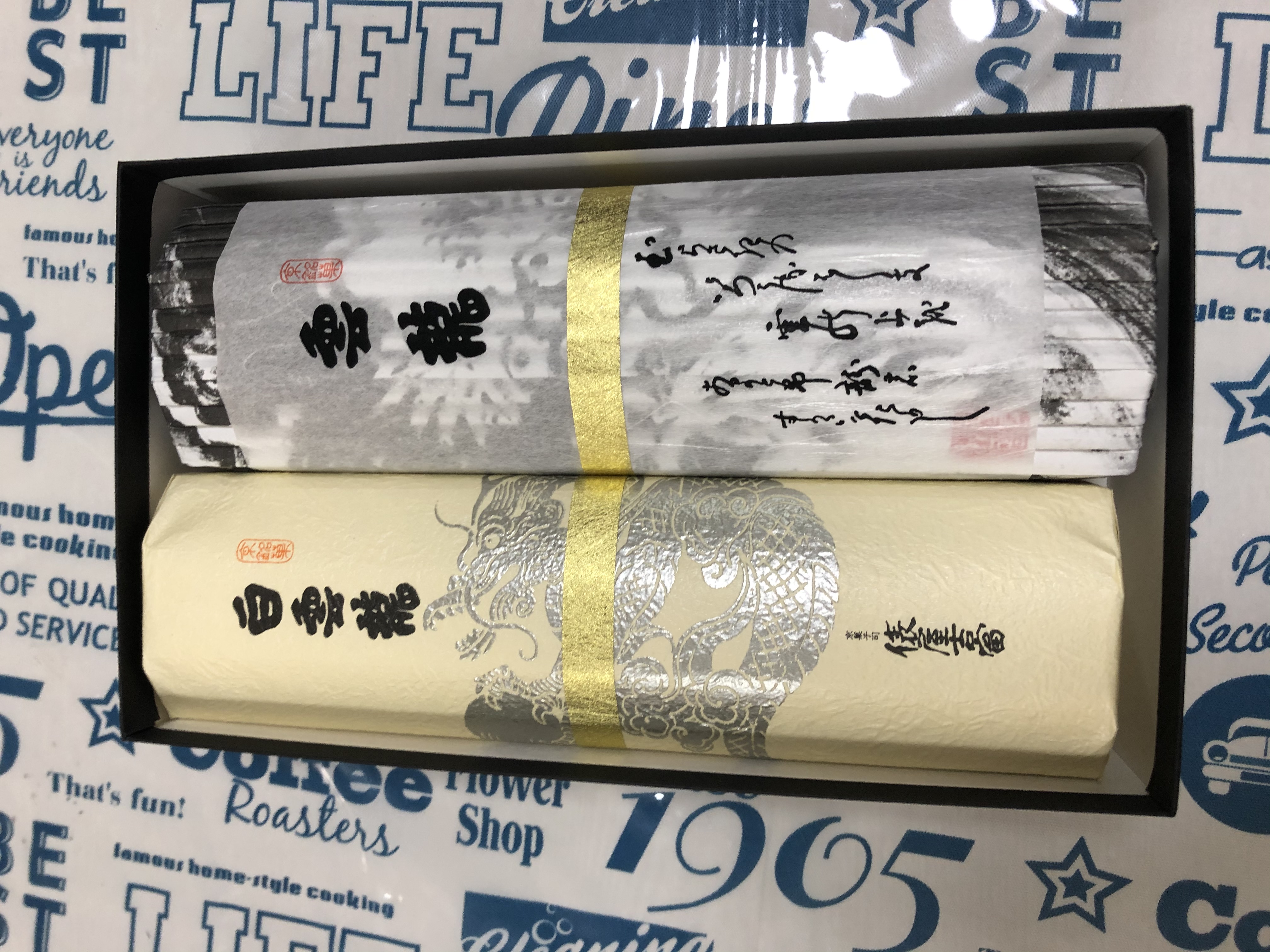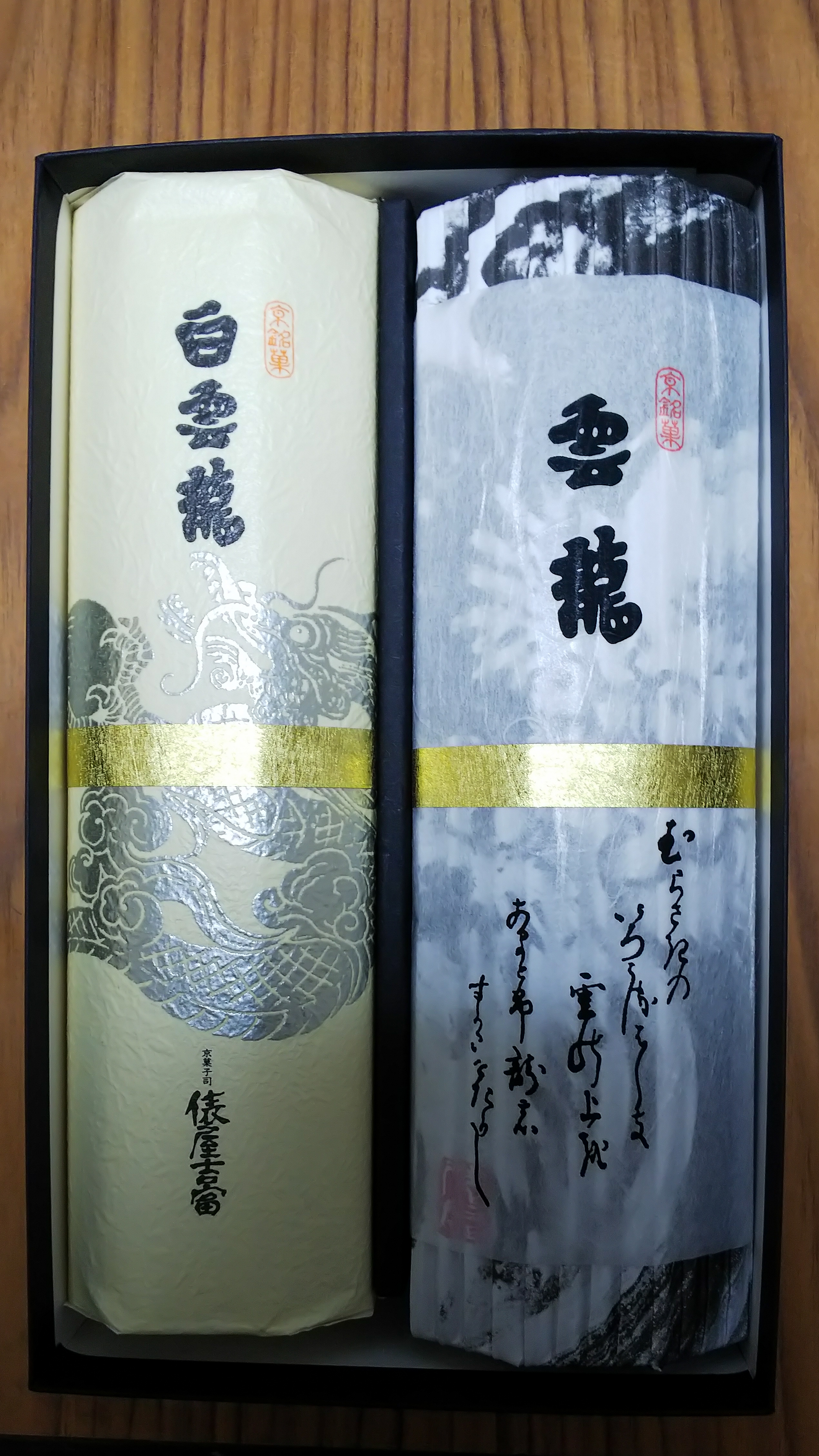 雲龍、白雲龍二つとも包み紙の表紙も美しいのですが、製品を真ん中辺りを切ると雲から龍が現れる所も、菓匠の手仕事のなせる技なんだろうと、まさに芸術品と言っても良いと思います。贈答品として、お取り寄せ品としても、どちらも良いように思います。歴史を感じながら、驚きながら楽しめる、京都らしい京菓子でした。