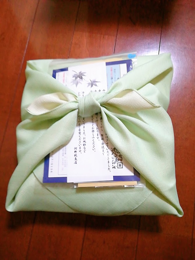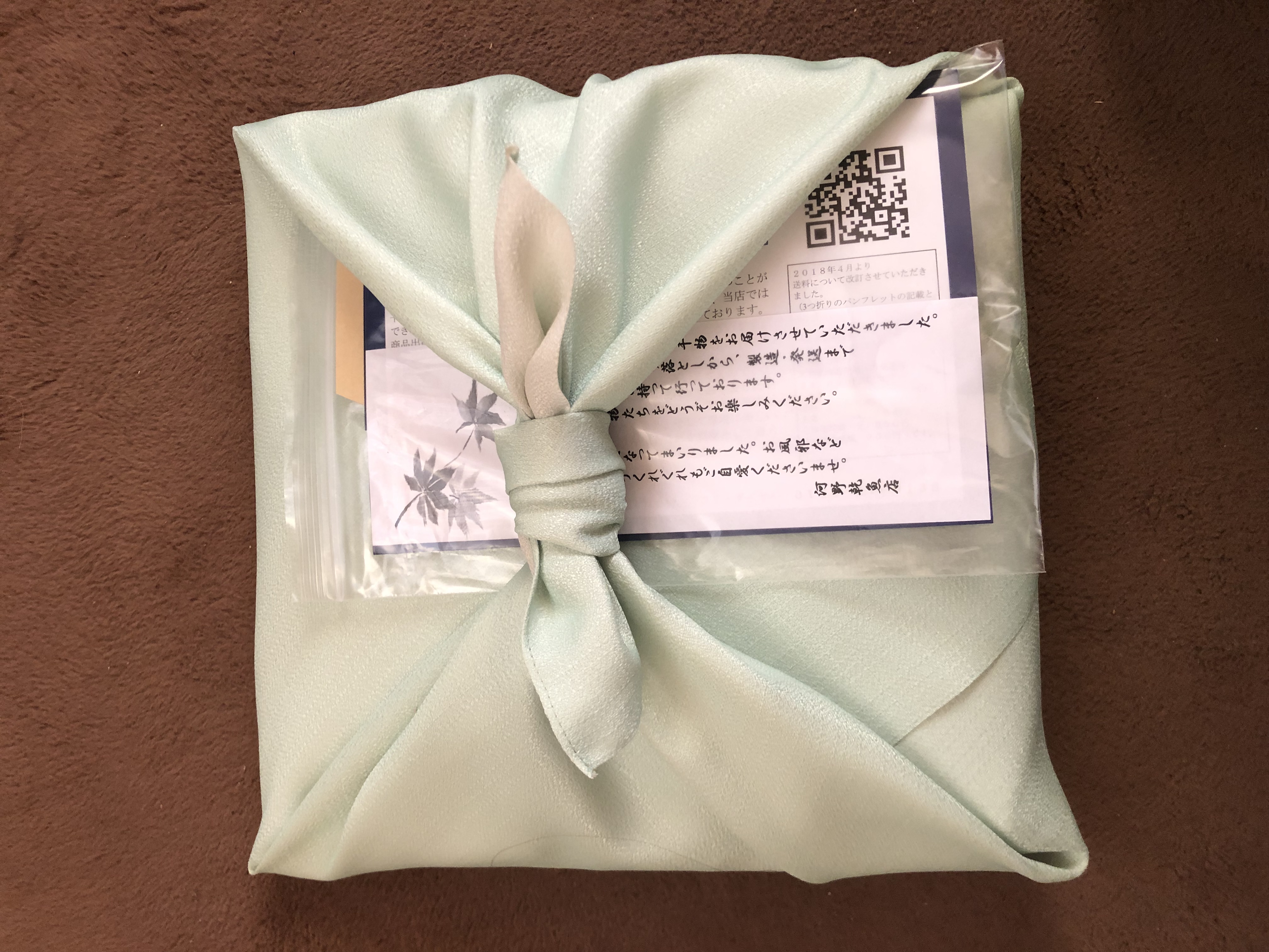 ダンボールを開けると風呂敷に包まれた商品が出てきて、豪華な風呂敷に気分が高まりました。