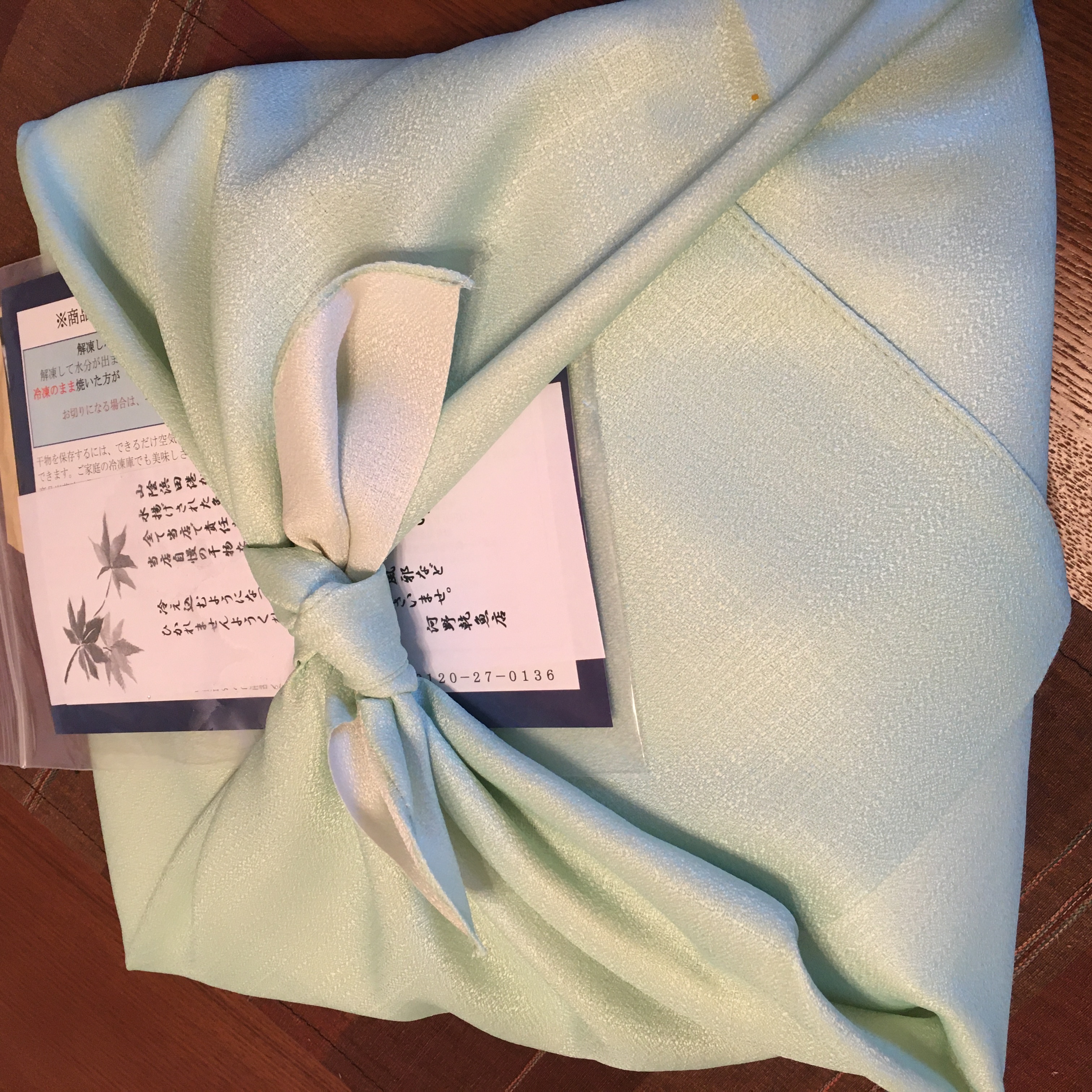 風呂敷を開けると商品が包まれた銀色の梱包材が出てきて、「解凍されていたり全体に霜がびっしりついていたらご連絡ください」と連絡先とともに記載してあり、きちんと冷凍で配送されているかどうかまで気遣いされている様子がわかり、感心しました。