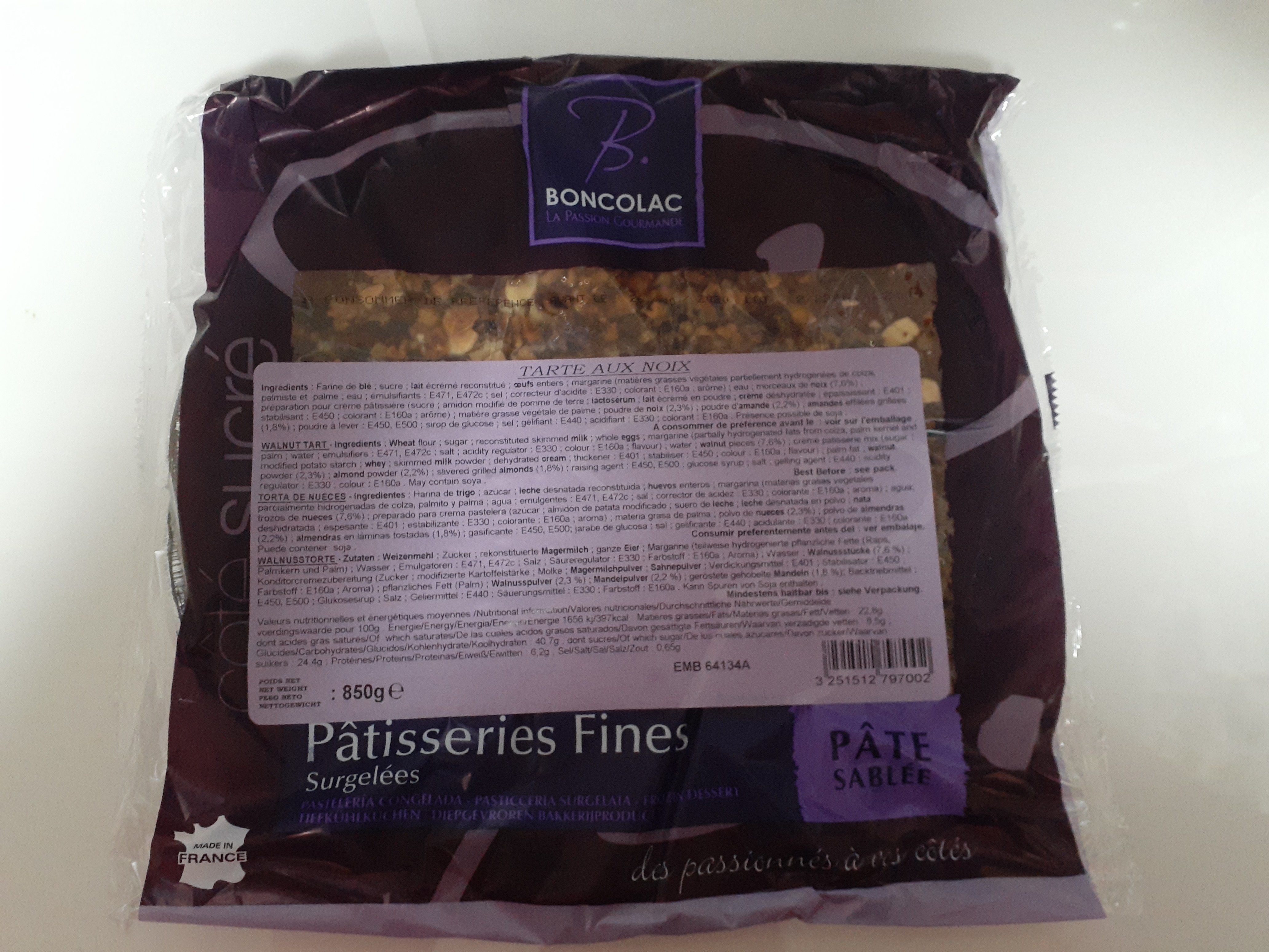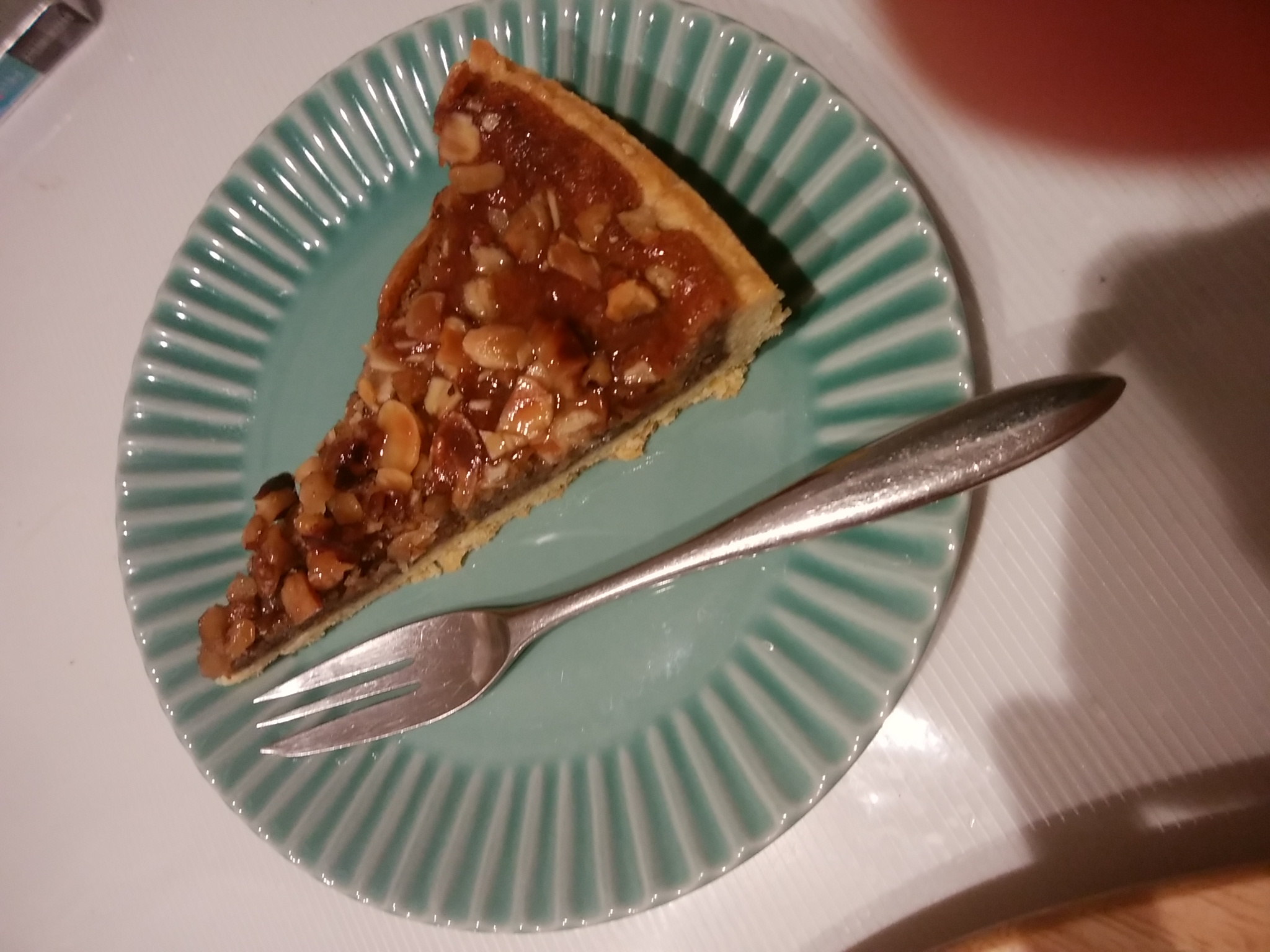 タルトがとてもサクサクしています。その上に、しっとりとした生地があり、表面は、たっぷりのナッツで埋めつくされています。生地は、アーモンドパウダーだけではなく、クルミパウダーも使用している、贅沢な生地です。しかし、くどさは全くなく、あっさりした味わいです。そして、表面にたっぷりとかかっているくるみと、スライスアーモンドが、とても香ばしく、食感もいいです。
