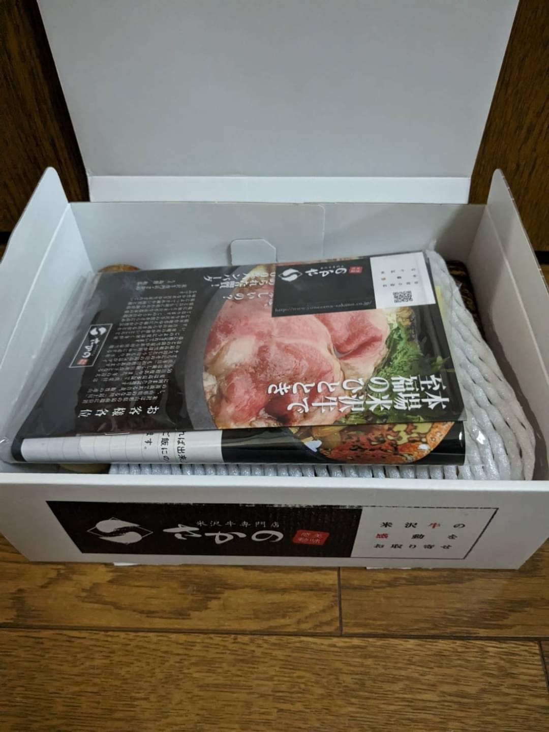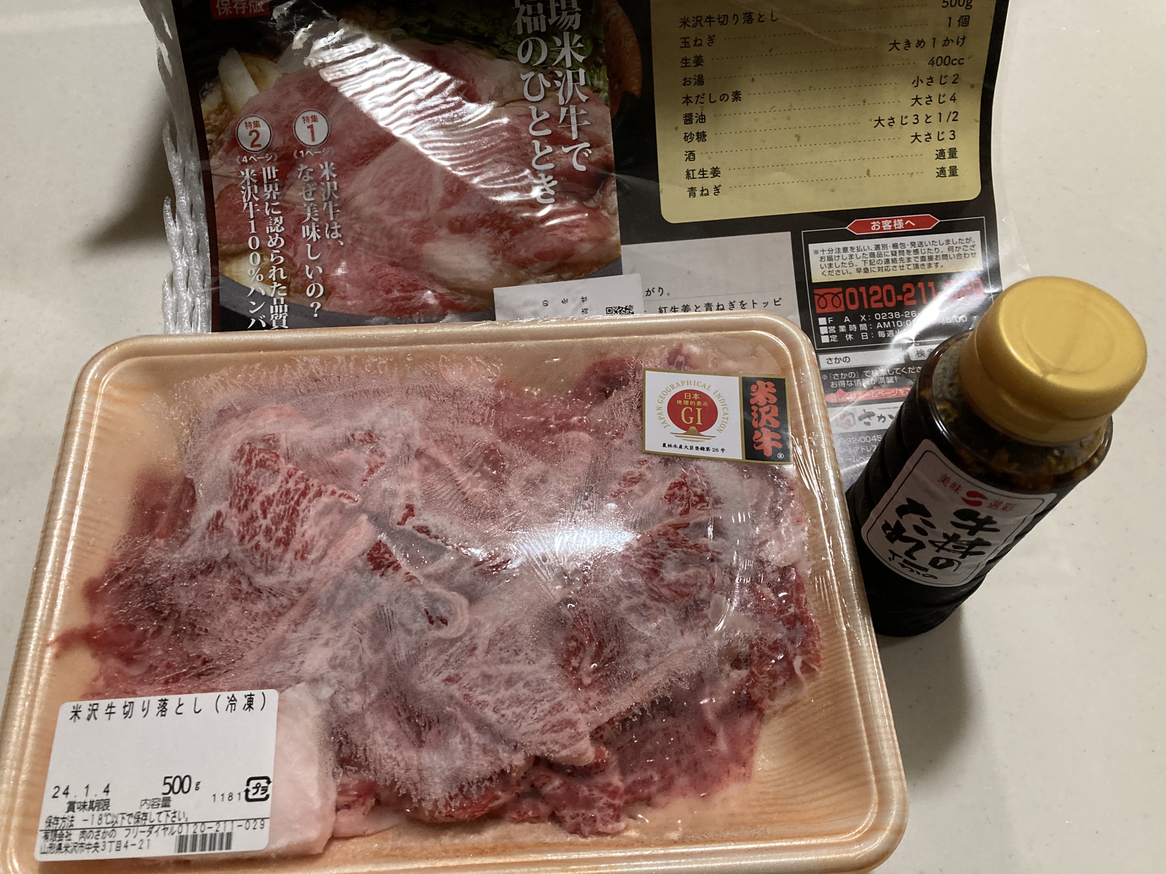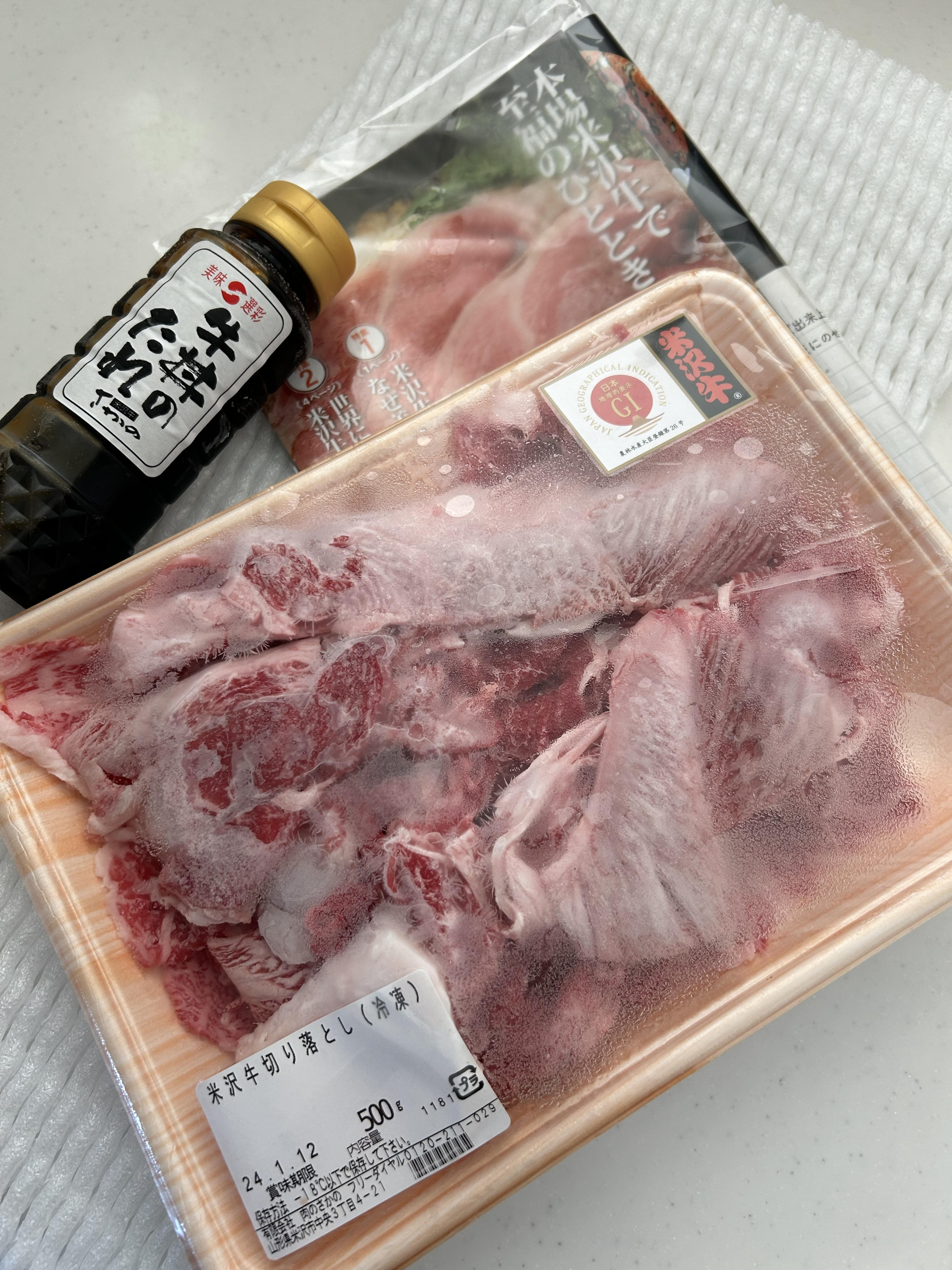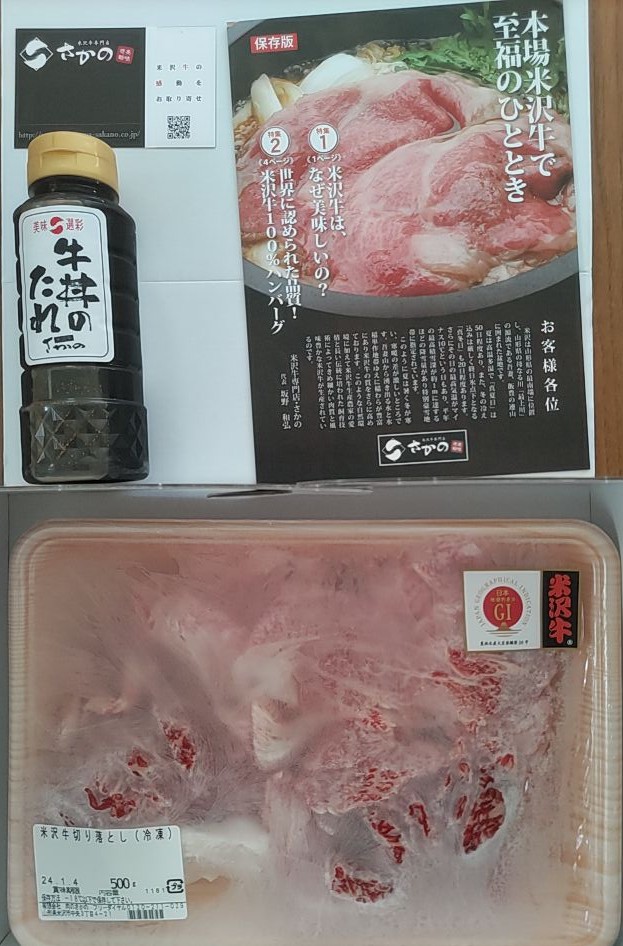 段ボールをあけると、サシが入った見た目から美味しそうな、米沢牛の切り落としがたっぷり500g、牛丼のタレ、レシピやカタログが入っていました。