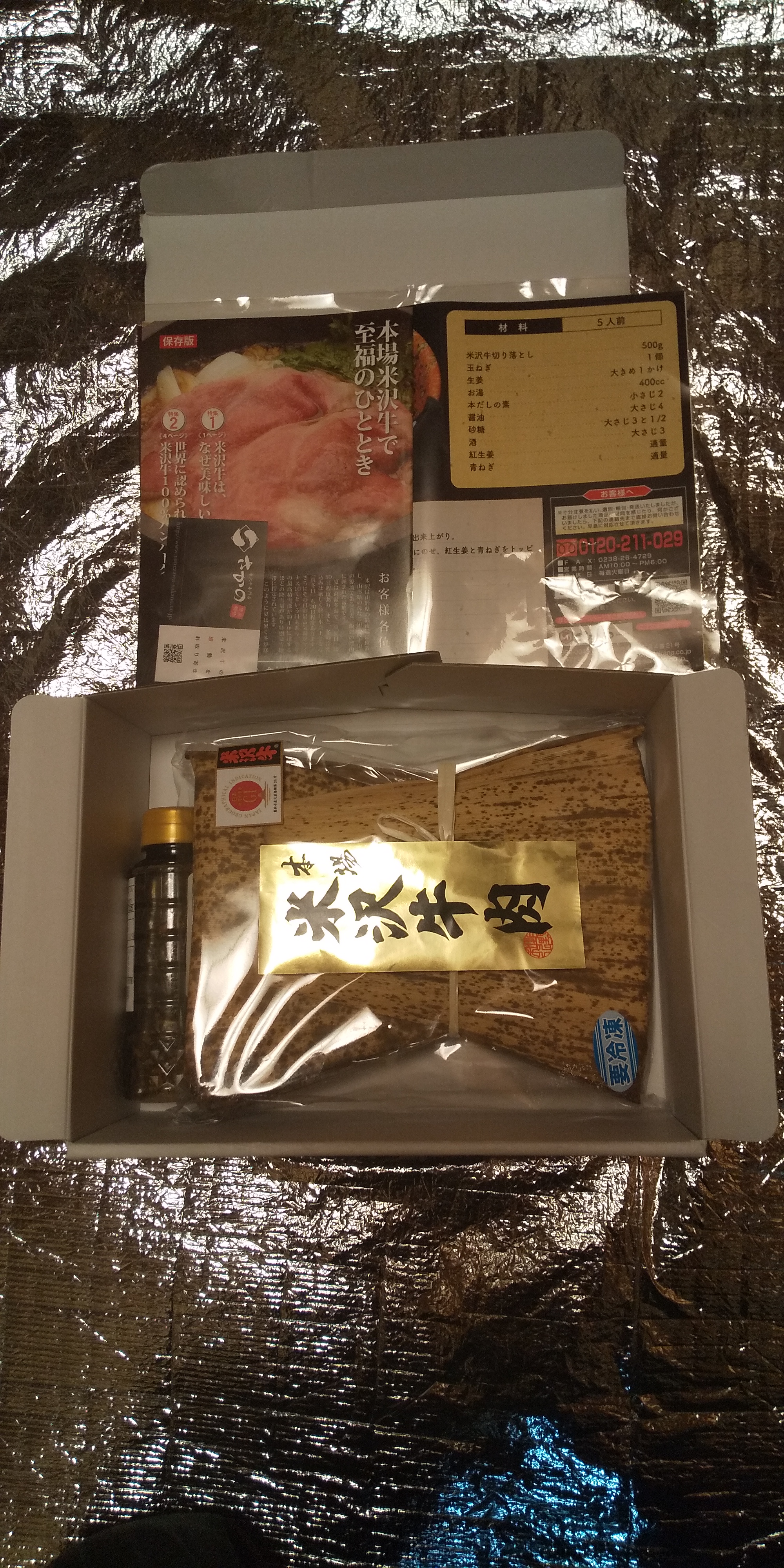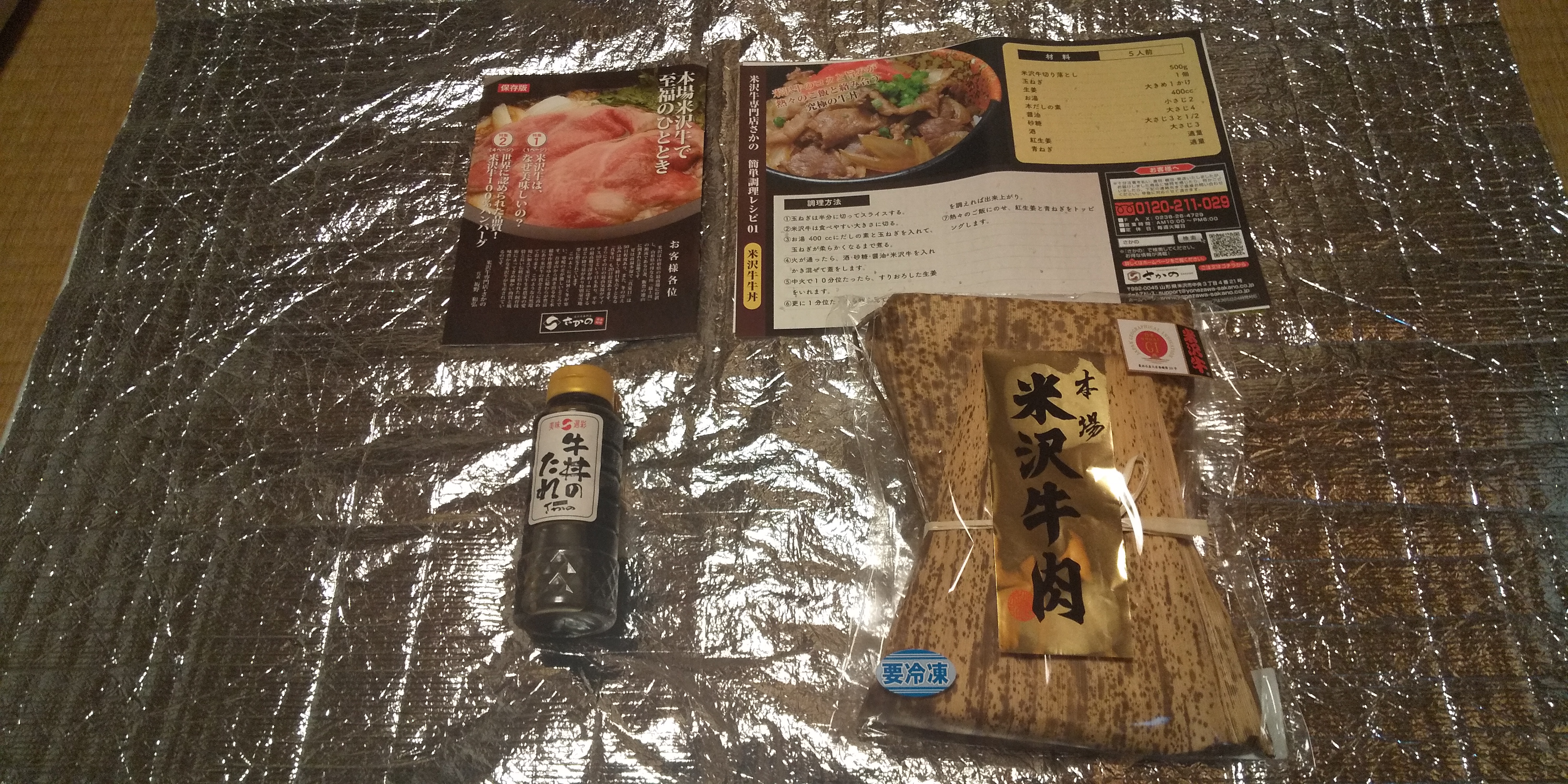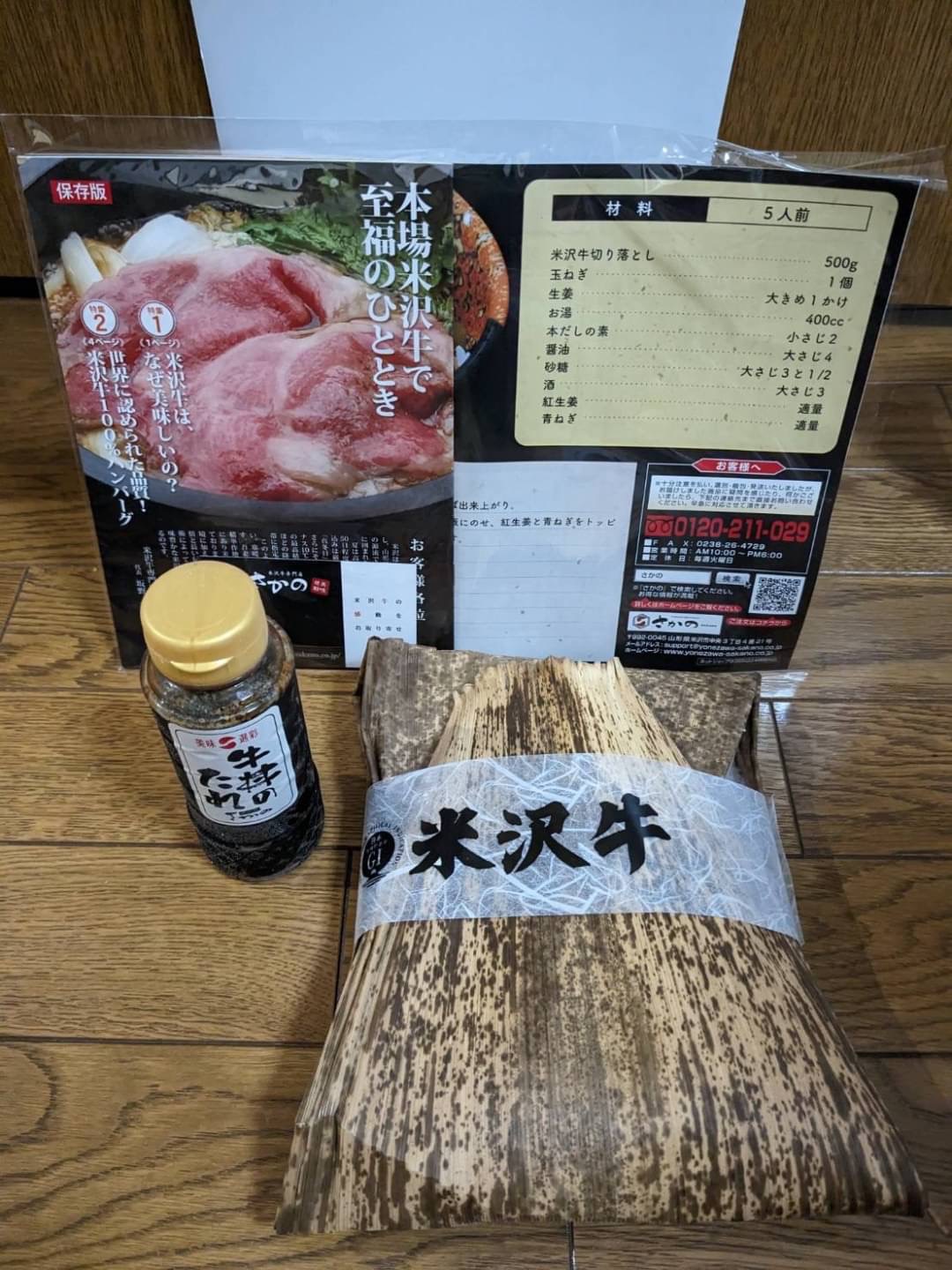 段ボールをあけると、サシが入った見た目から美味しそうな、米沢牛の切り落としがたっぷり500g、牛丼のタレ、レシピやカタログが入っていました。