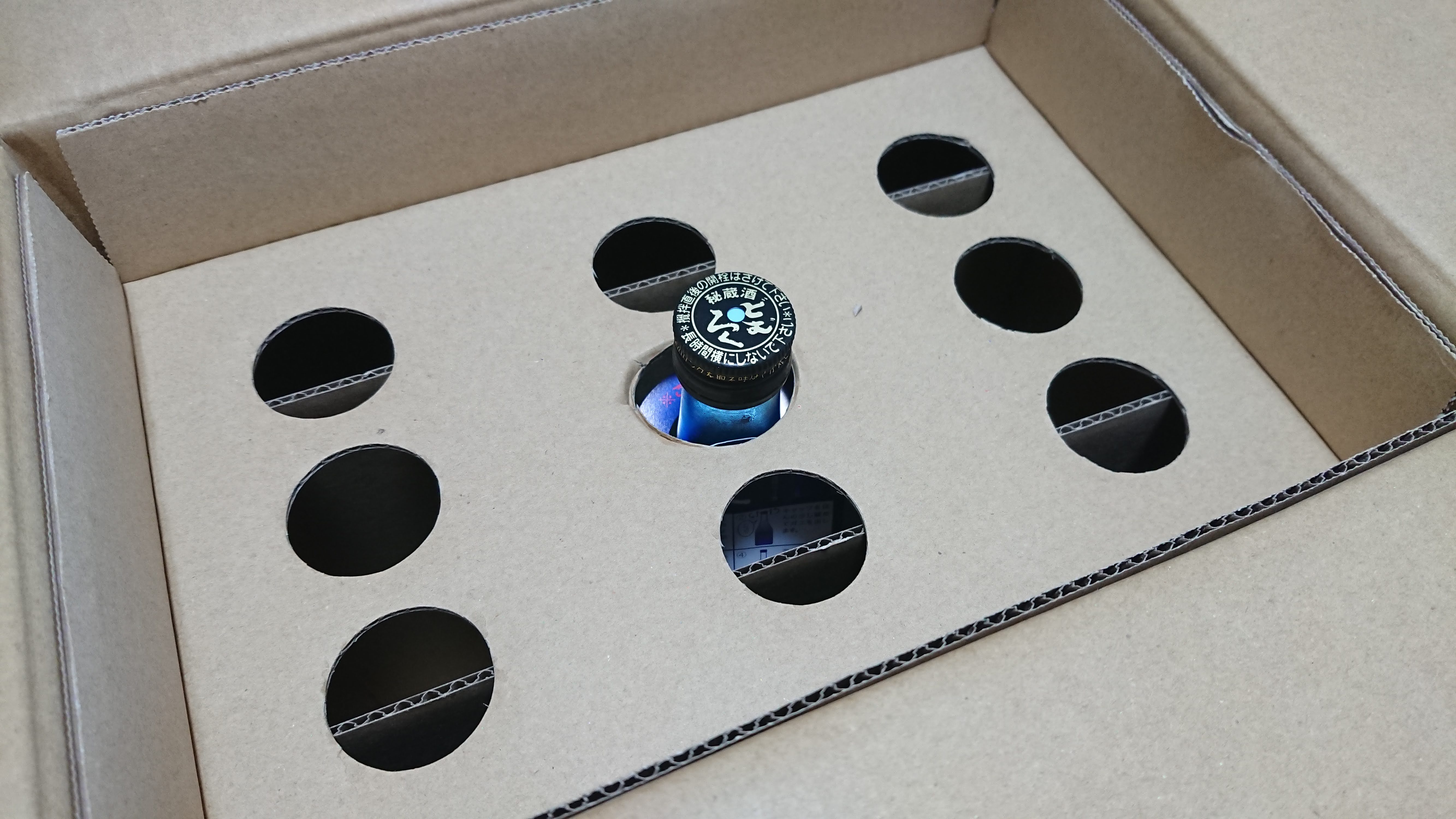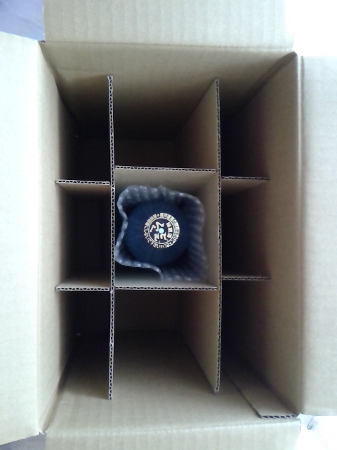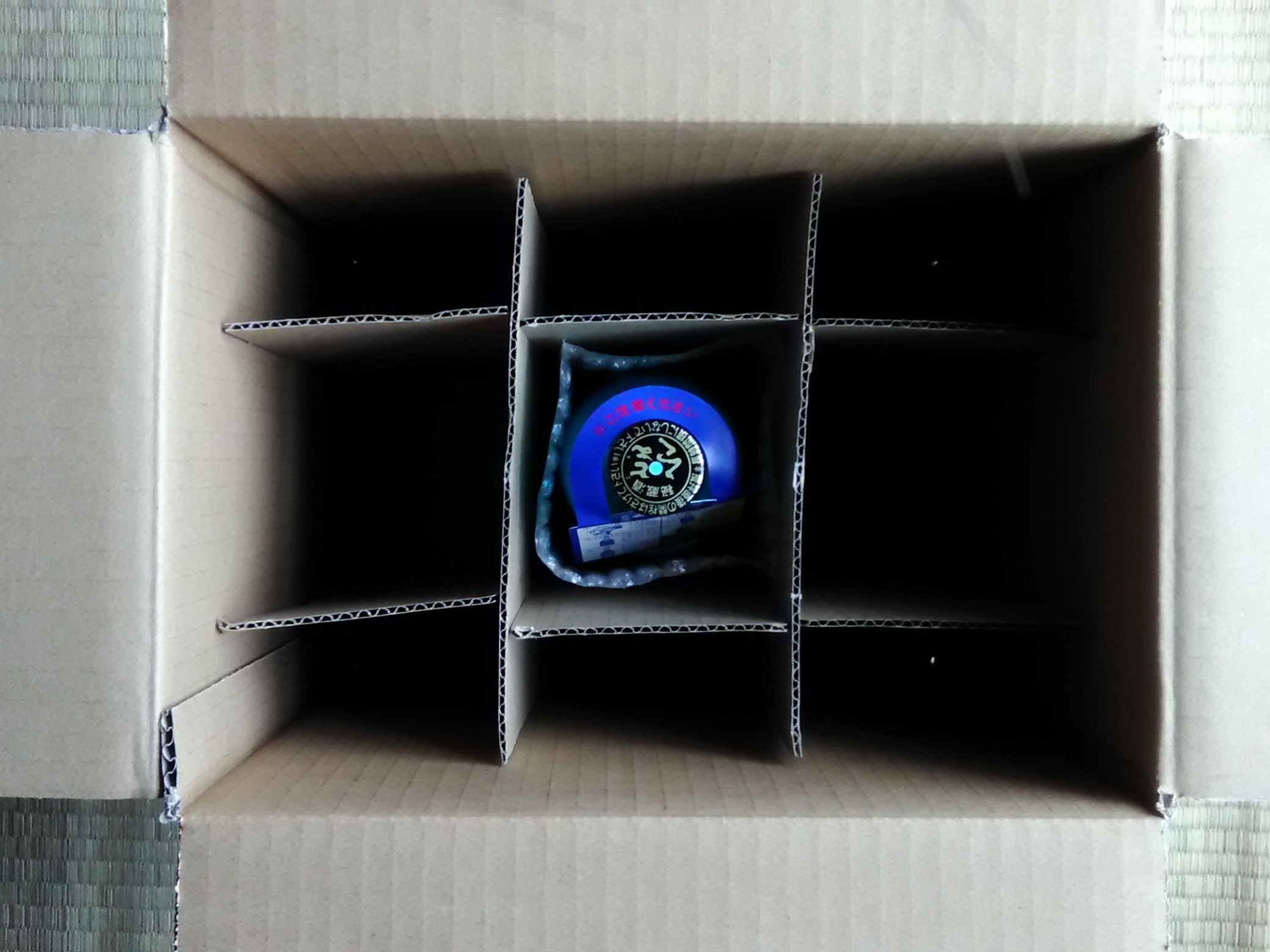 段ボール箱を開けると、中は段ボール紙で9つ仕切られており、その真ん中に一本、酒瓶が入っていました。