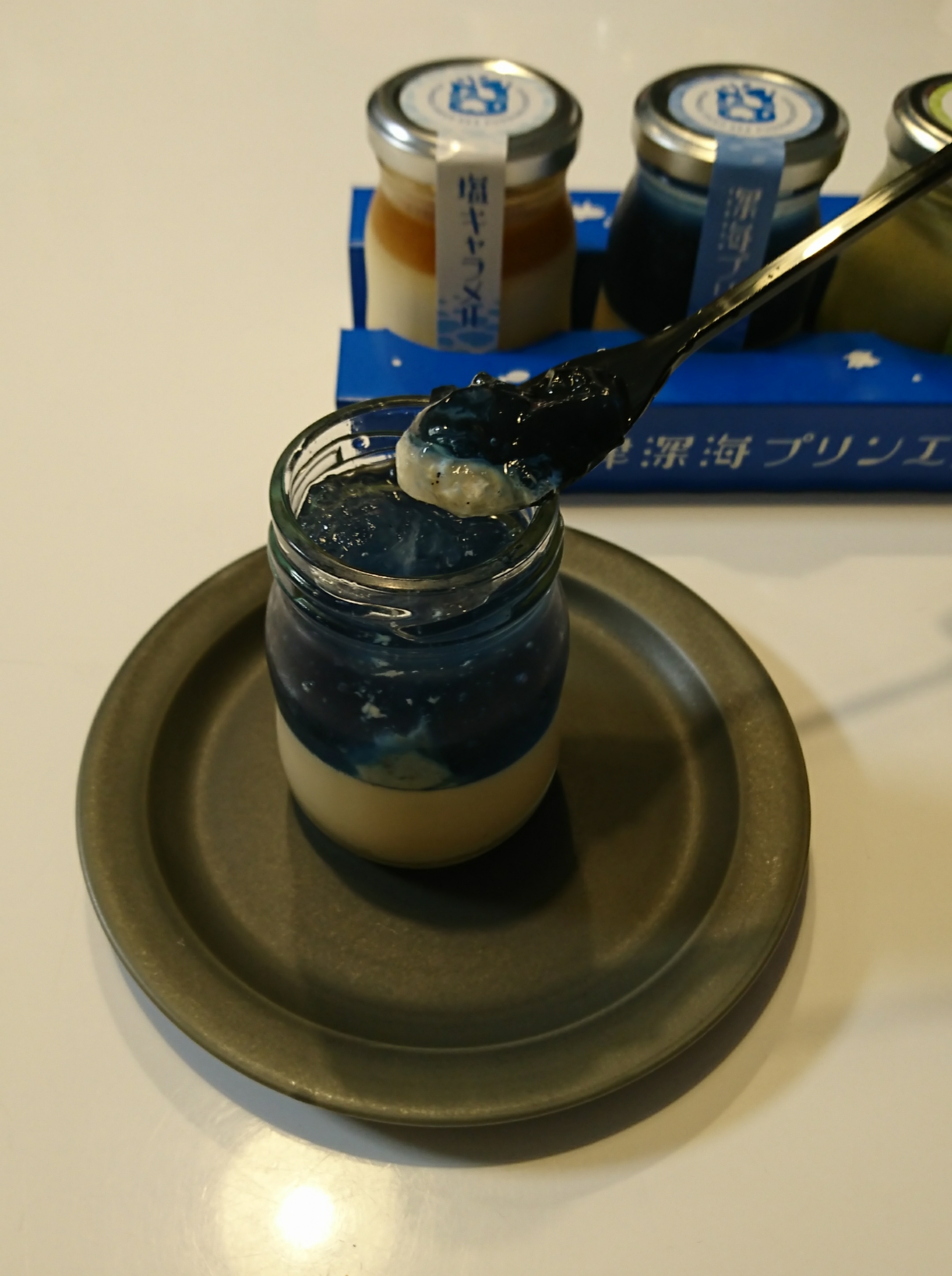深海プリン…メインで売り出してるらしいプリン。まず見た目がめちゃくちゃ綺麗!どんどん青色が深くなっていくのが、本当に深海みたい。すっきりで懐かしいラムネ味です。下のプリンとの相性も抜群です。