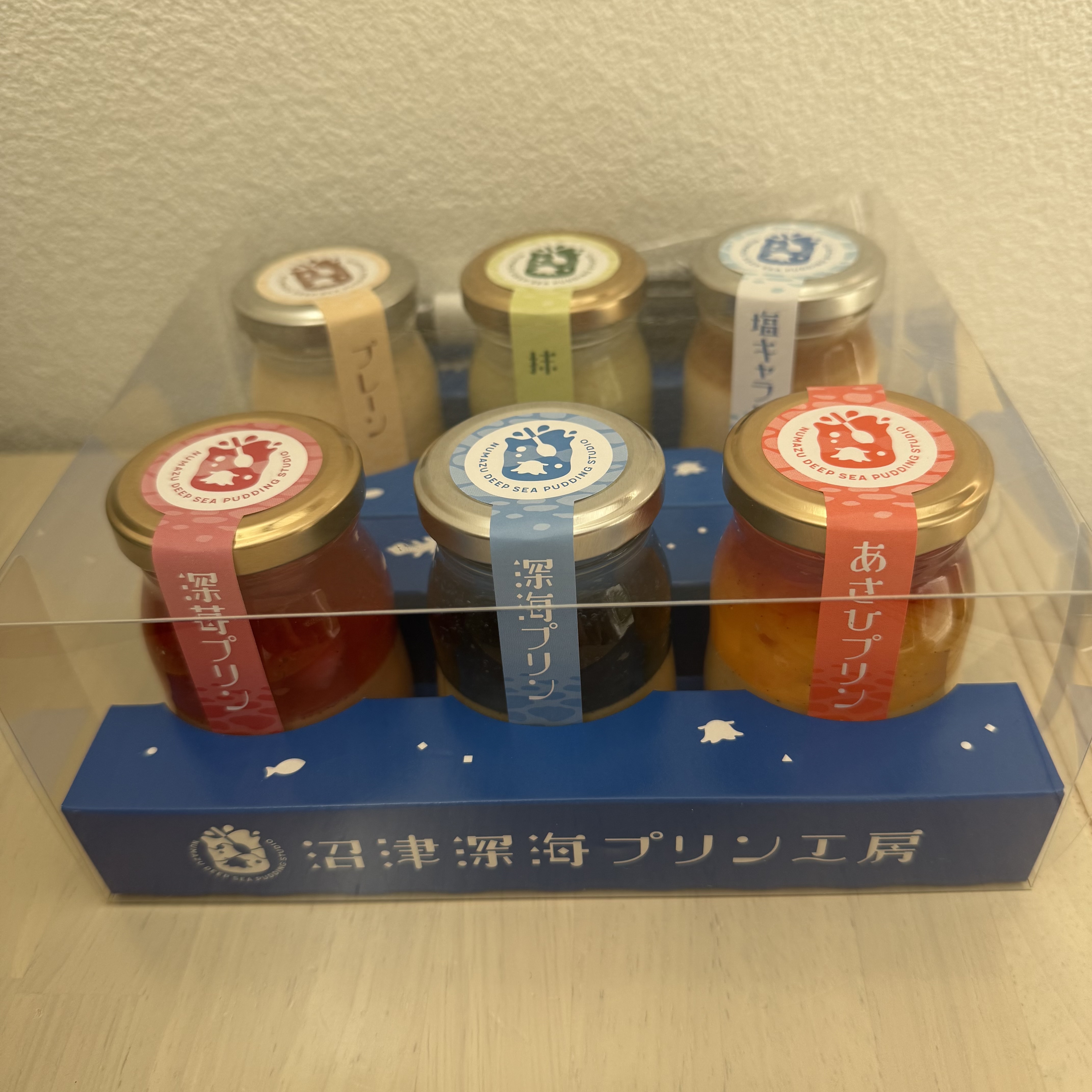 沼津産の食材を使用した「プリン」です。選び抜かれた国産の牛乳と卵を使い、素材の味をしっかりと引き出した、とろけるような滑らかさが特長です。店名にもなっている「深海プリン」は、駿河湾の深海を鮮やかな青いジュレで表現。清涼感あふれるラムネ味のジュレがプリンのまろやかさを一段と引き立て、見た目にも美しく仕上げました。その他、塩味のきいたキャラメルがアクセントの「塩キャラメル」や、ぐり茶を隠し味にした「抹茶プリン」など、全6種のフレーバーをセットにした、沼津市ならではのプリンです。専用ボックスに入って届くので、贈り物にもおすすめです。