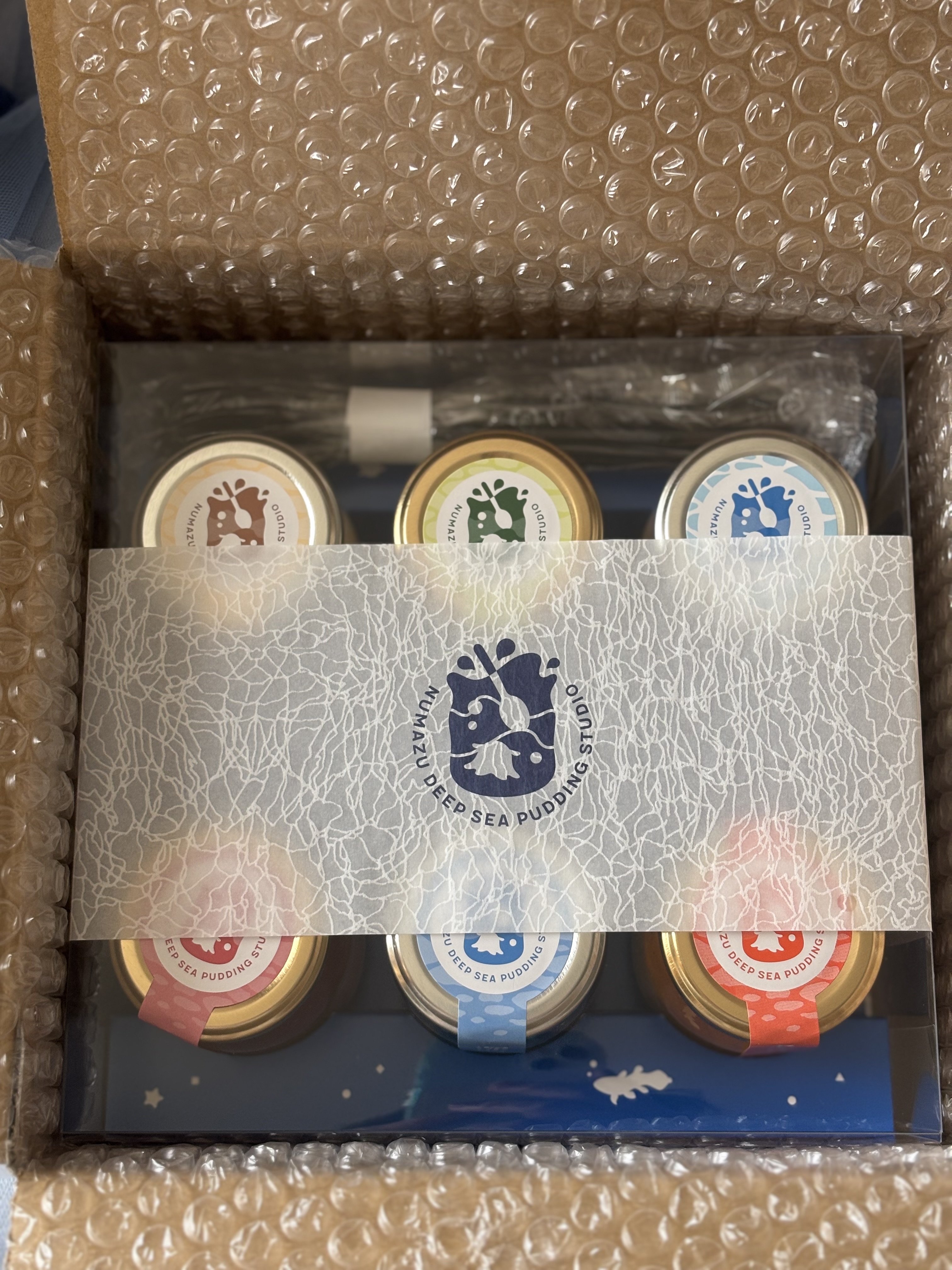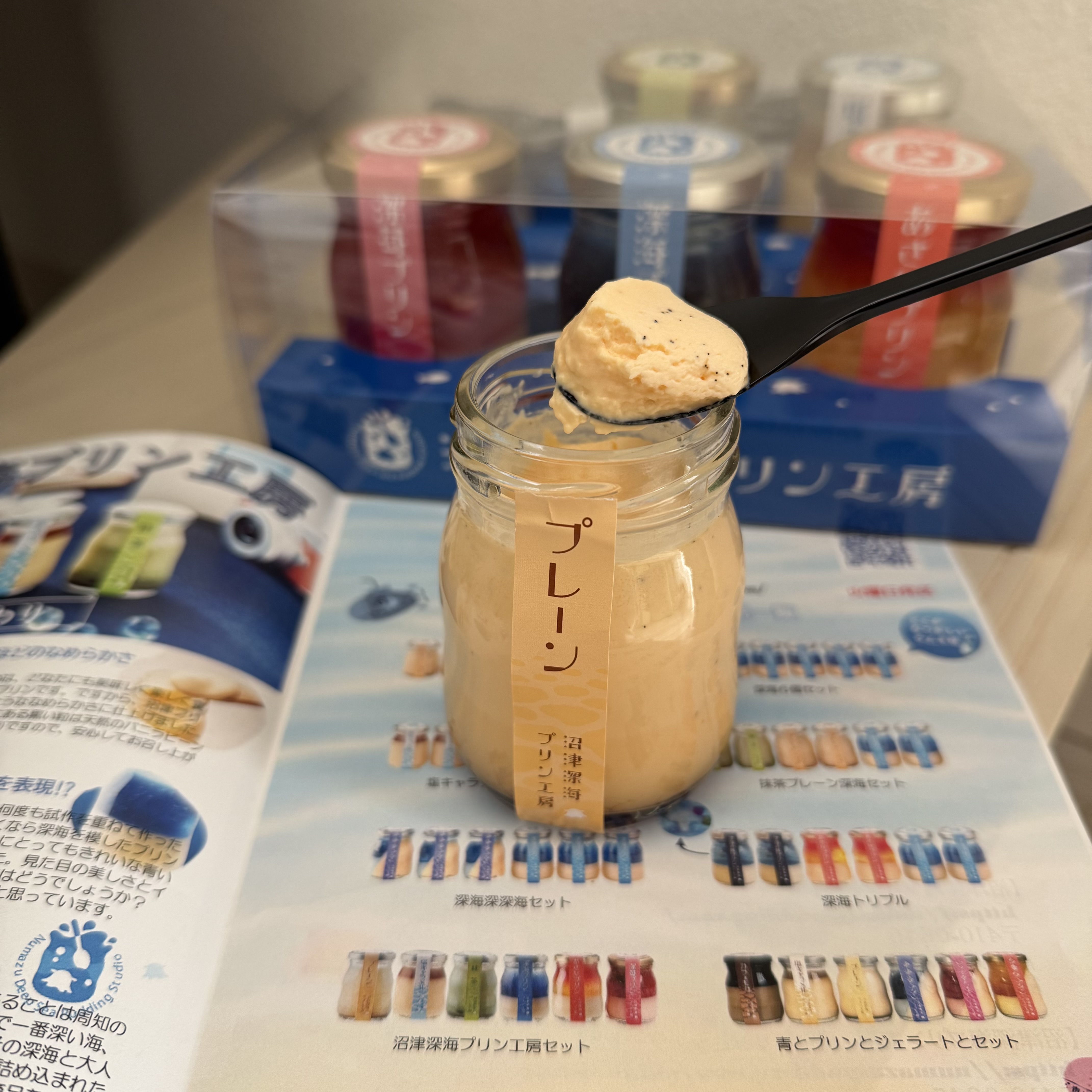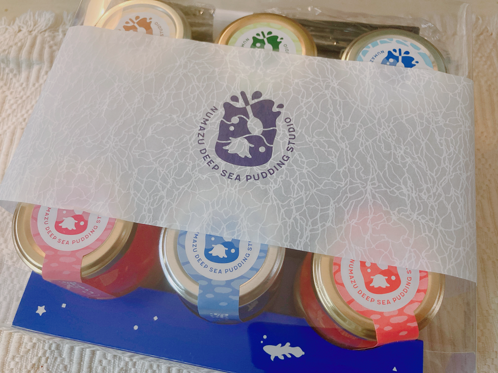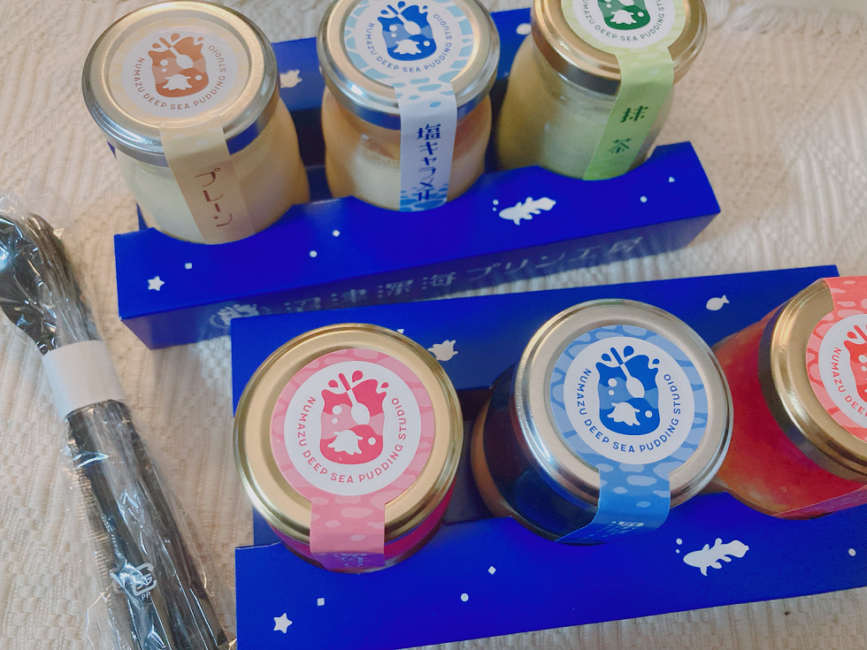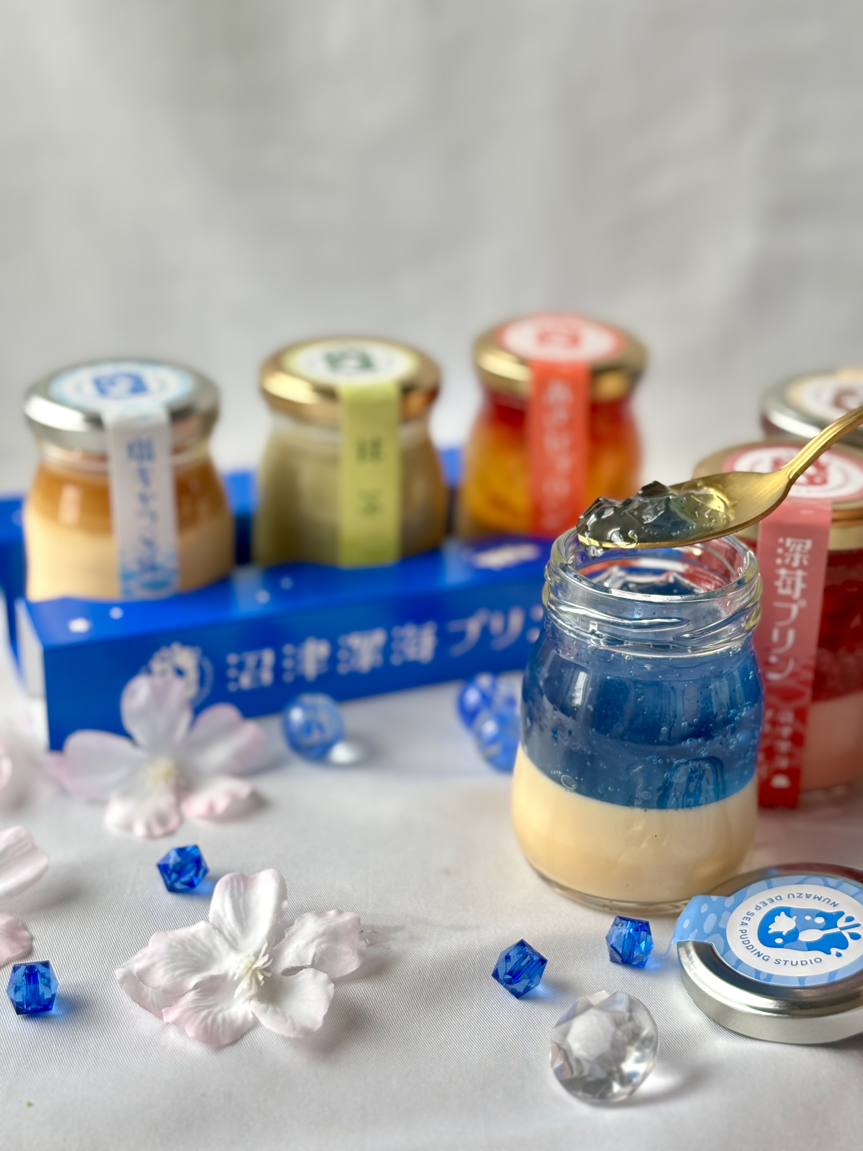 今回は内容が新しくなった「沼津深海プリン工房セット」をお届けします。通販で不動の一番人気となっております。店舗目の前に広がる日本一の駿河湾深海をイメージすることや静岡県の食材を使用することは変わらぬ拘りです。キラキラだけではない美味しいなめらかプリンとの組み合わせを目でも舌でも味わっていただければと思います。