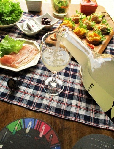 お米の細かな粒や酵母が混ざっているため白濁しています。ワインのシャンパンと同じ製法(瓶内二次発酵)で造られ、酵母が発酵する際に作り出す炭酸ガスをお酒の中に閉じ込めました。