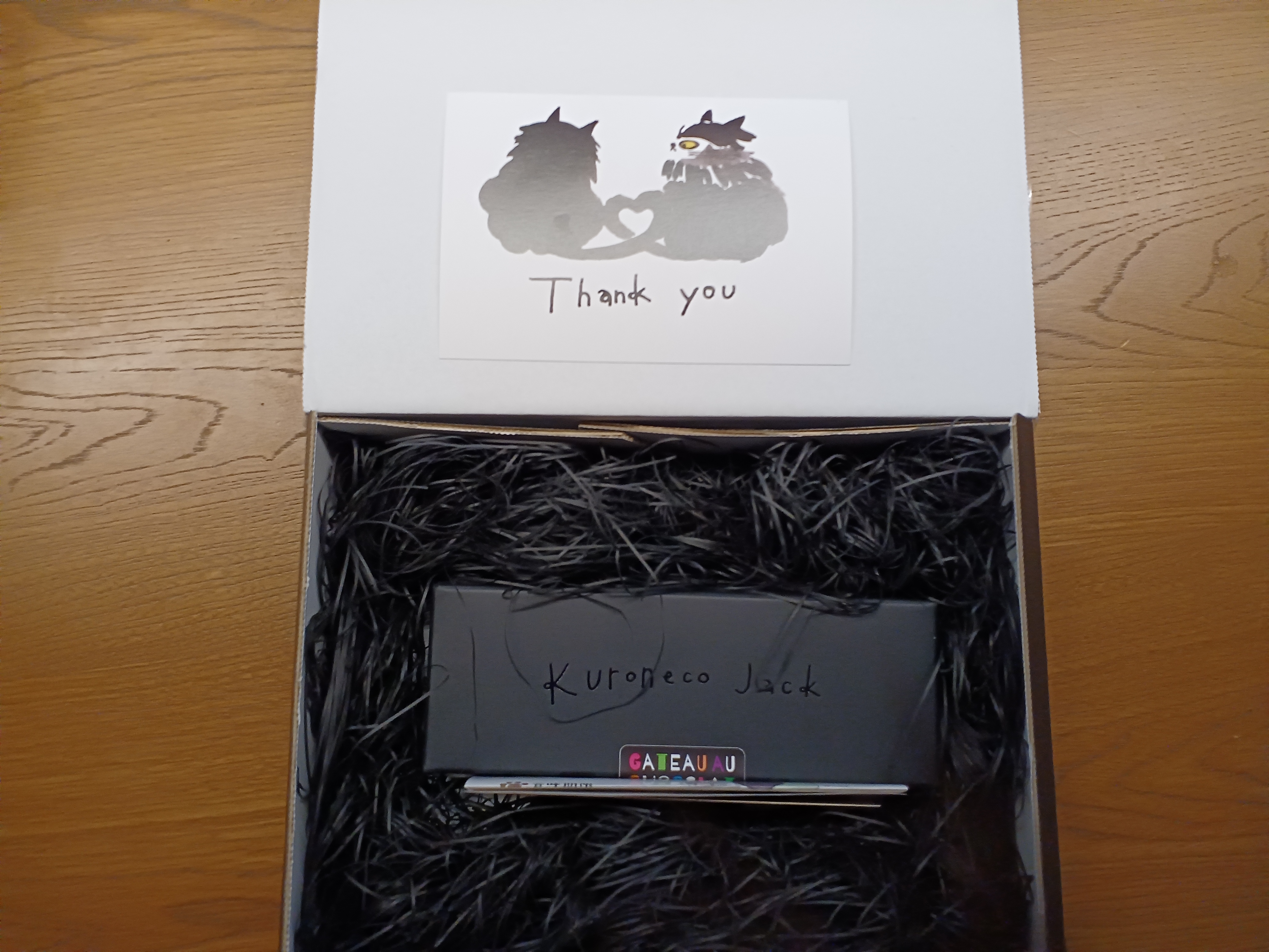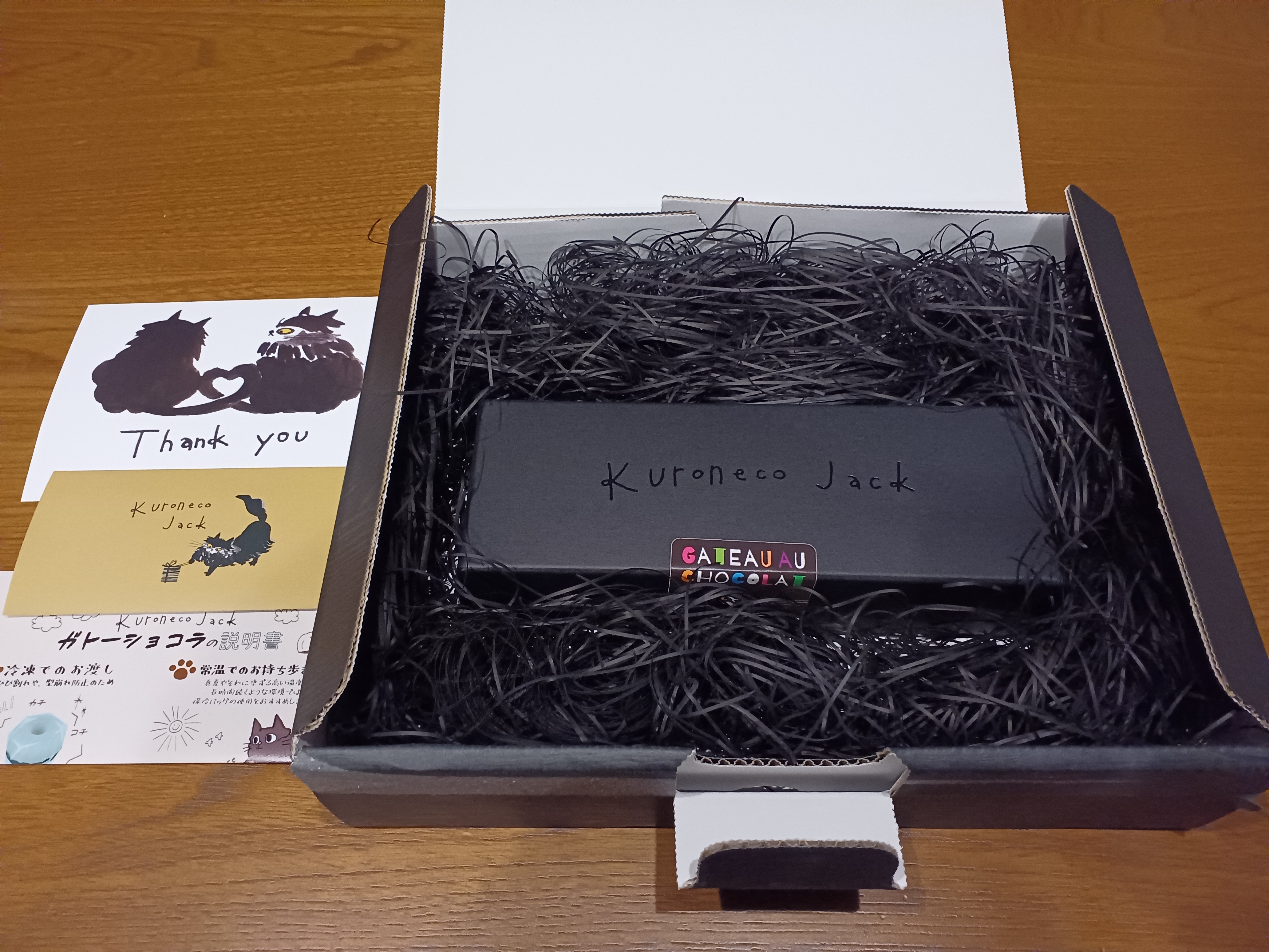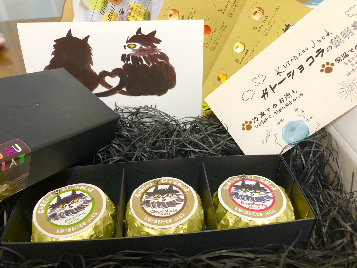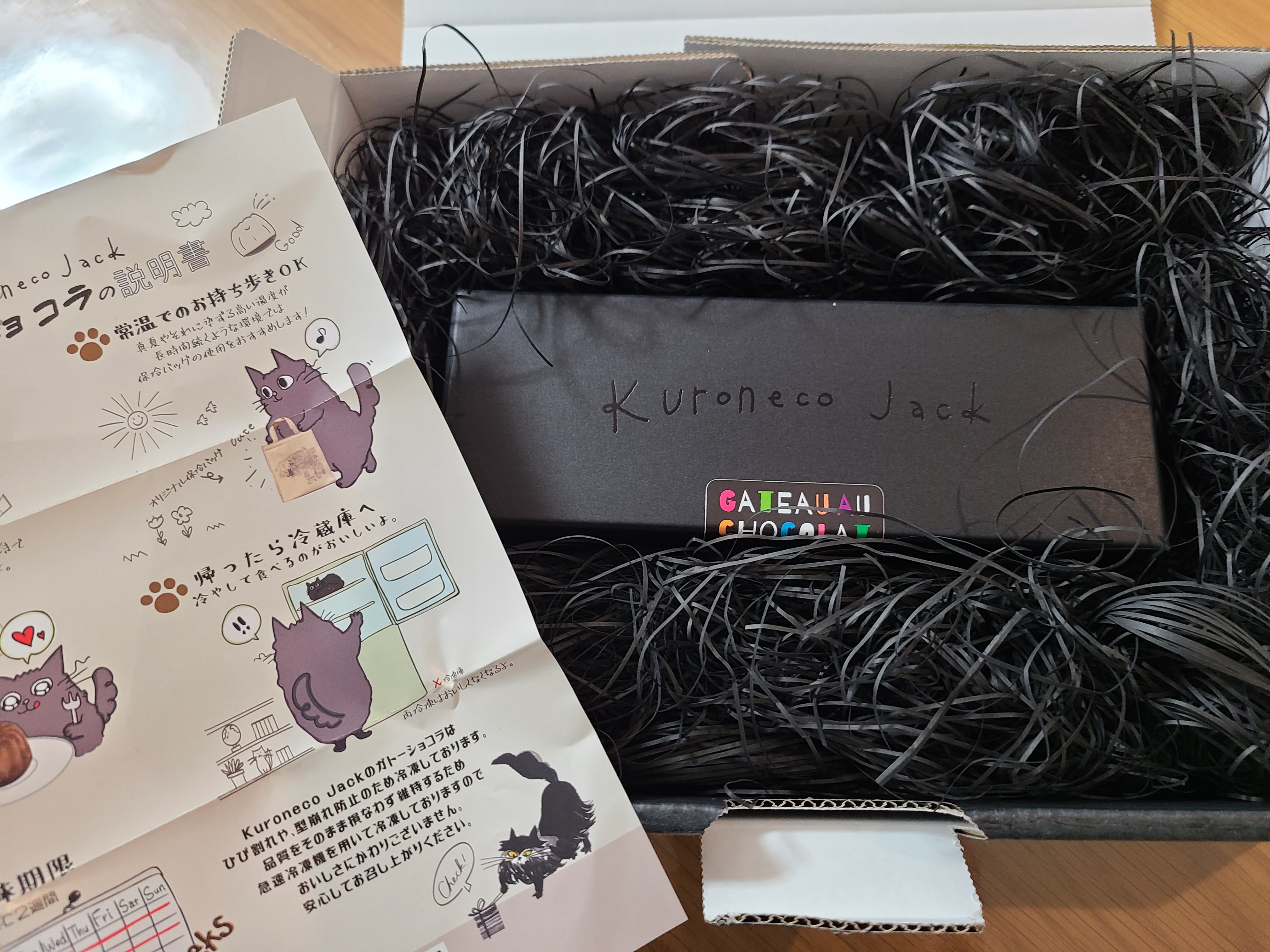 届いた箱を開けると…ガトーショコラが入っている箱をふわっふわの黒猫を連想させる梱包材が包み込んでいます。「可愛いー‼︎」黒猫ジャックのシールやイラスト入りのポストカード…とにかく目に飛び込んだもの全てが可愛い‼︎