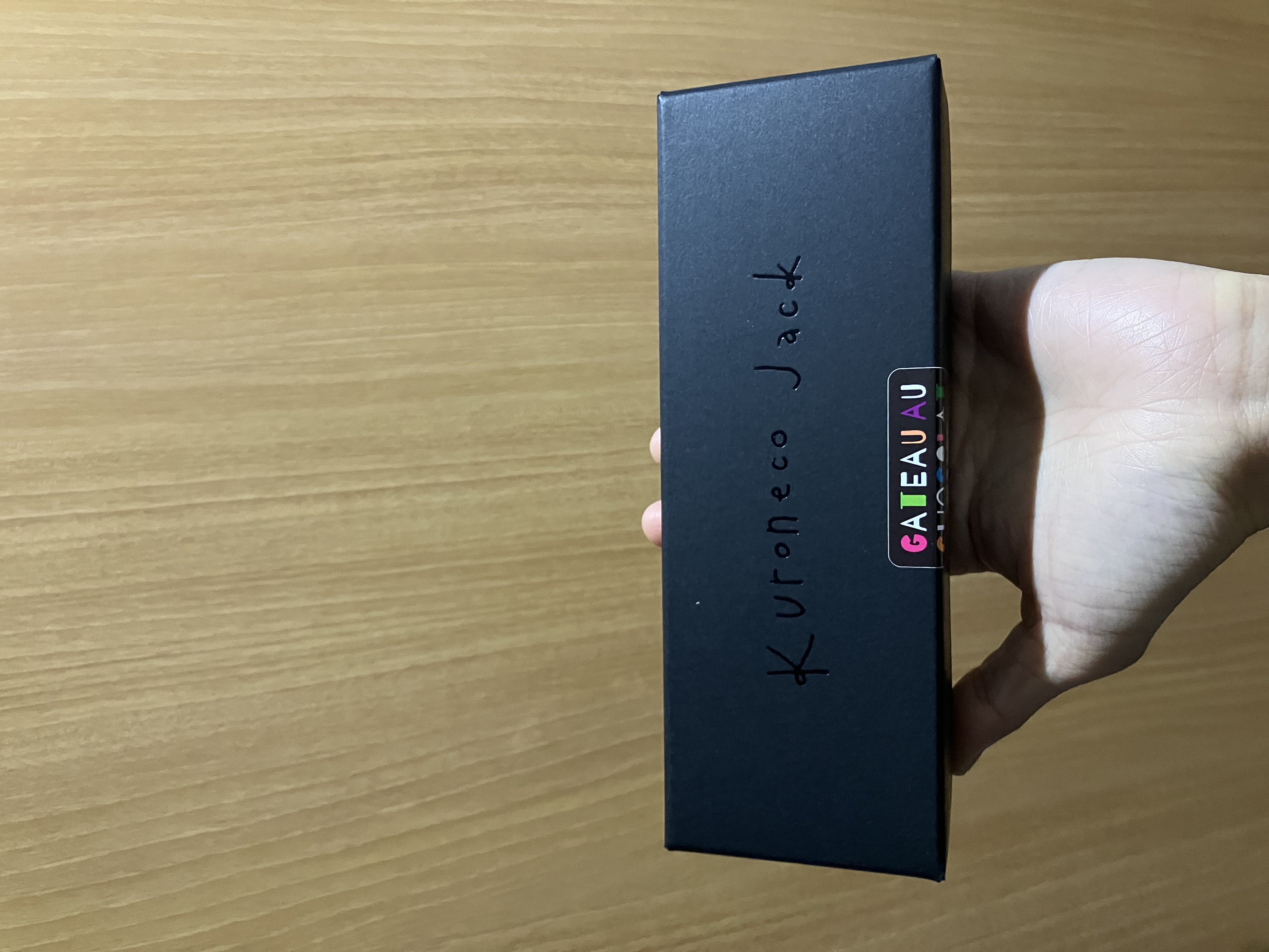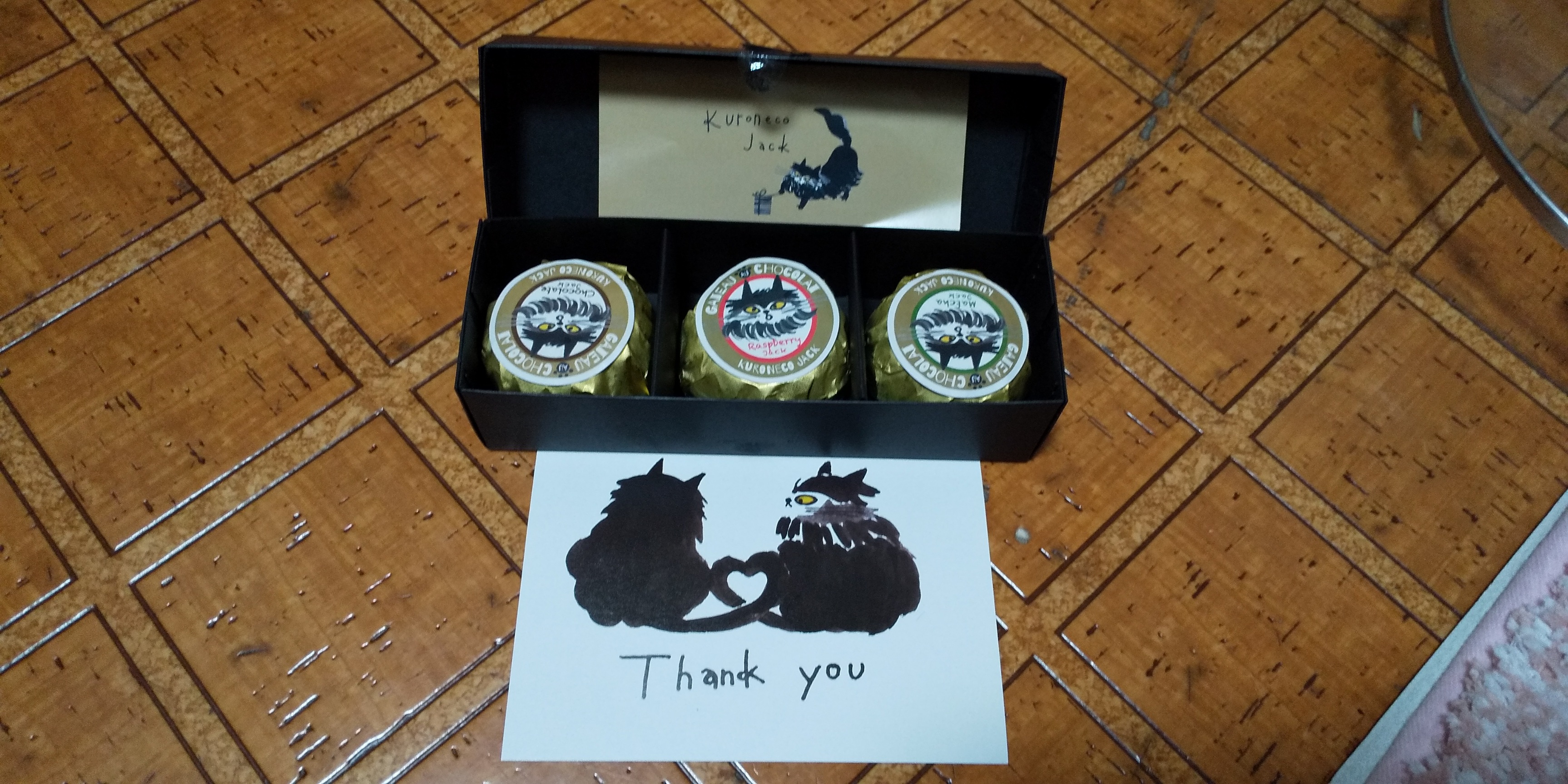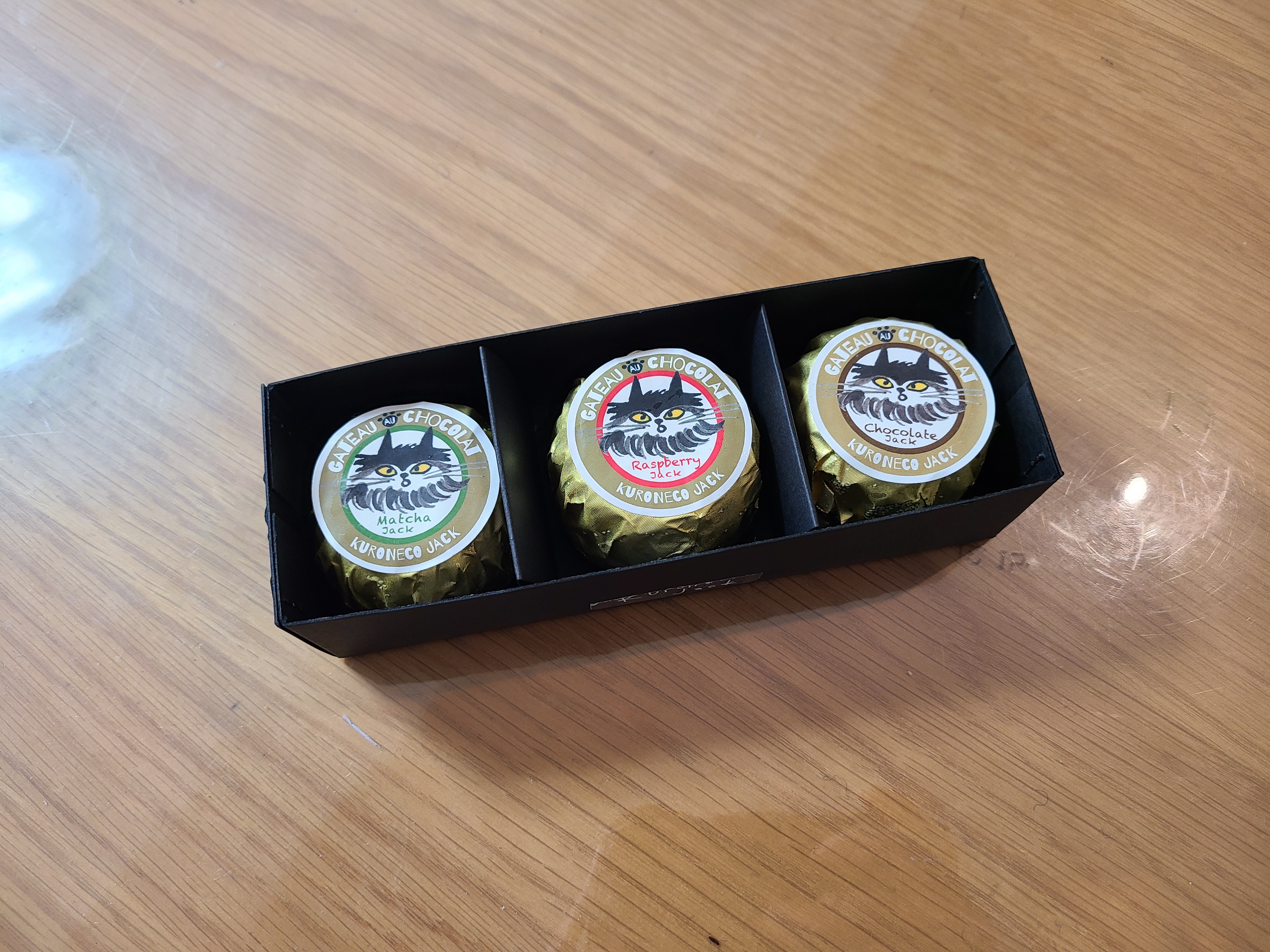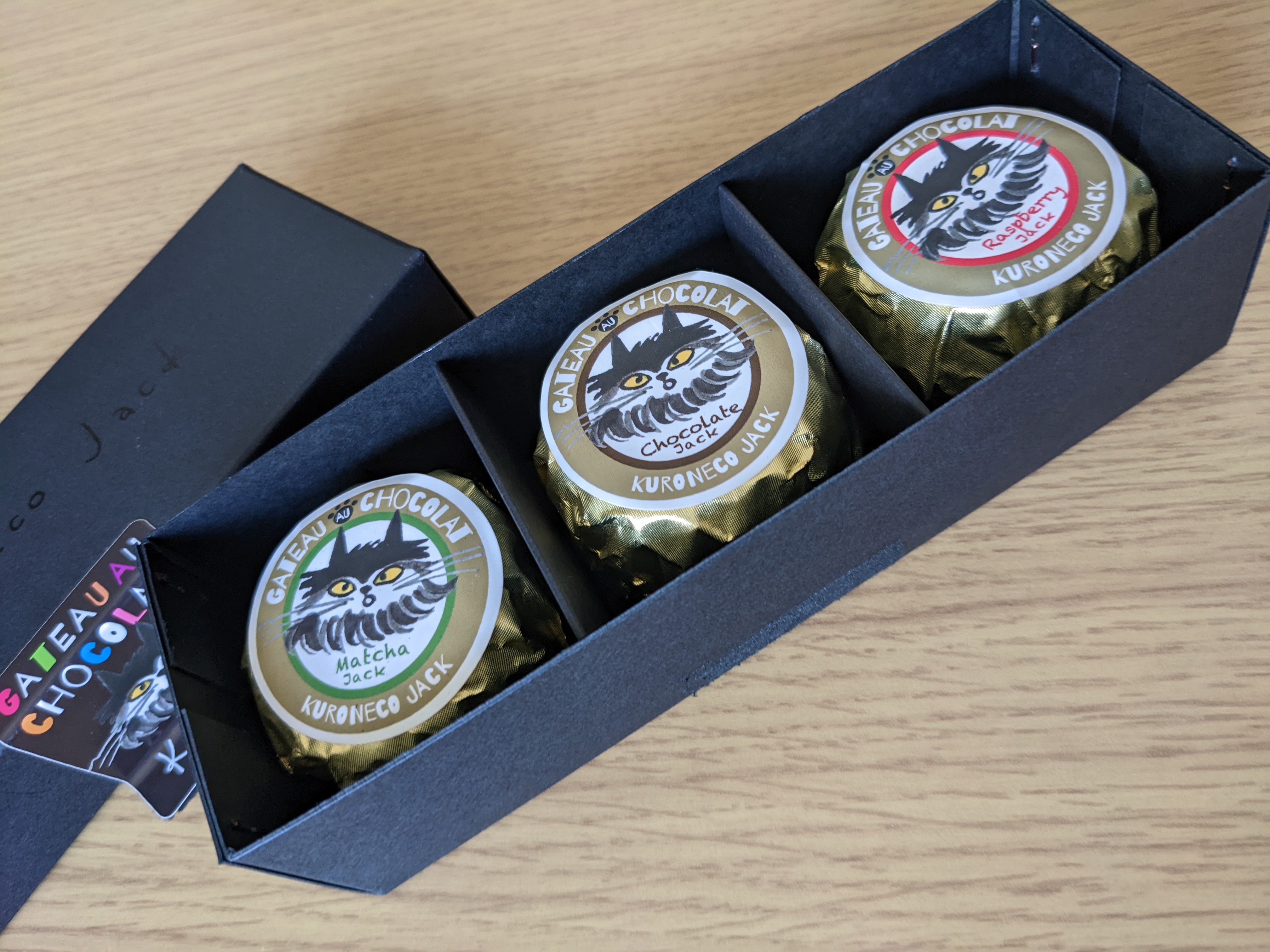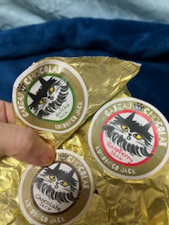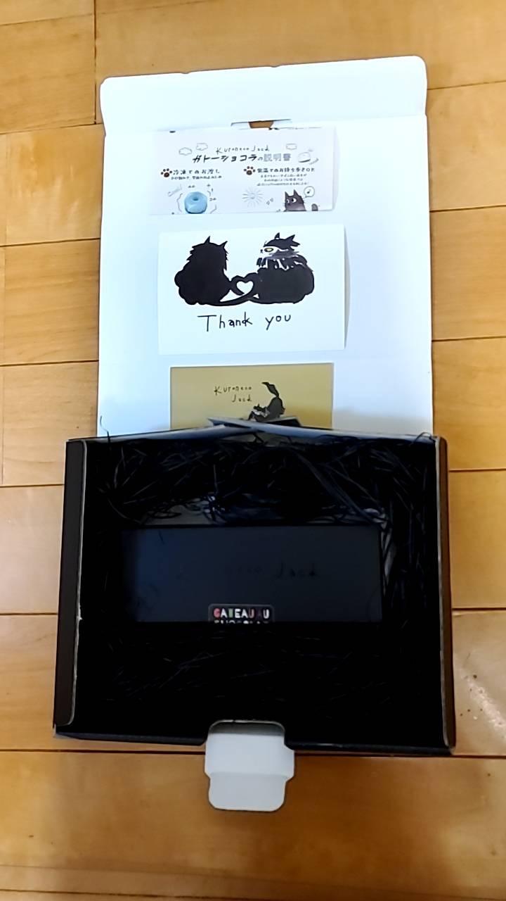 ガトーショコラの箱を開けると…「可愛いー♡」今度は黒猫ジャックのシールが貼られた金色の包紙。