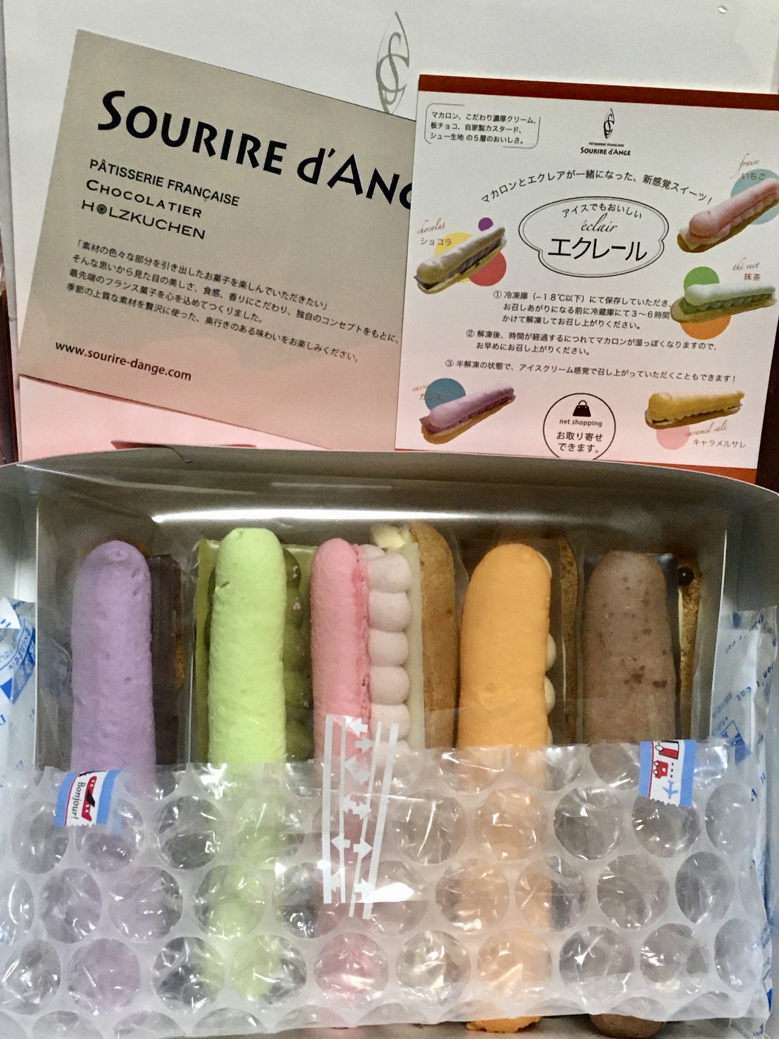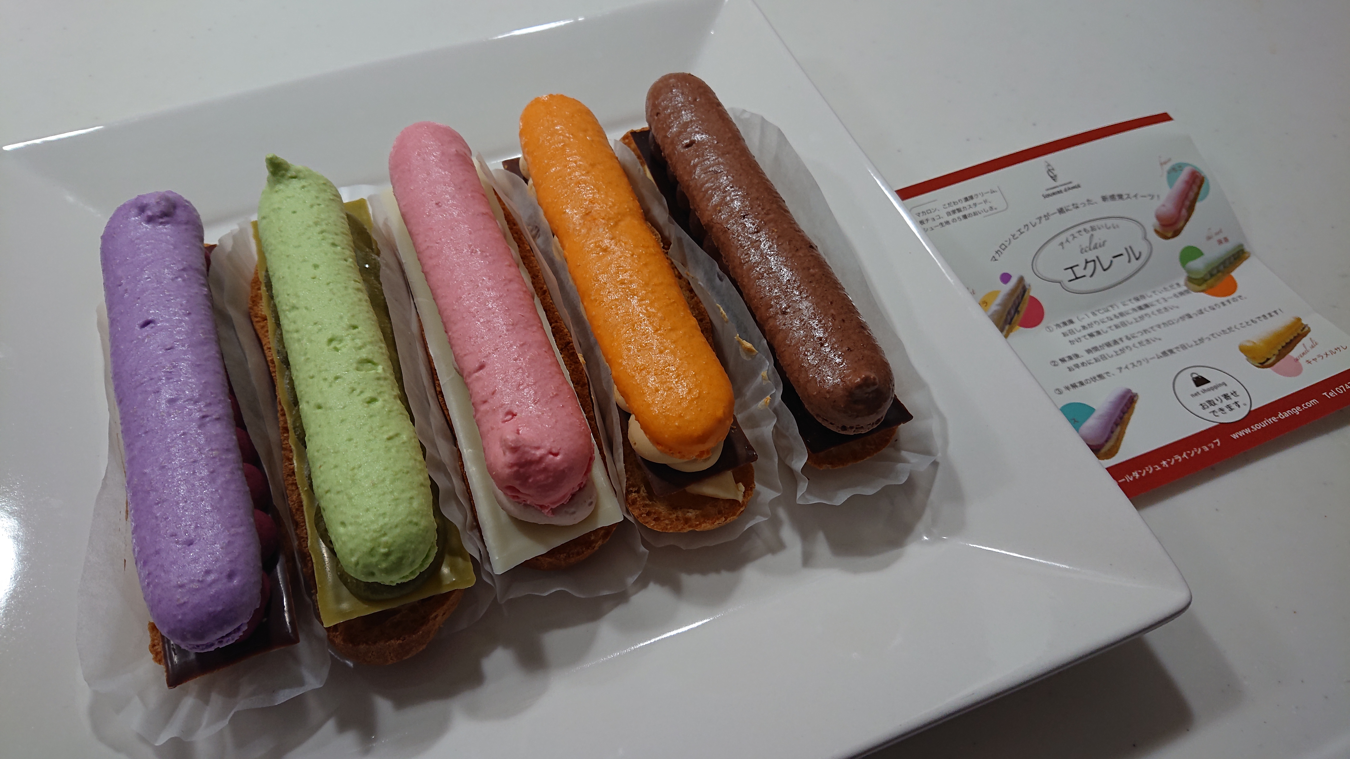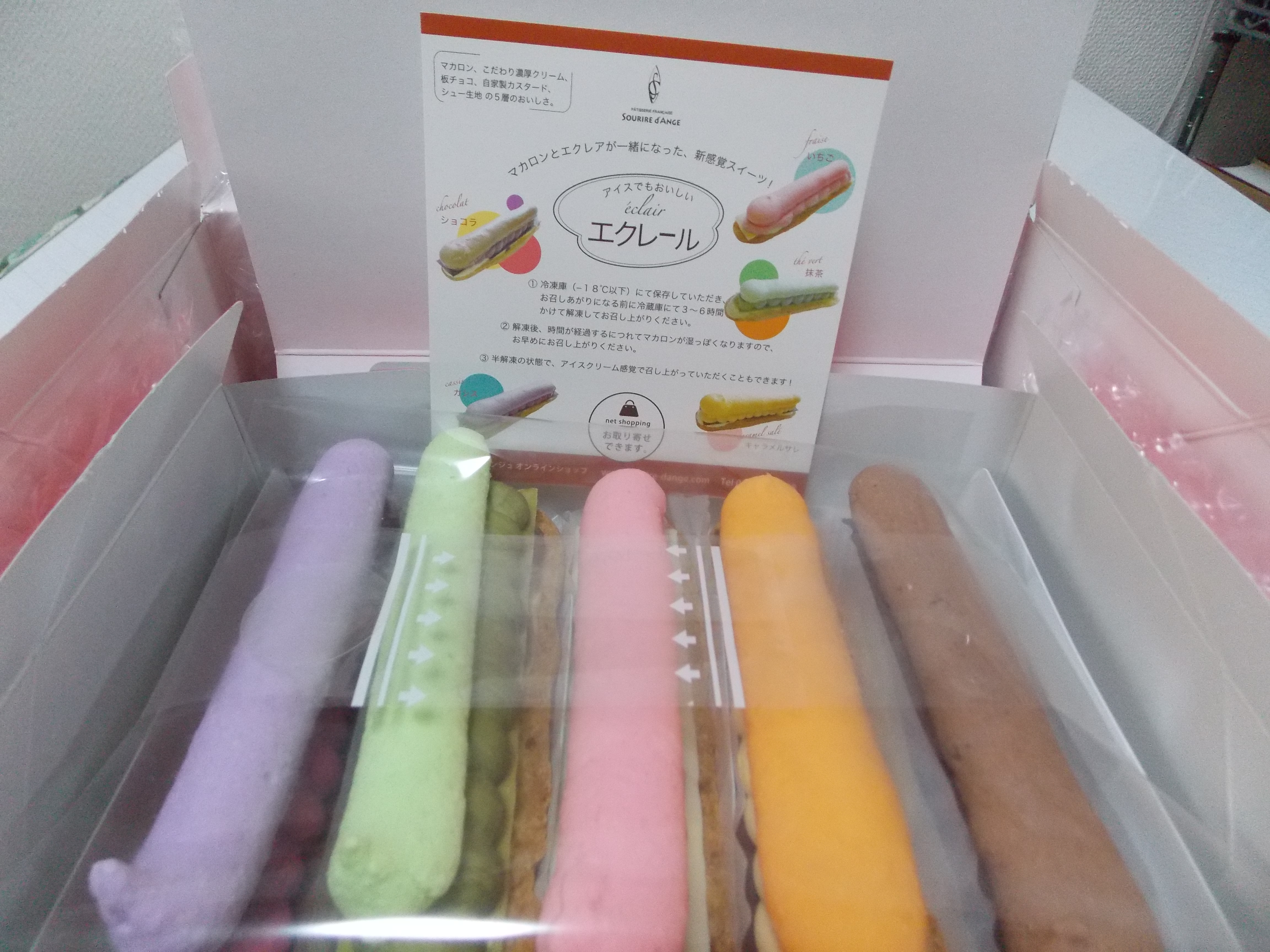 エクレアの生地にクーリームとマカロンがのった新感覚スイーツということで、楽しみに箱を開けると5種類の色とりどりのスイーツがきれいに並んでいました!