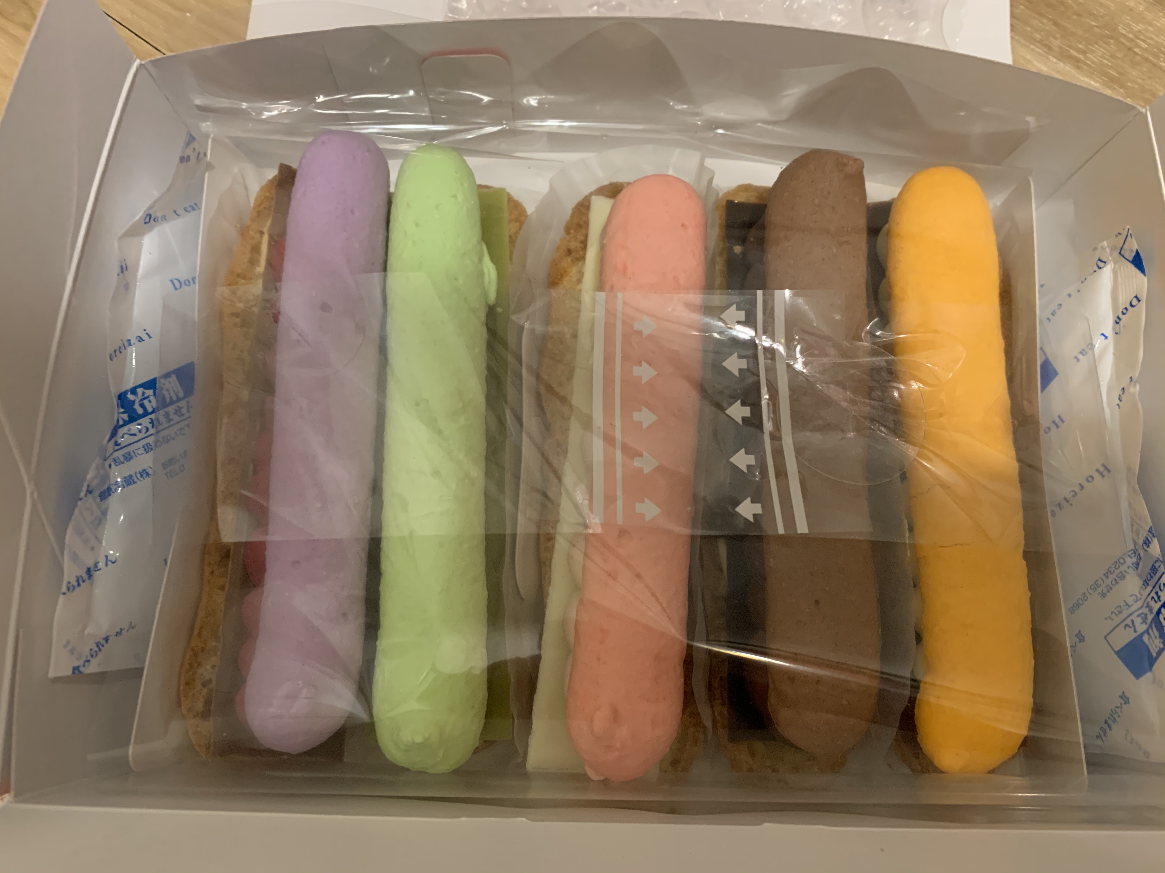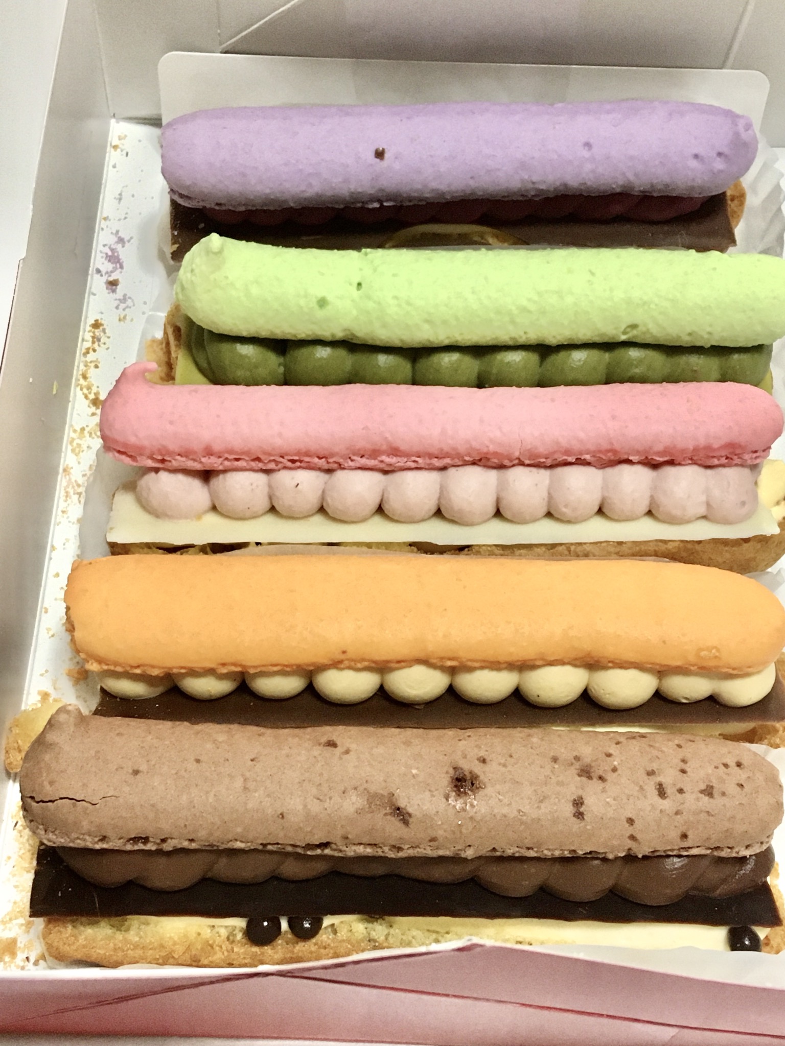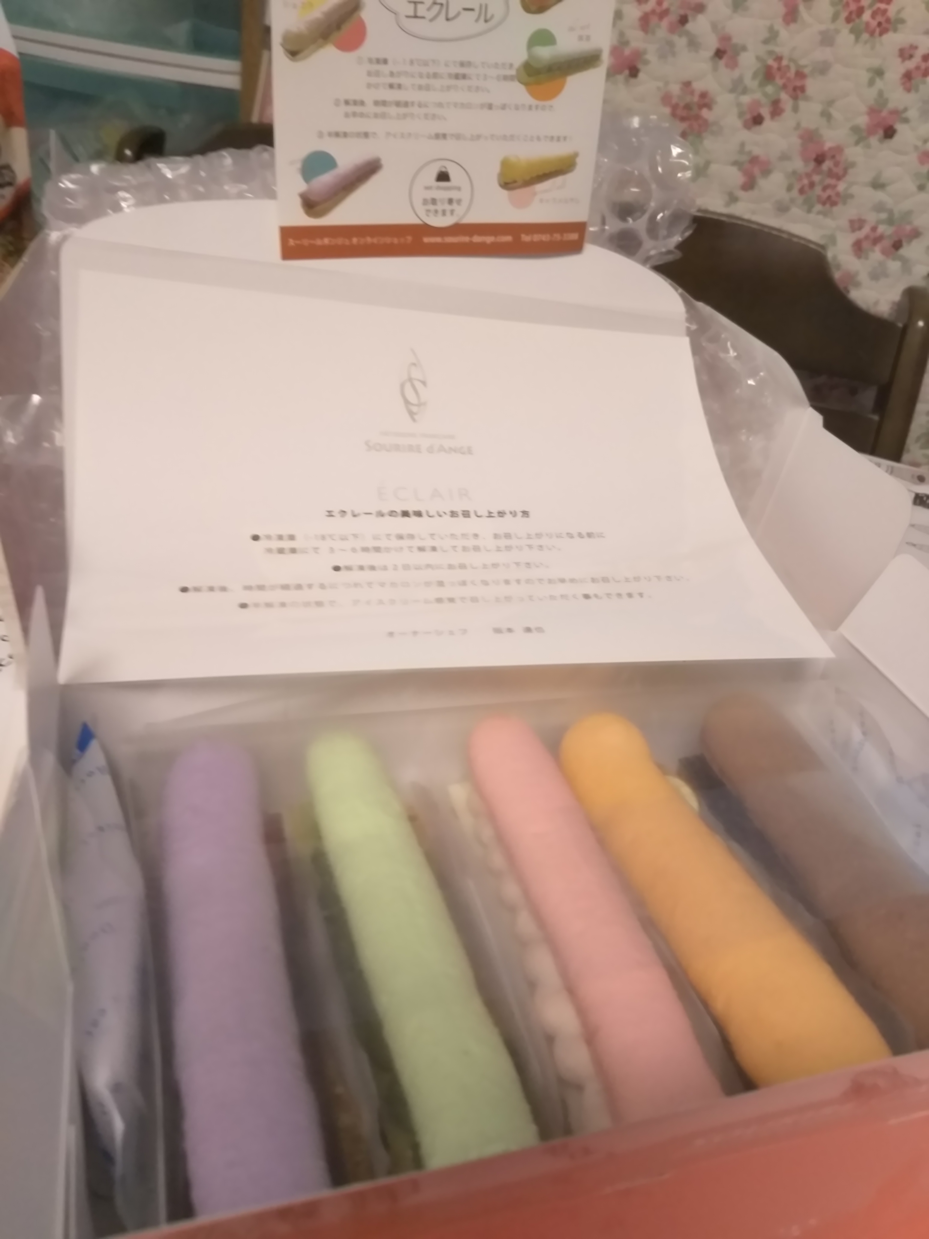 エクレアの生地にクーリームとマカロンがのった新感覚スイーツということで、楽しみに箱を開けると5種類の色とりどりのスイーツがきれいに並んでいました!