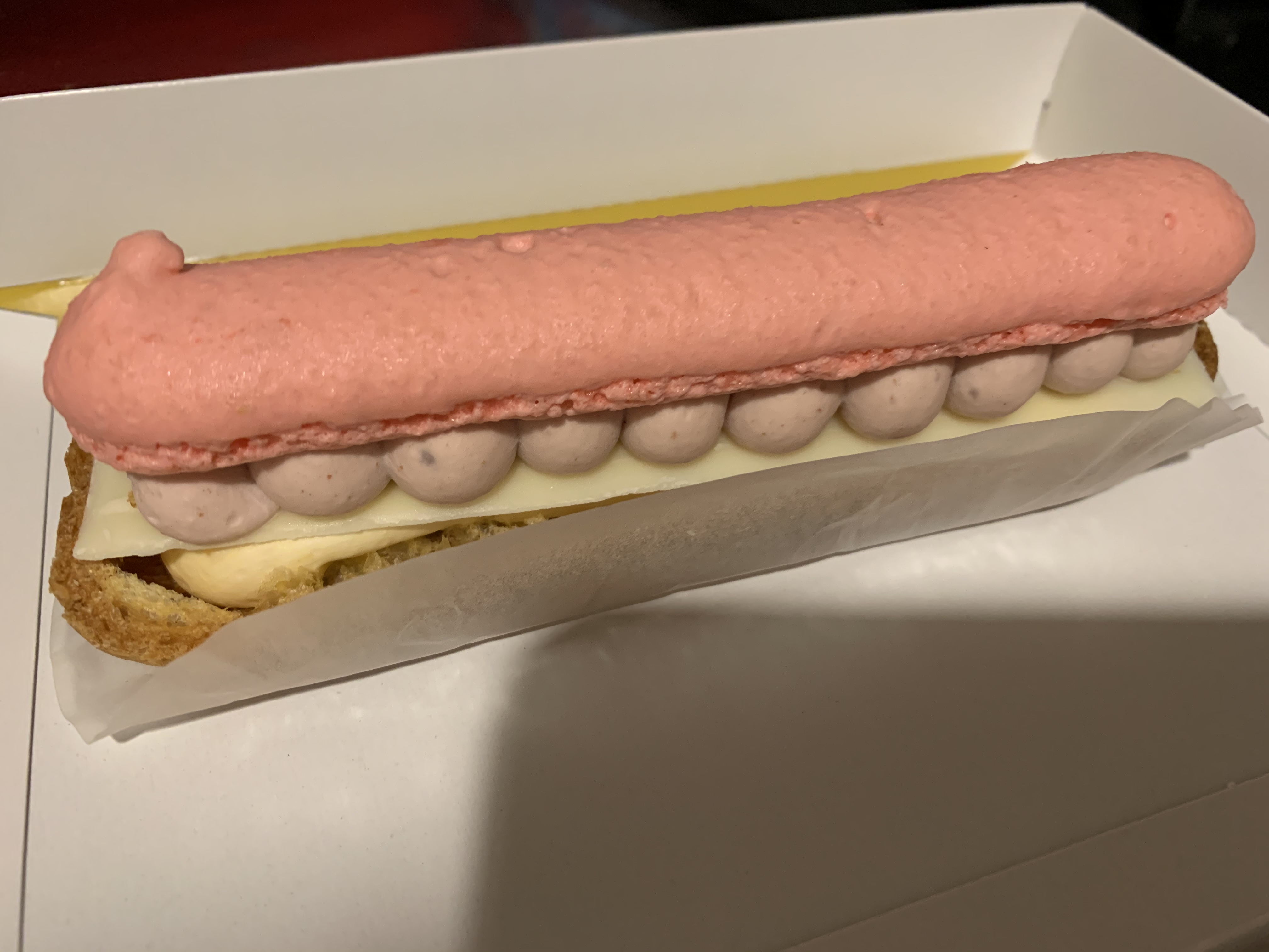エクレア生地の上にクリームやトッピングをたっぷり乗せ、サクサクのマカロンパリジャンを乗せました。
