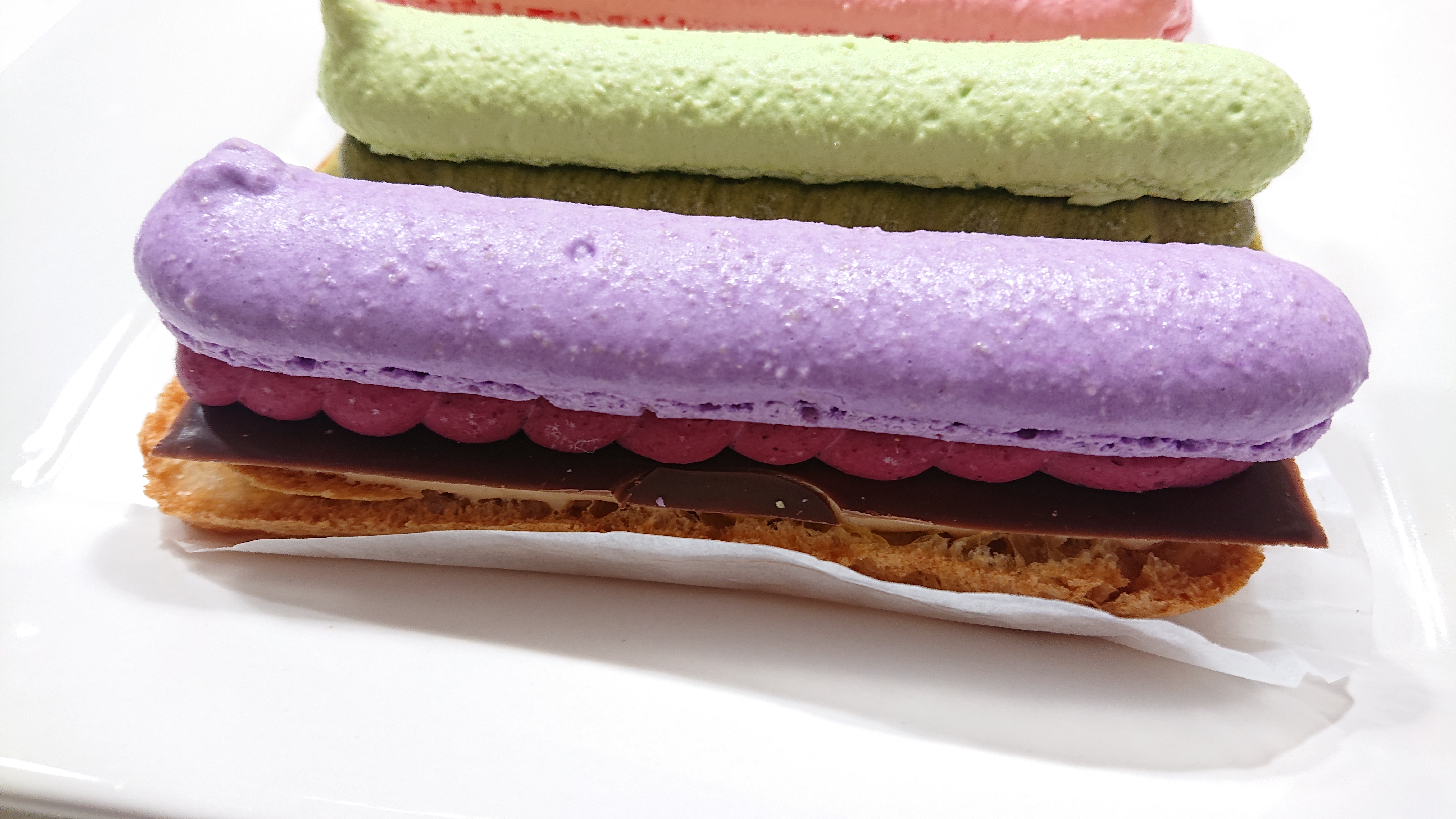 マカロンとエクレアがコラボした新感覚スイーツ。エクレア生地に、たっぷりのカスタードクリーム、薄いチョコレート、それぞれの味のクリーム、一番上にマカロン生地が重なり合った食感が楽しいスイーツです。オレンジ色のキャラメルサレ、紫色がカシス、ピンク色がフレーズ、茶色がショコラ、緑色がテベールと、5種のフレーバーに合わせた色合いのが鮮やかで、インスタ映え必至なエクレアです。