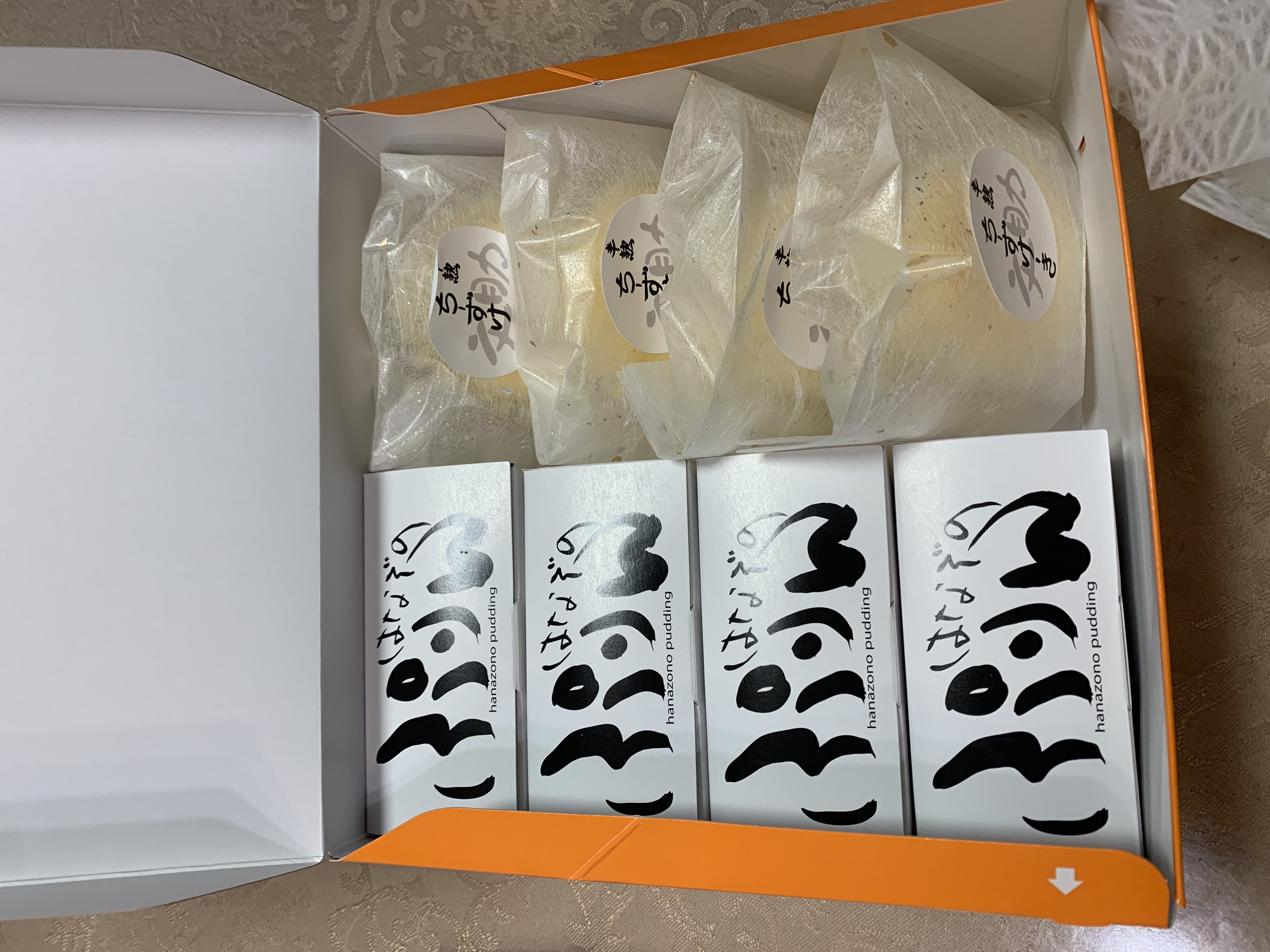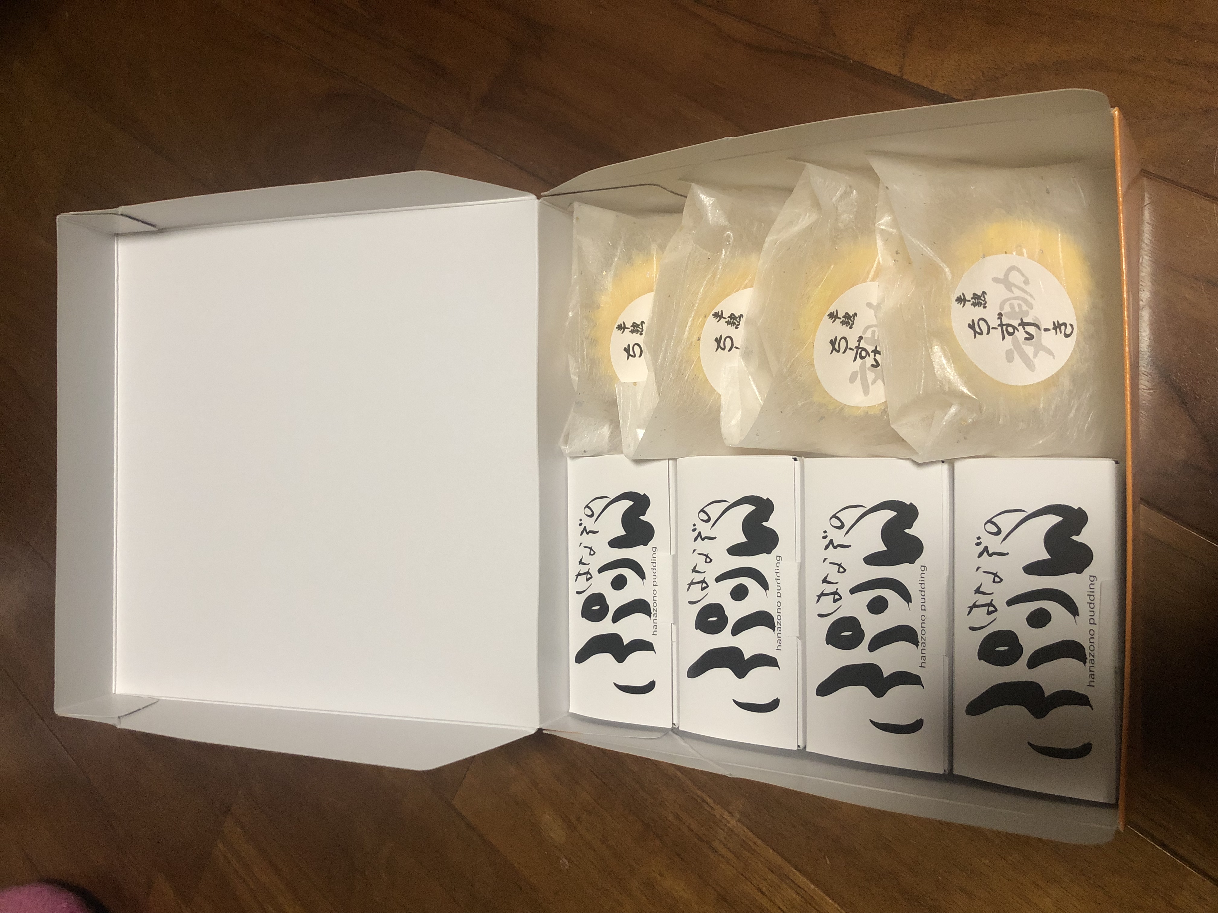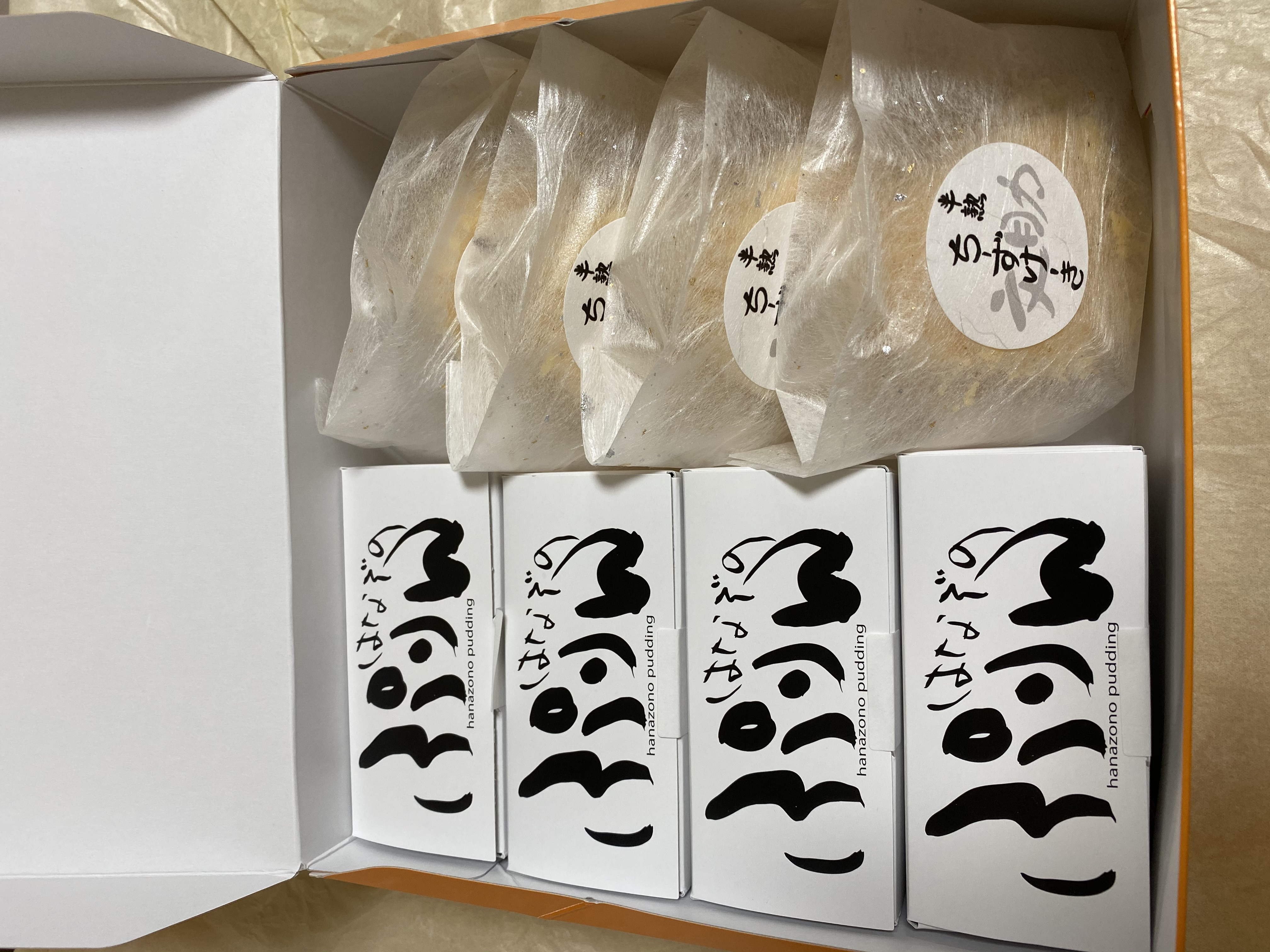 化粧箱の蓋を開けると、サイトで紹介されていた通り、「はなぞのぷりん」が入った長方形の箱が4個、「文助の半熟チーズケーキ」がこれも個包装で4個、計8個が入っていました。