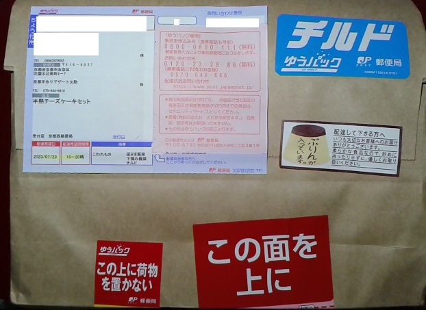 「ゆうパック」のチルドで、予定日時より9分早く届きました。まあ、許容範囲です。