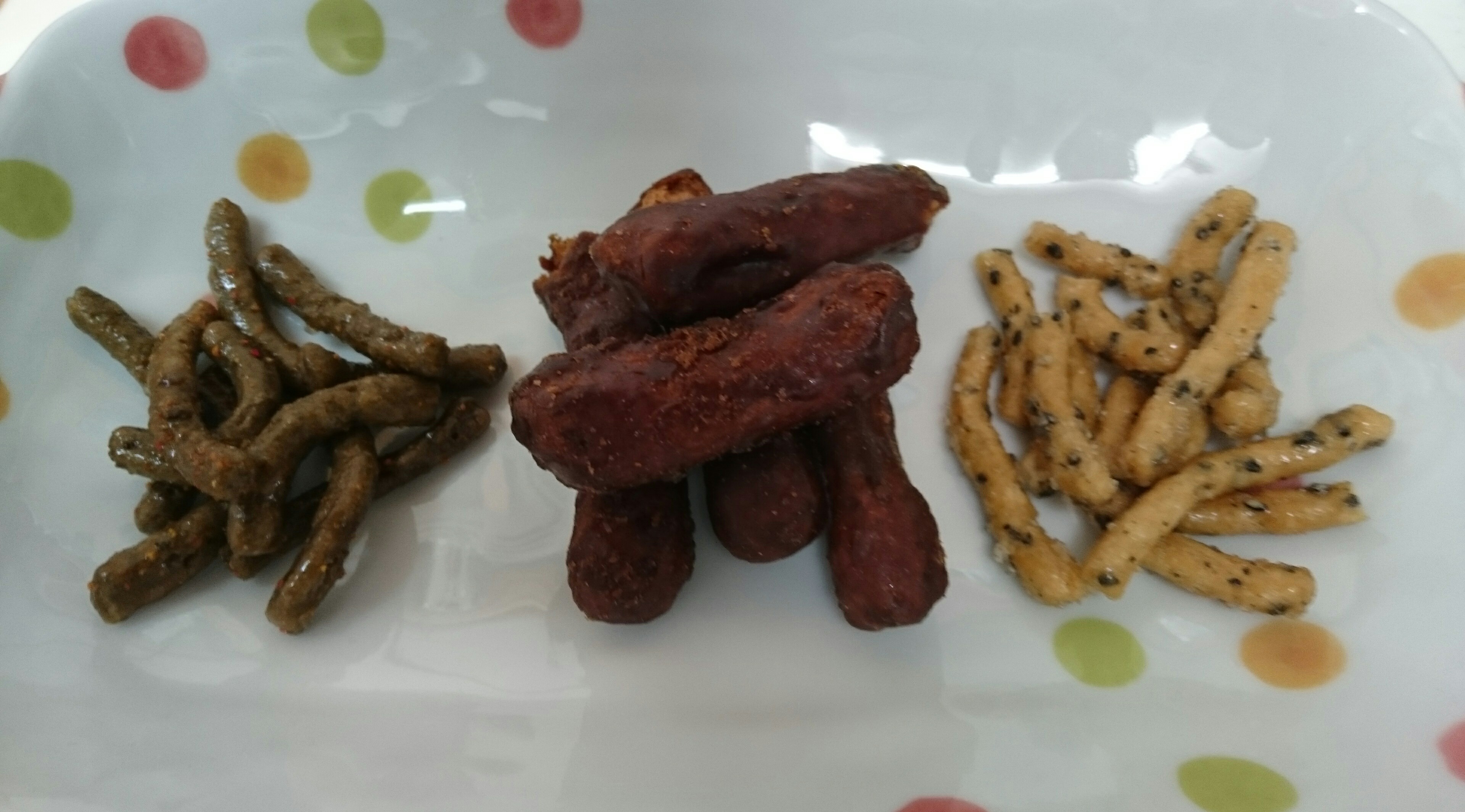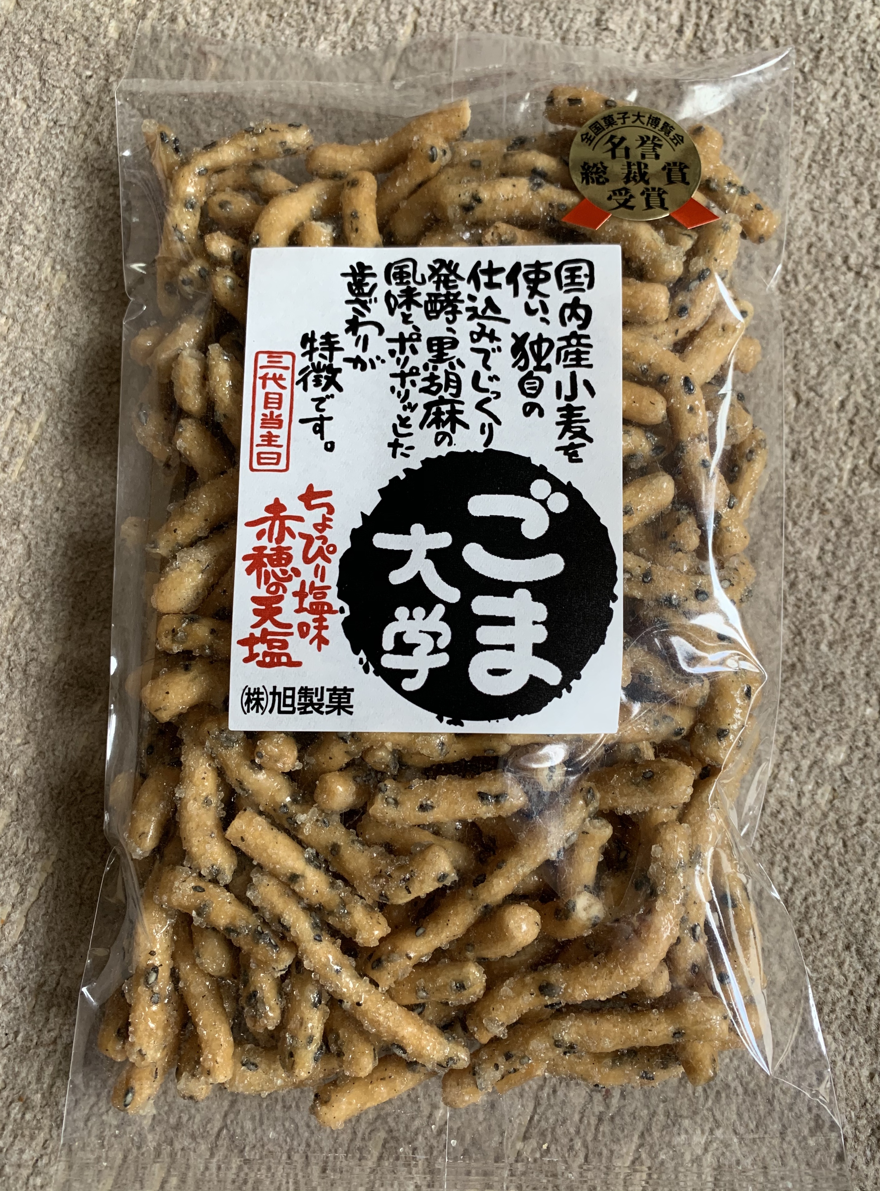 ごま大学:細いかたち、ひとつひとつは小さめ。ごまの香ばしさが豊かでおいしいです。主張しすぎてこないのもいいです。まわりについている粒の大きめの塩が、アクセントになっていて飽きのこない味でした。塩のしょっぱさと、かりんとうの甘み、胡麻の香ばしさのバランスがいいです。うちのおばあちゃんはこれが一番気に入ったようで、よかったです。