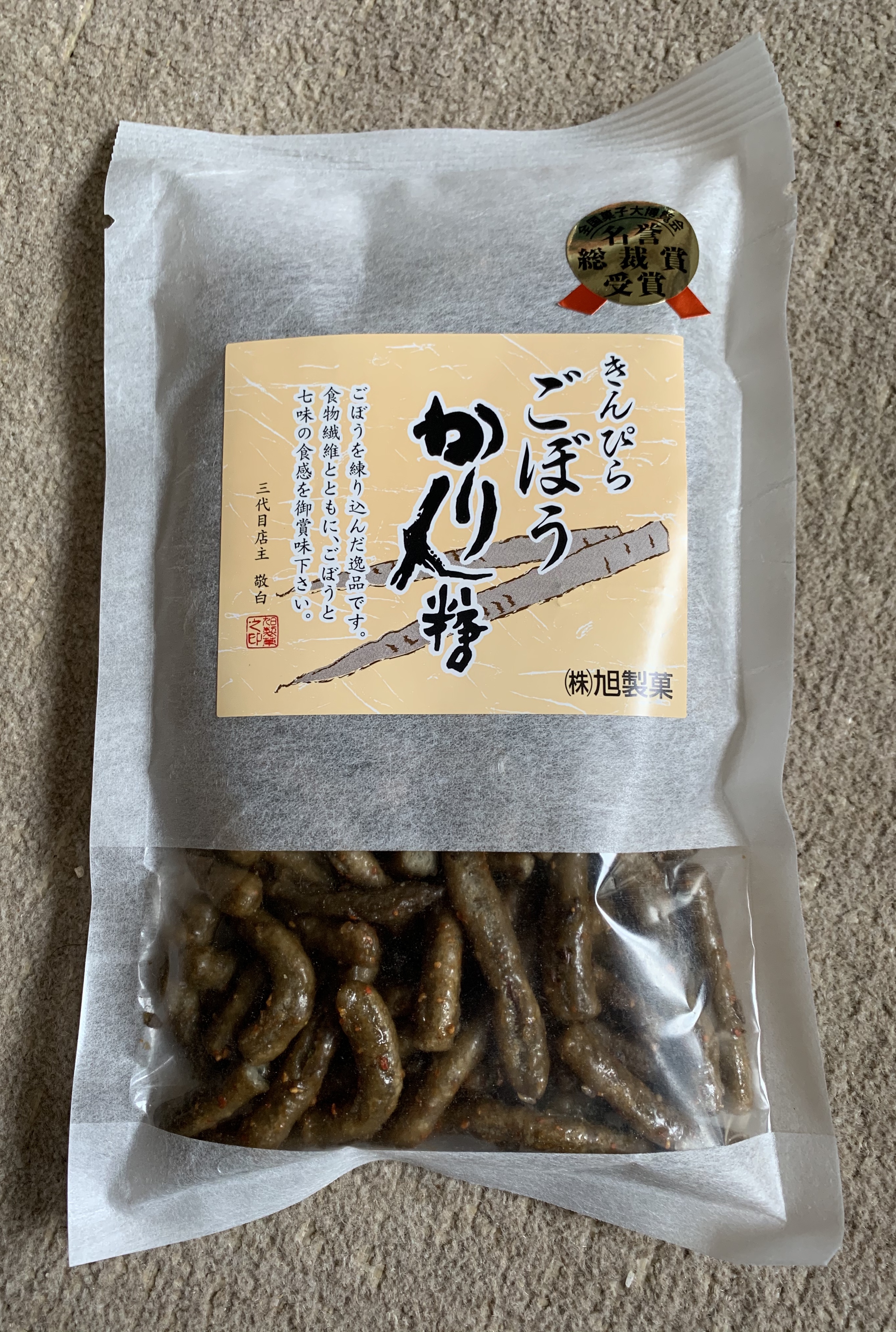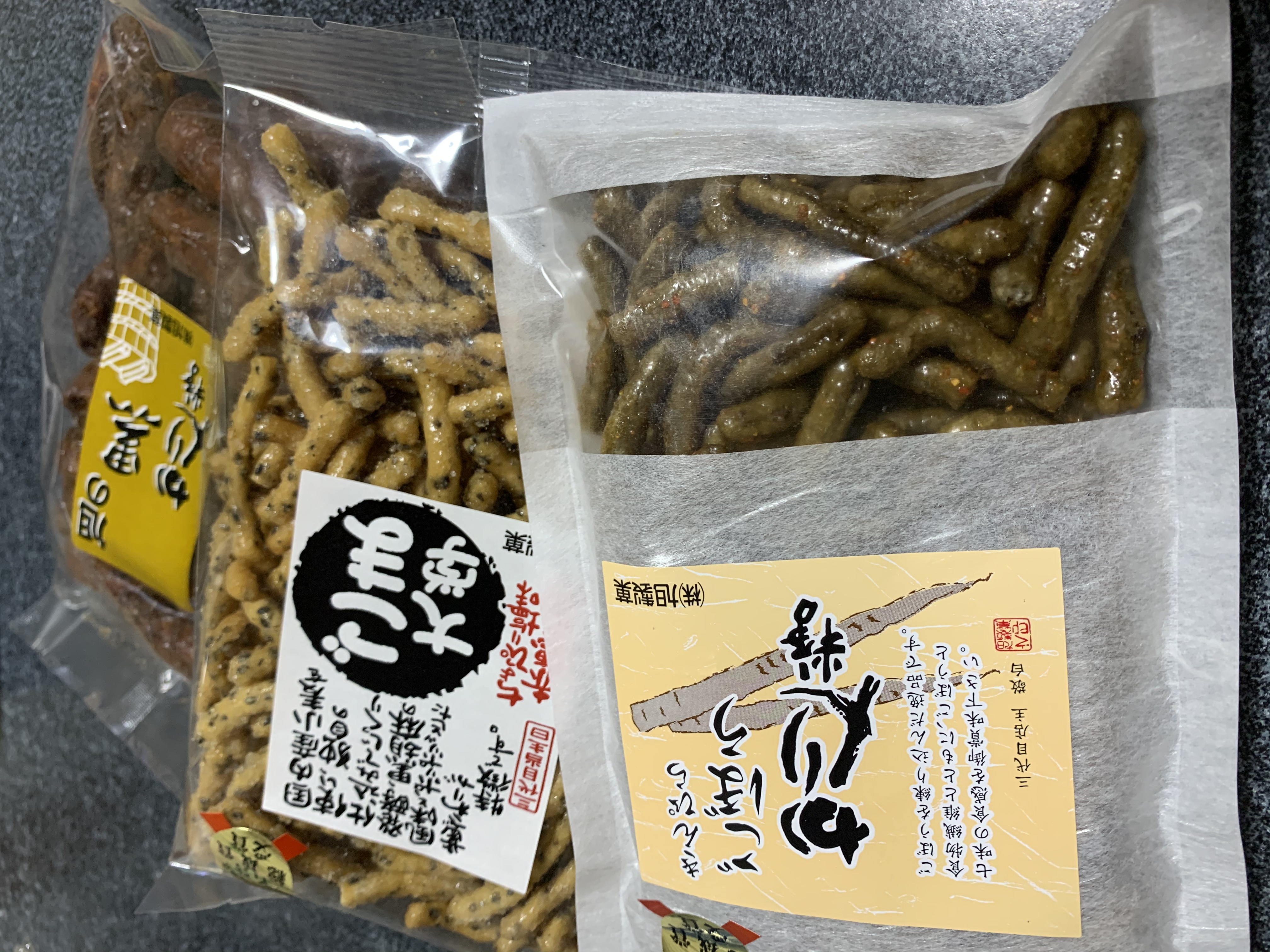きんぴらごぼうかりん糖:ほかのかりんとうとはまた別のおいしさツイッター。ごぼうの香りが良くします。ごぼうのかりんとうは初めてでしたが、クセが強くなくて食べやすかったです。まわりについた七味がぐっと味を整えていてとても好みのあじでした。甘さと辛さ、マッチしていました。