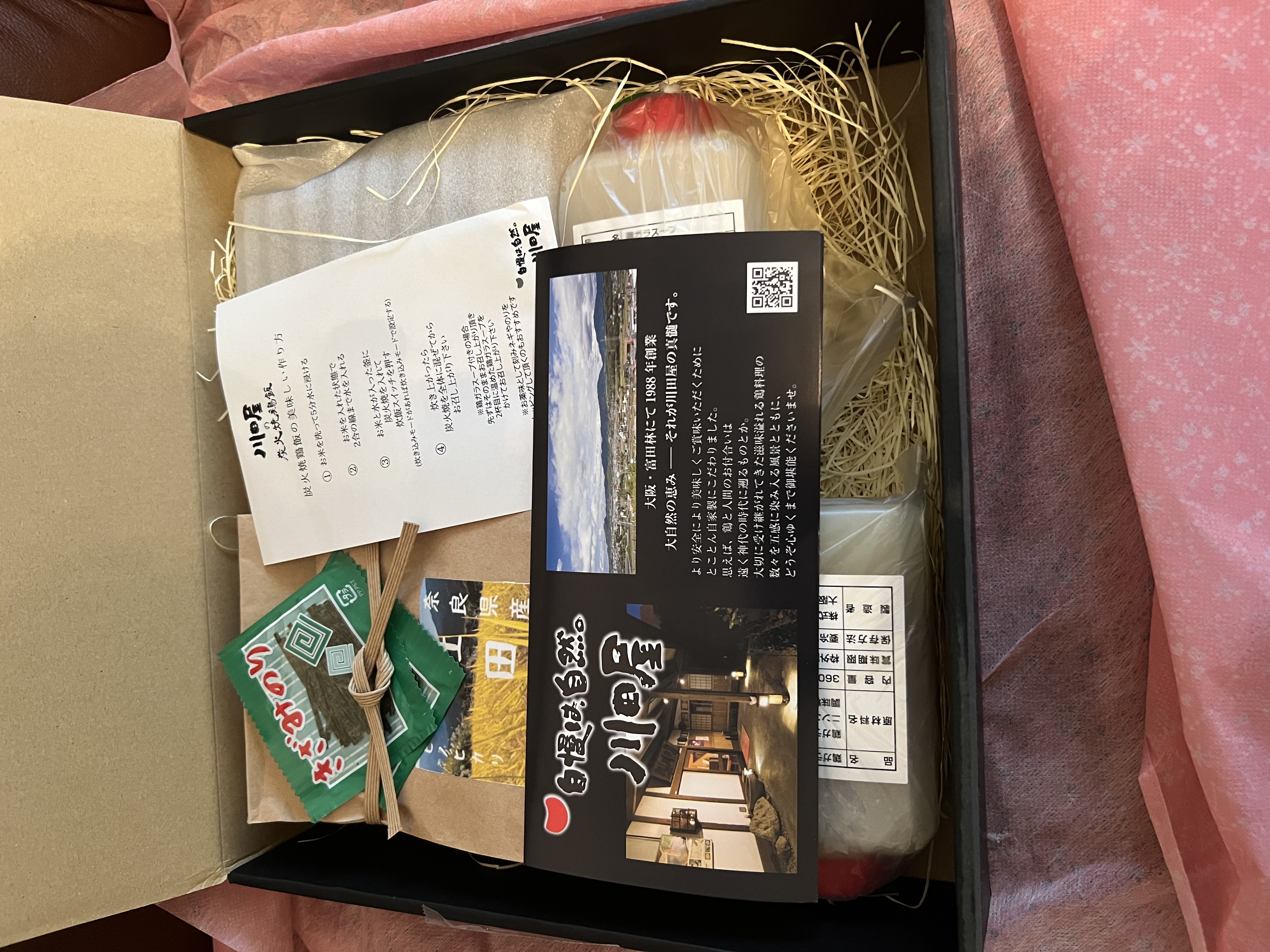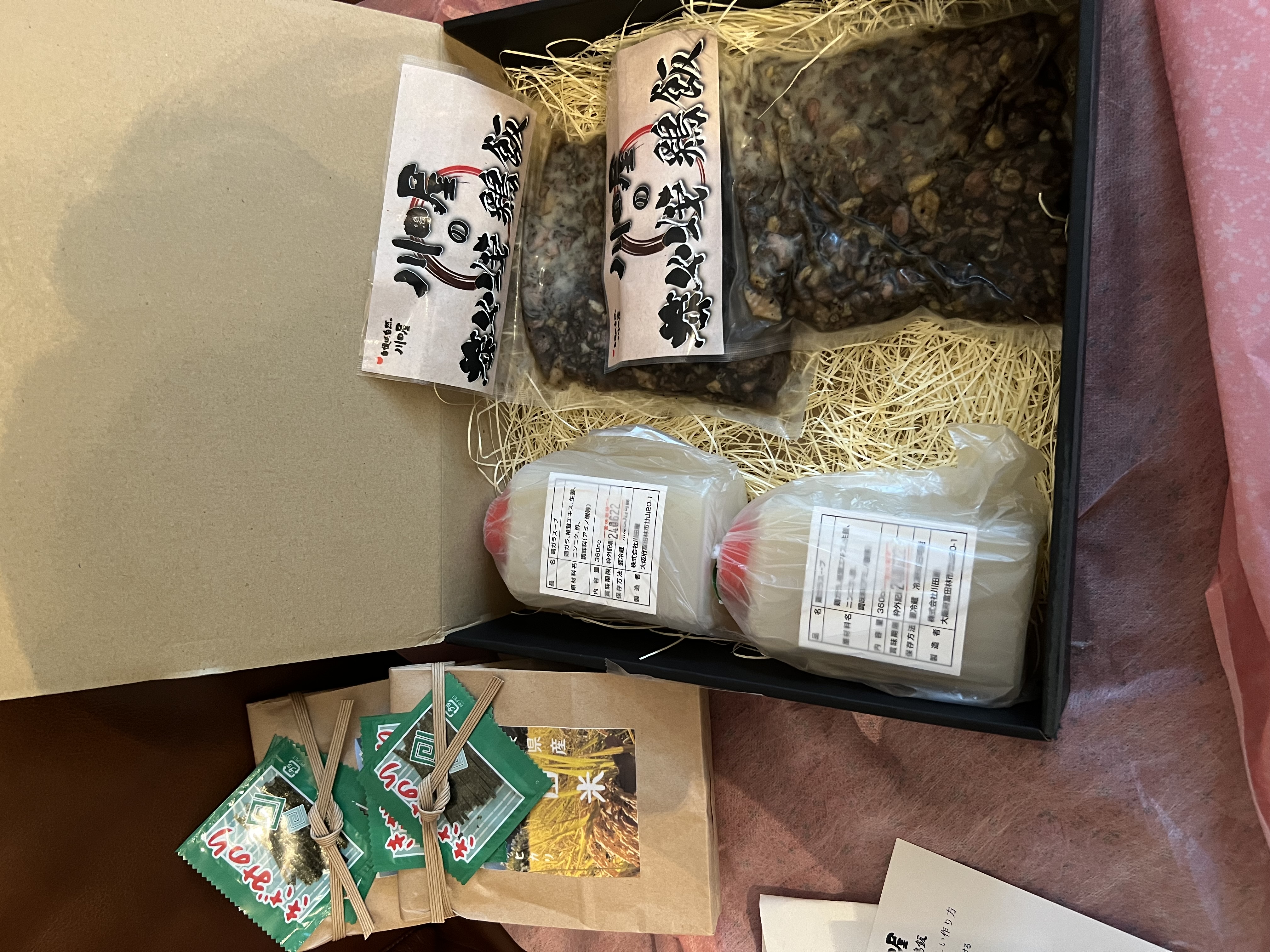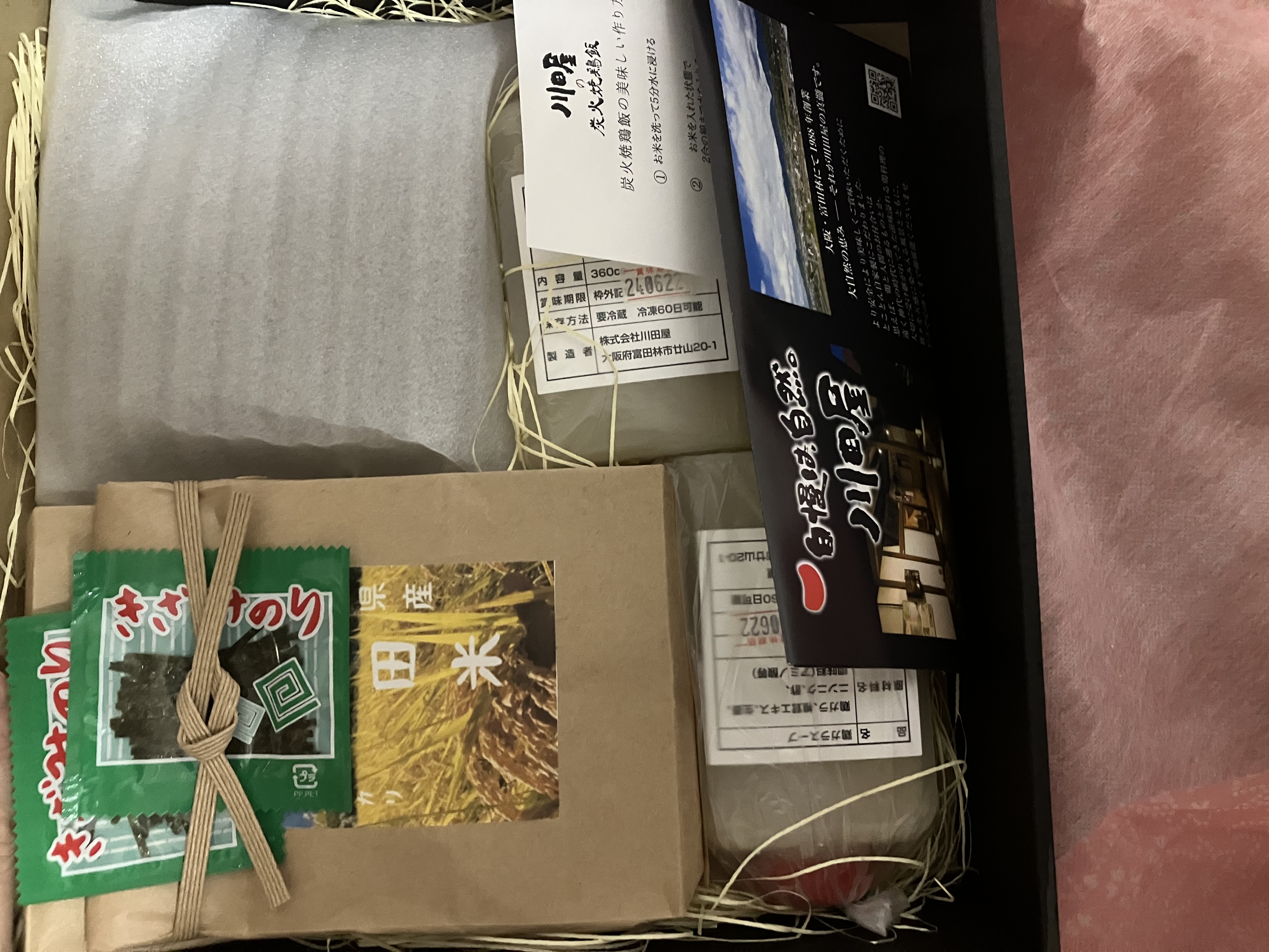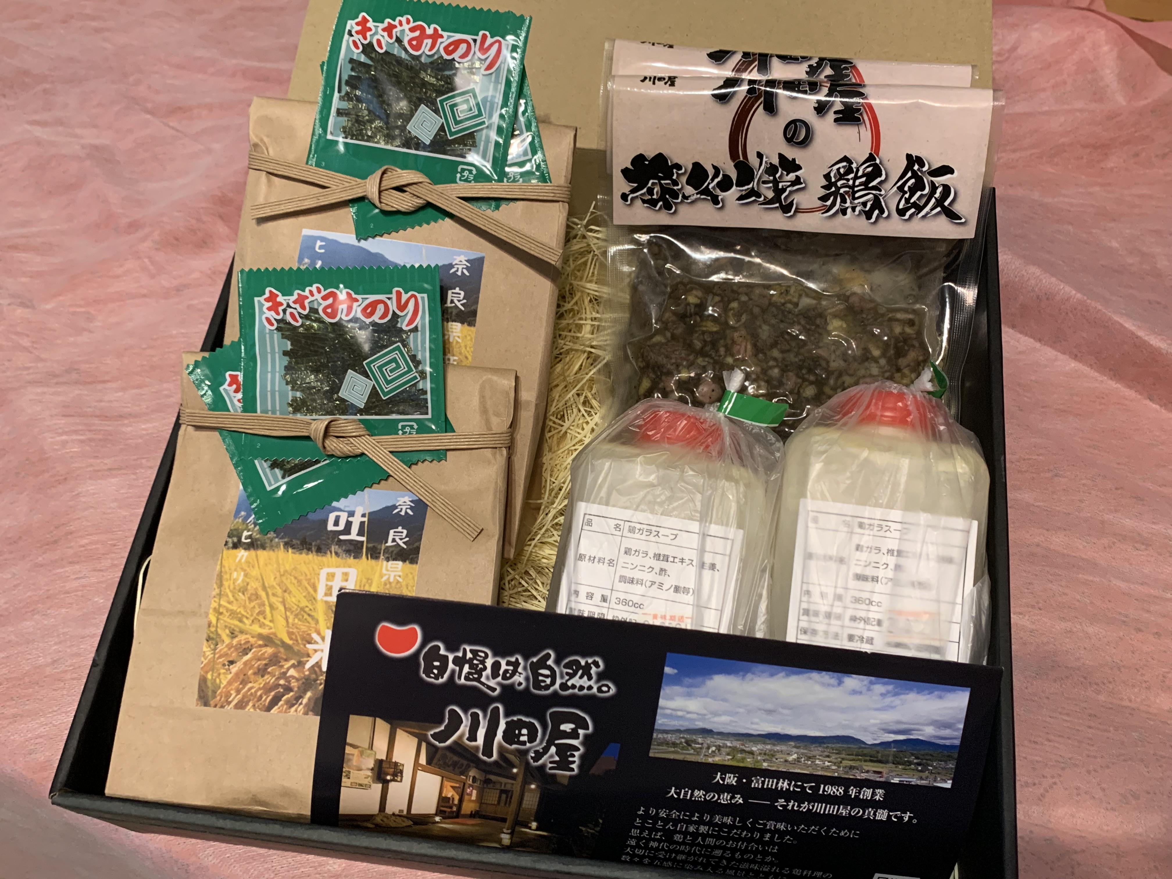 風呂敷を解くと、お米・焼き鳥飯の素・スープ・きざみのり のセットが入っています