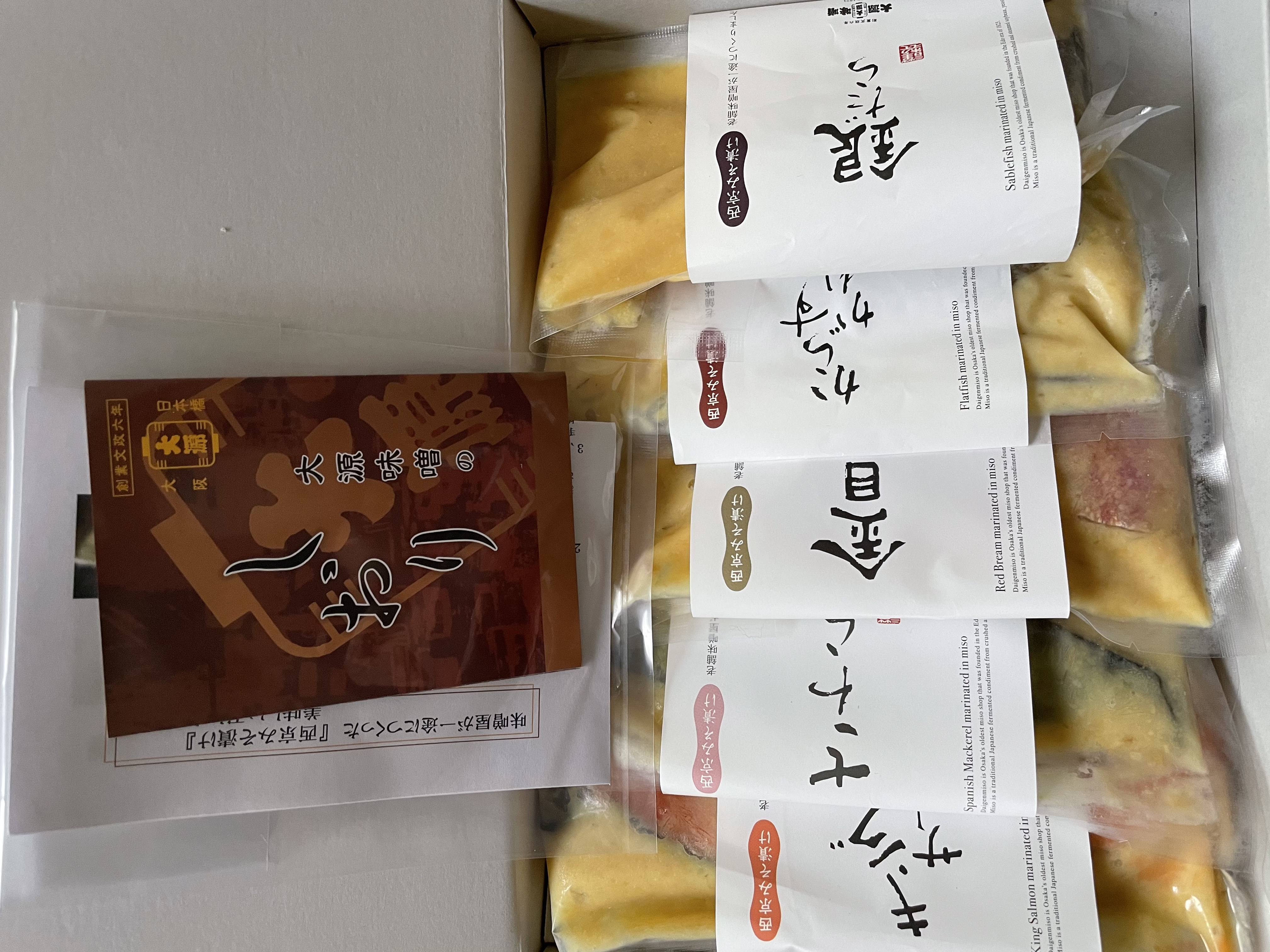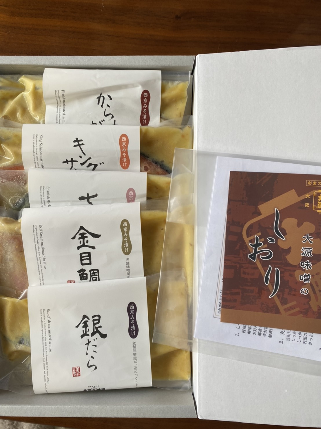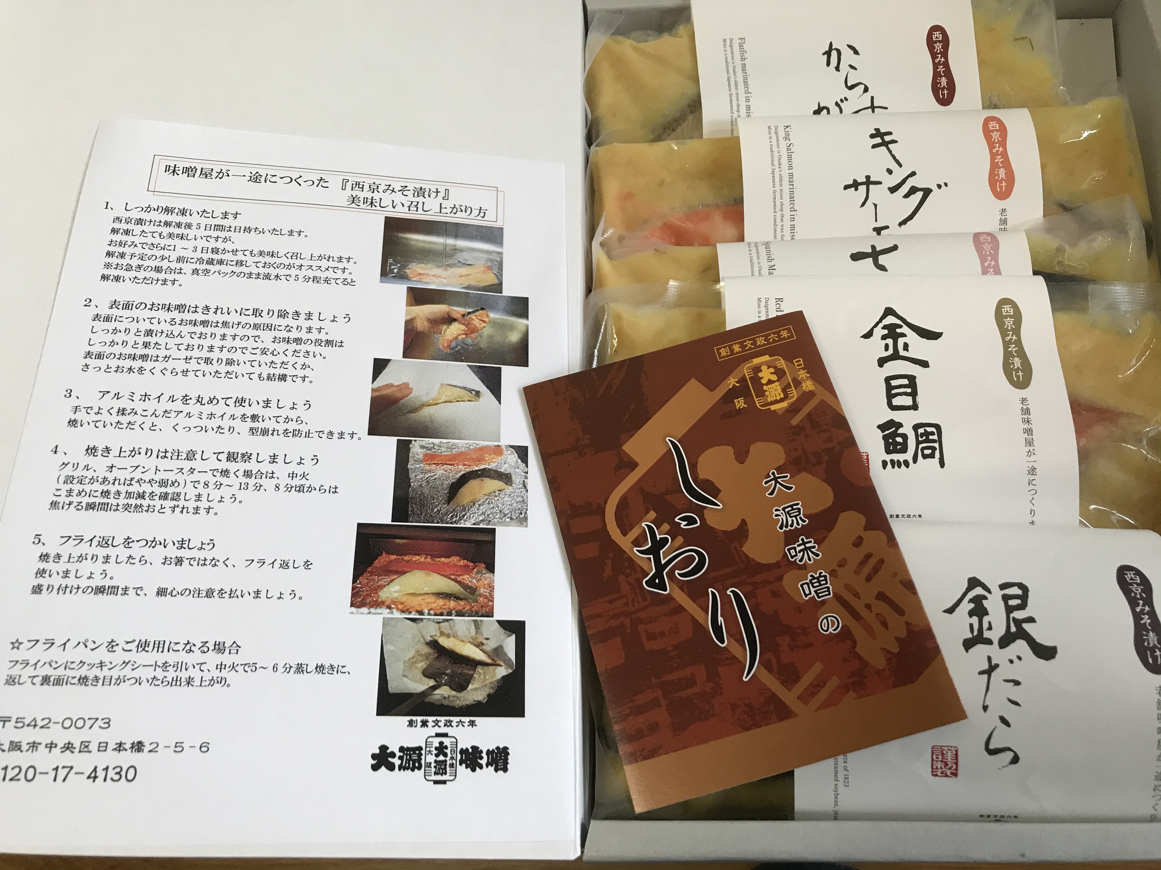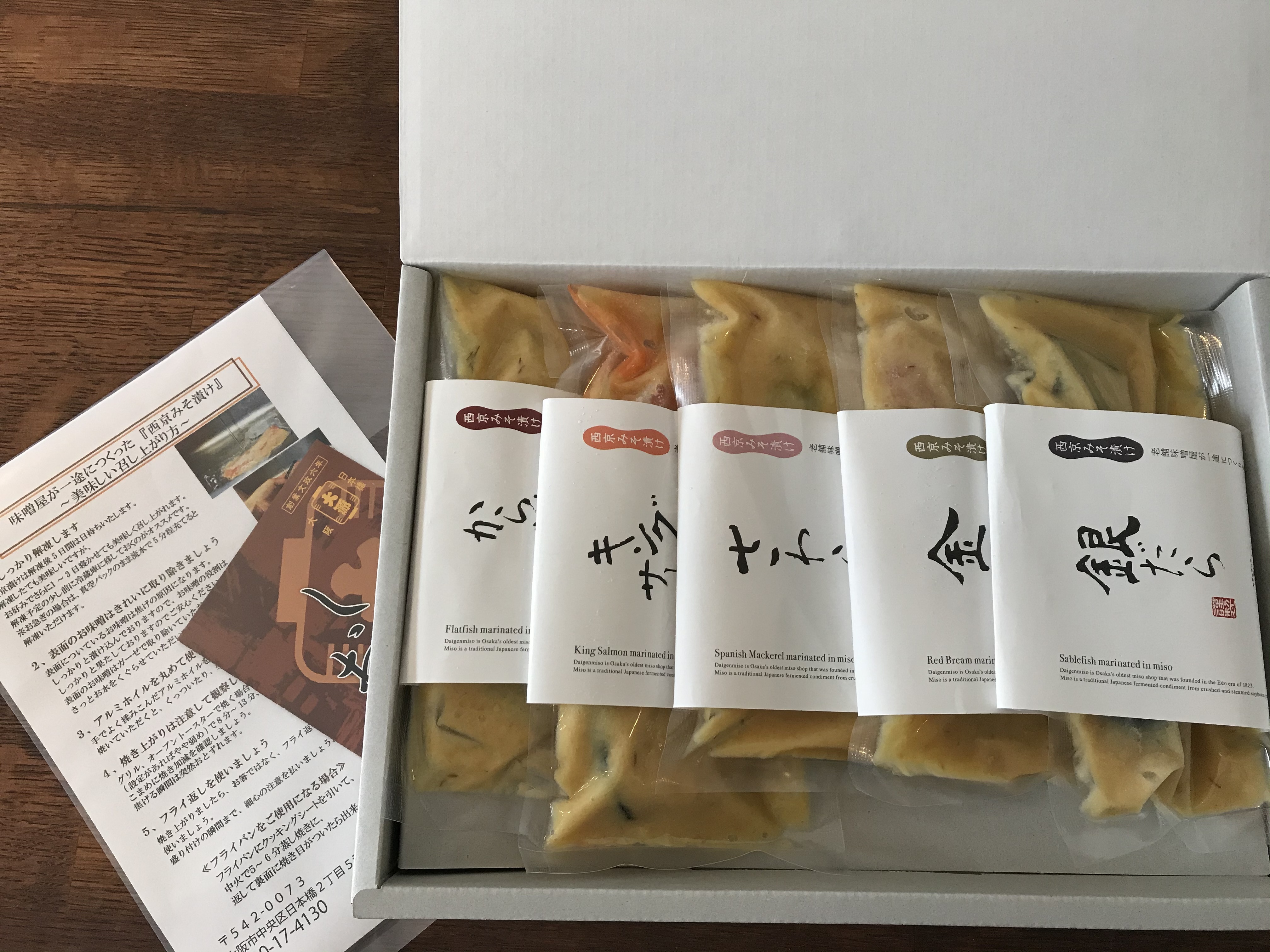 •セット内容としてサワラ、銀ダラ、キングサーモン、金目鯛、カレイの各一種ずつ。焼き方の説明書も書いてあります。