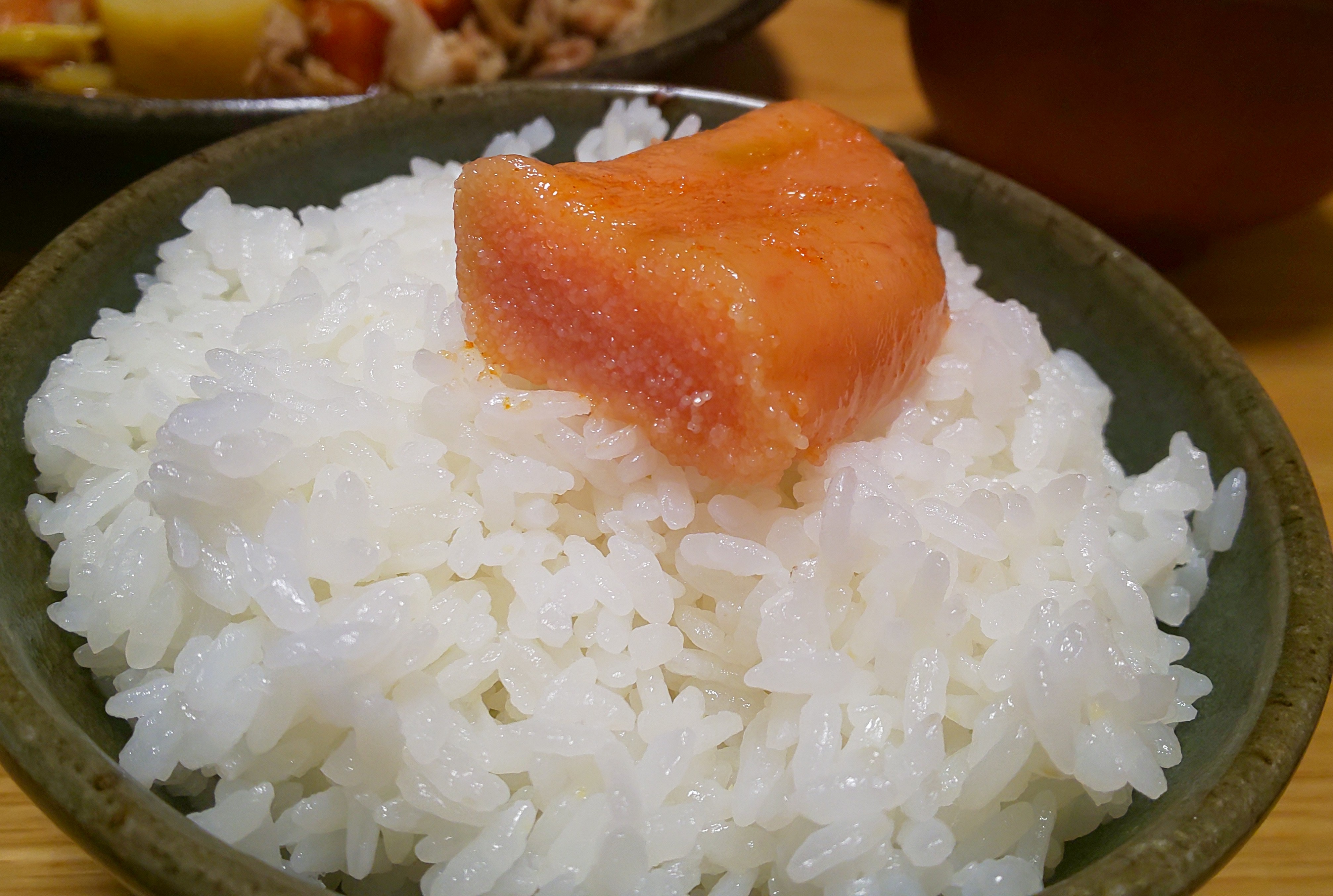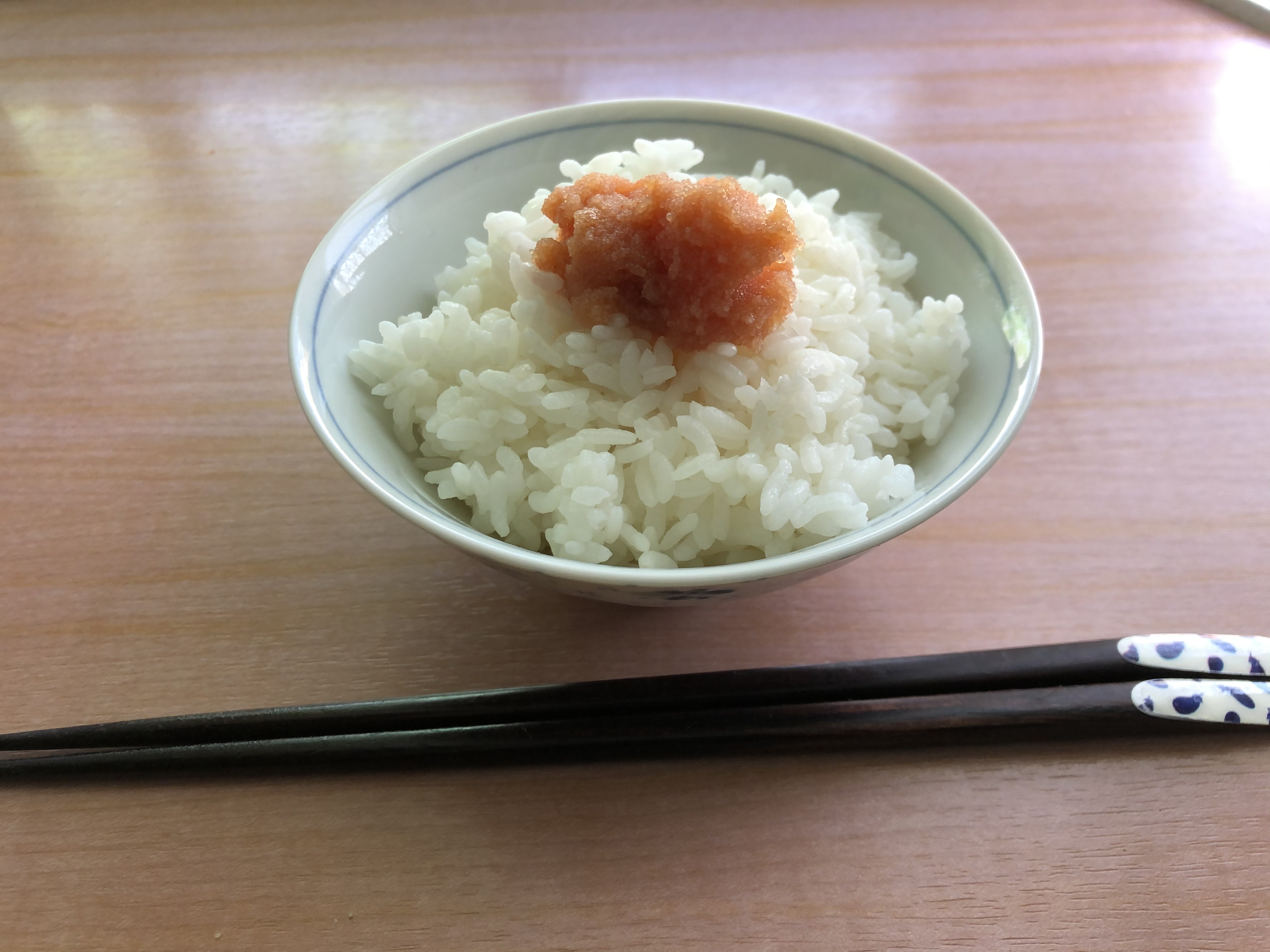 そんなことを調べ感動していたらご飯が炊けたので、炊きたてご飯に辛子明太子を乗せて、ご飯と共に頂きました!!