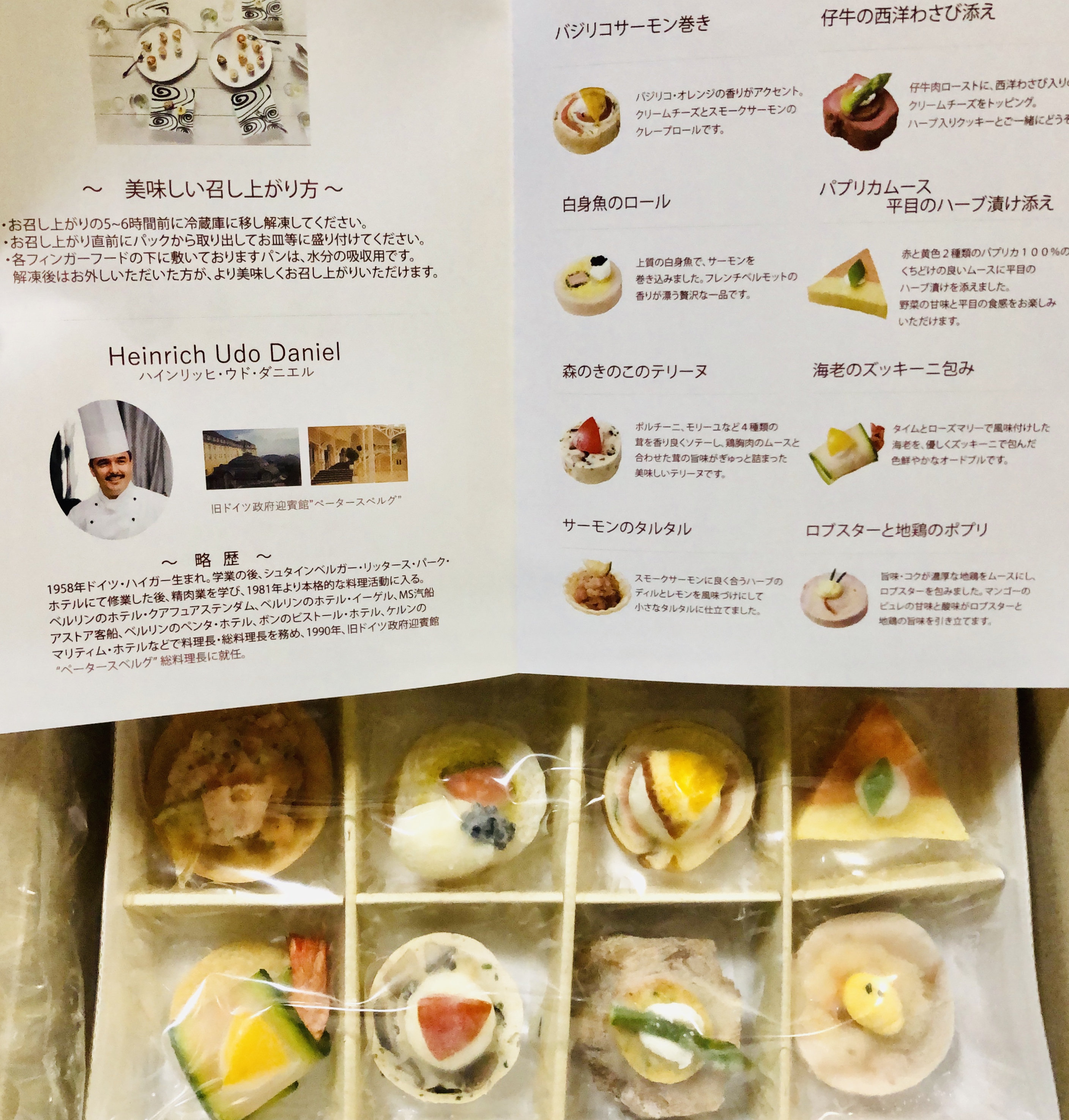 ドイツ政府迎賓館「ペーターズベルグ」の元総料理長オリジナルレシピでつくりあげた、目にも鮮やかな一口サイズのフィンガーフード。世界の国賓をもてなしたメニューを再現しました。フィンガーフードとは、手でつまんで食べられる料理のことで、前菜として利用され、パーティーでは欠かせない料理の一つです。様々な食材を使い、彩り豊かに一口サイズの嗜好を凝らしたフィンガーフードが、記念日や特別な食事を華やかに演出します。