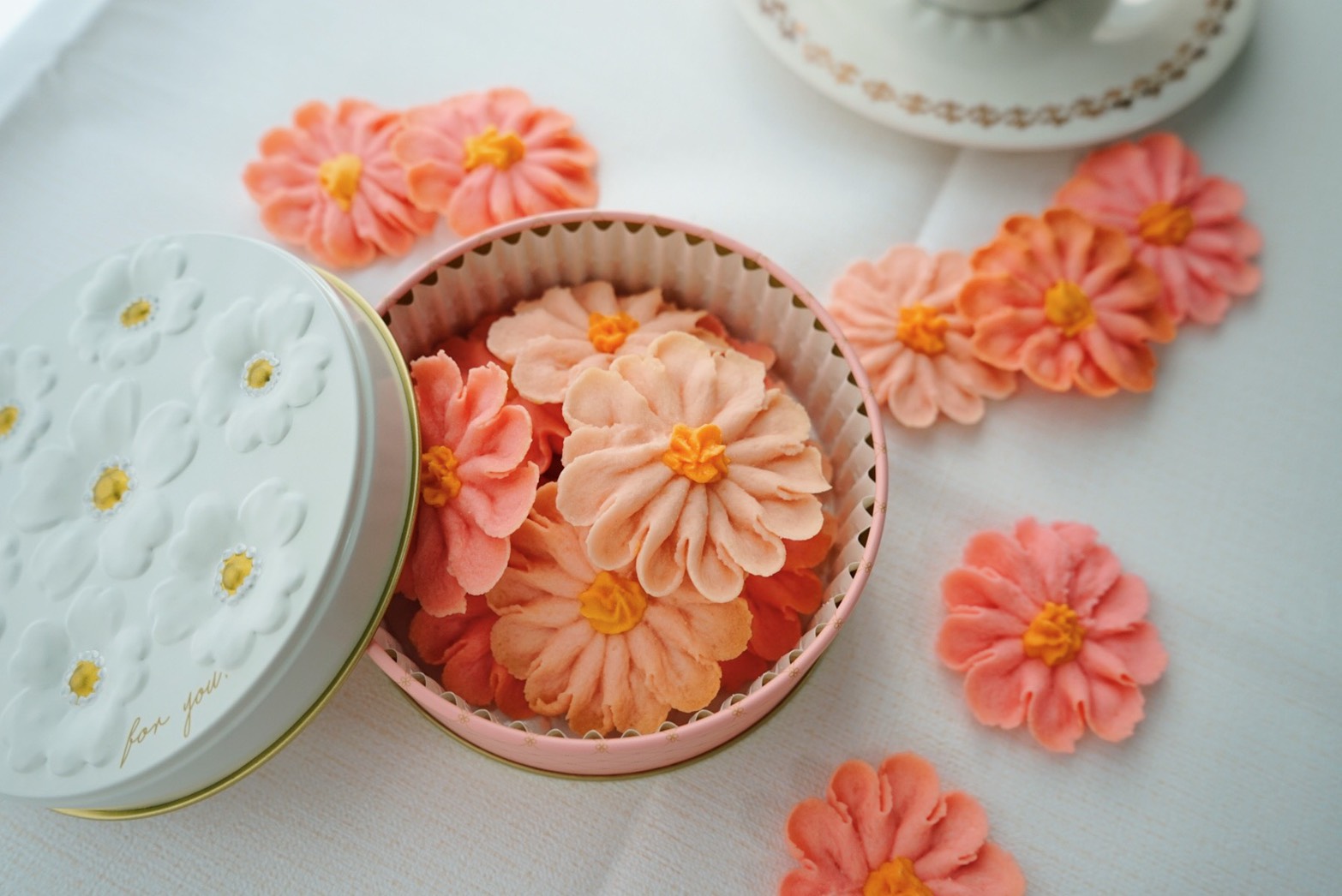 白とピンクの可愛い缶に詰まった「お花のぼうろ・コスモス」です。ぼうろは、玉子を使った丸い焼き菓子のことで、江戸時代の初期には、京都で「花ぼうる」の名称の菓子が食べられていたそうです。北海道産の白あんや、牛乳、卵使用し、コスモスモチーフの「花ぼうろ」は、サクサクほろほろとした食感で、あんこの素朴な甘みと、絶妙な塩気がくせになります。お花モチーフの缶に入った「花ぼうろ」。味だけでく見た目もおすすめな、インスタ映えスイーツです。