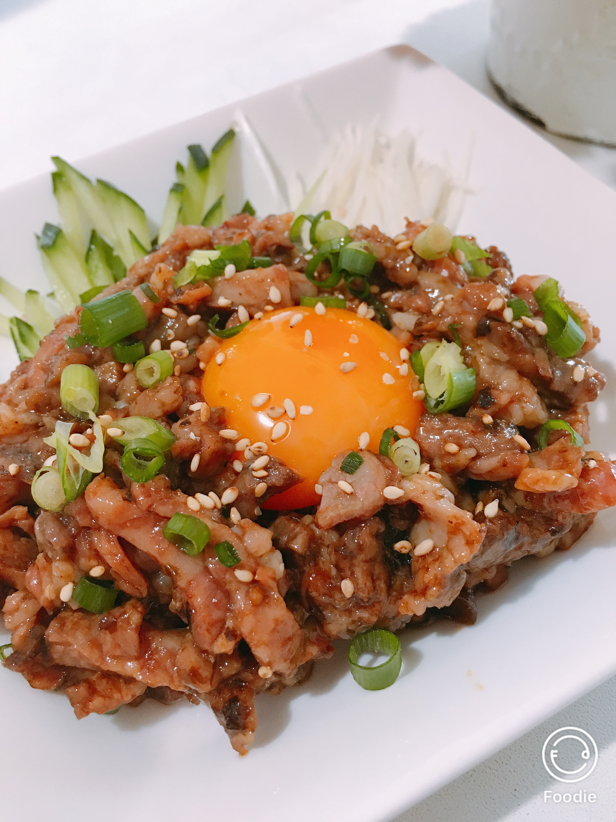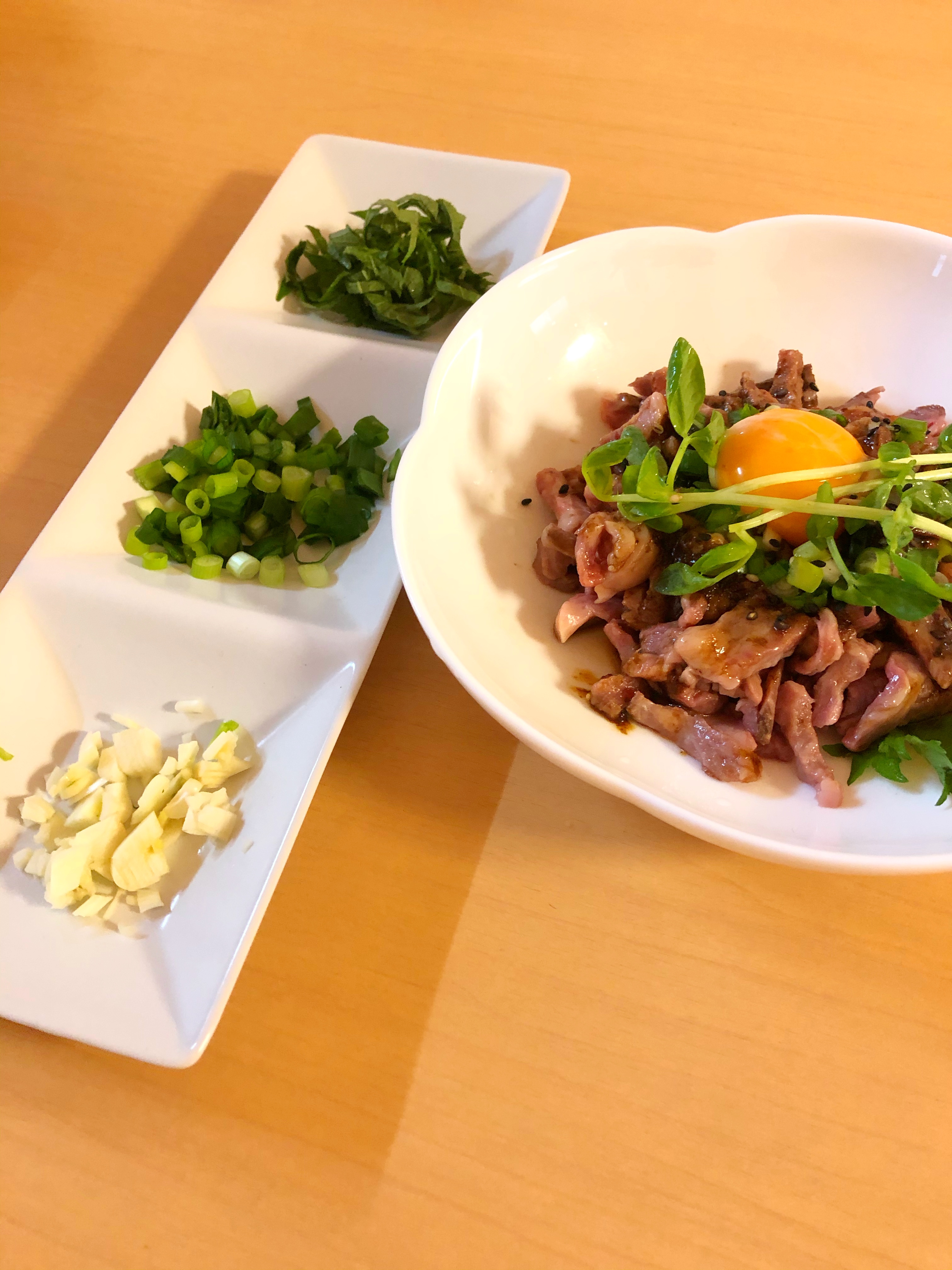 卵黄と薬味(大葉紫蘇や葱、茗荷etc..)を上に乗せ、周りにお好み量のユッケソースをかけるてお召し上がりください。