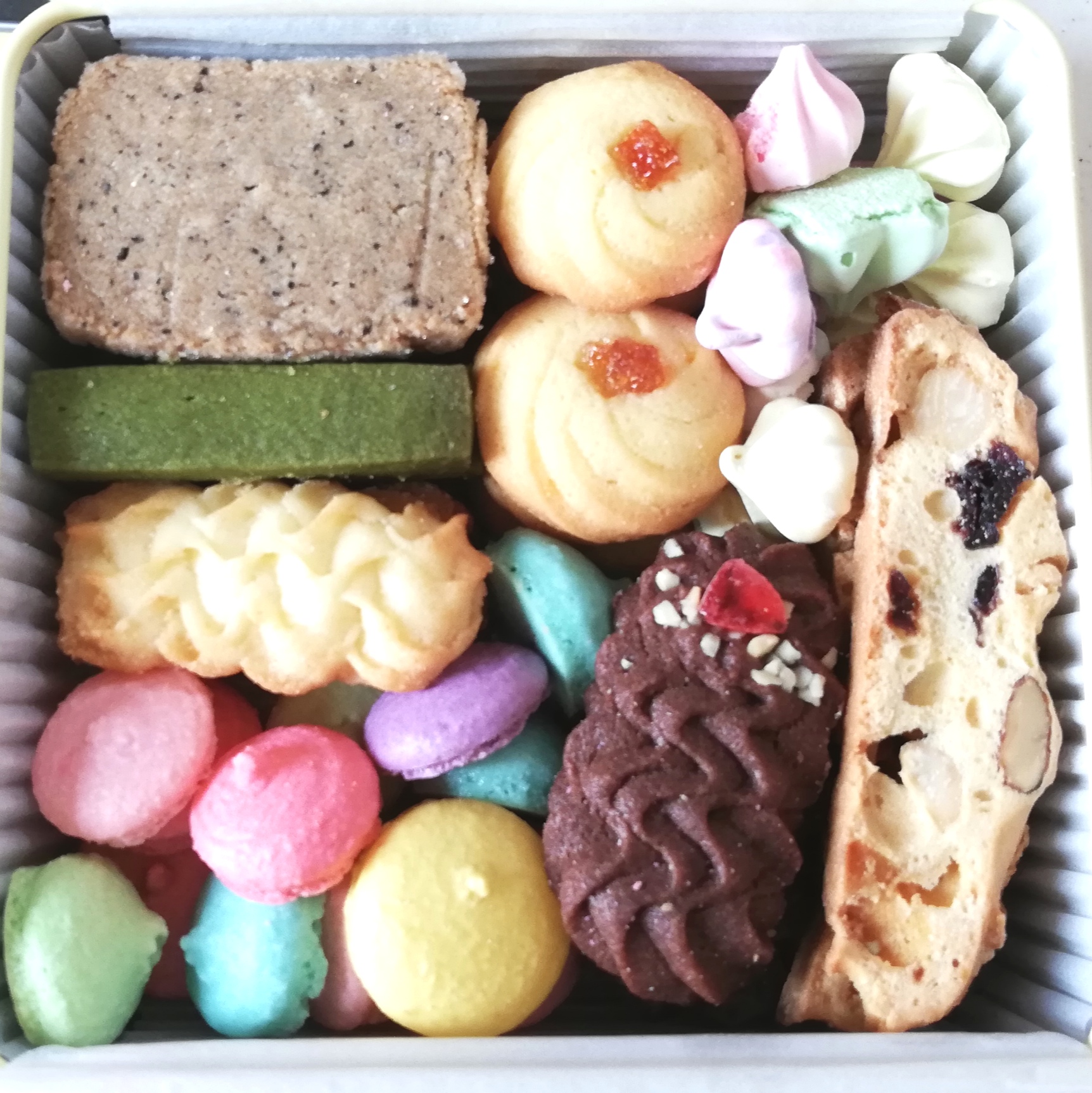どきどきしながら、缶を開けると…美味しそうなクッキーのおとなりに、ぱあっと鮮やかなマカロンやメレンゲ。おひとつずつお箸で(笑)お皿に並べても…可愛い!クッキーだけ、カラフルな子たちだけでも並べて、眺めて楽しんじゃいました♪