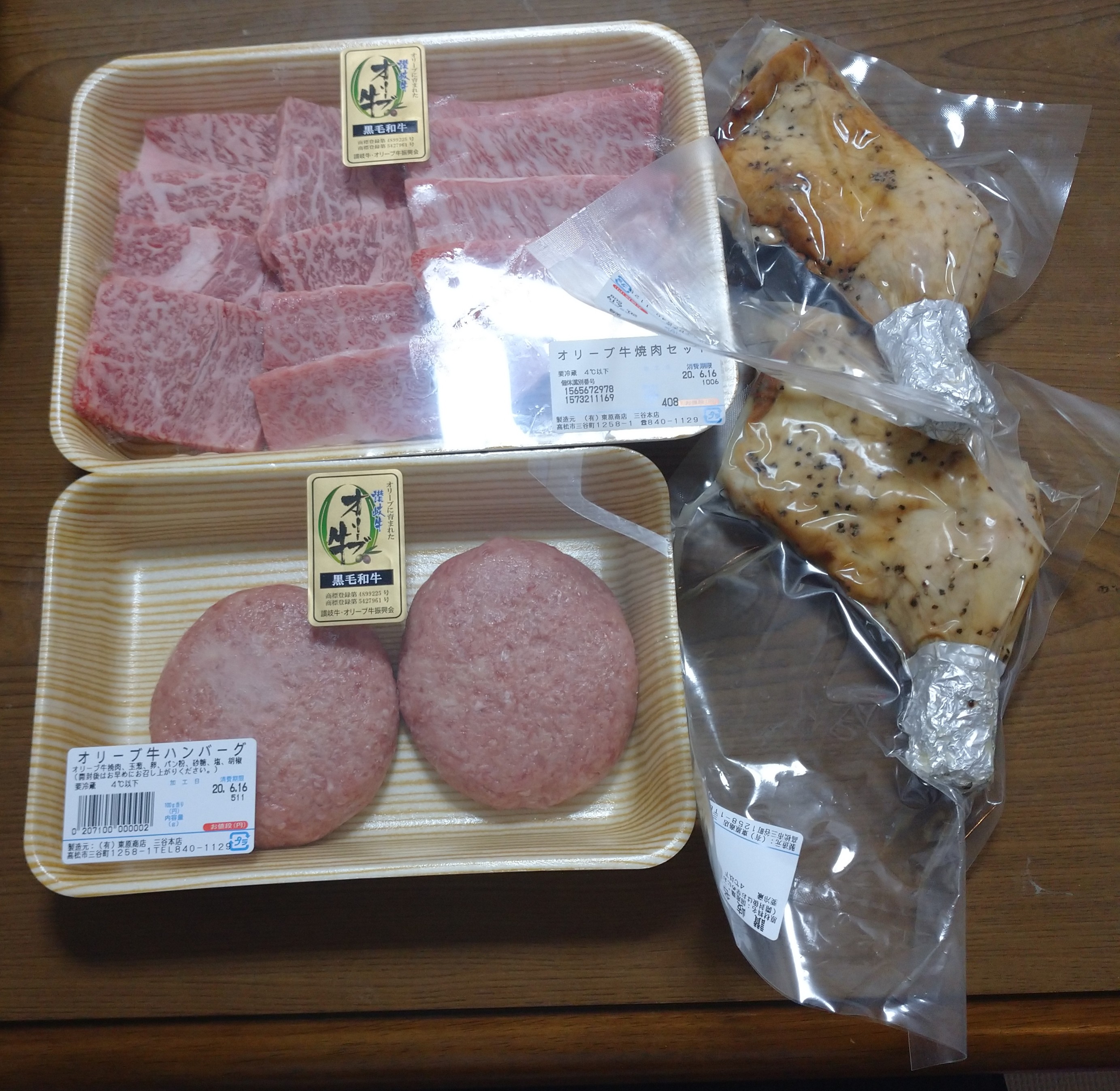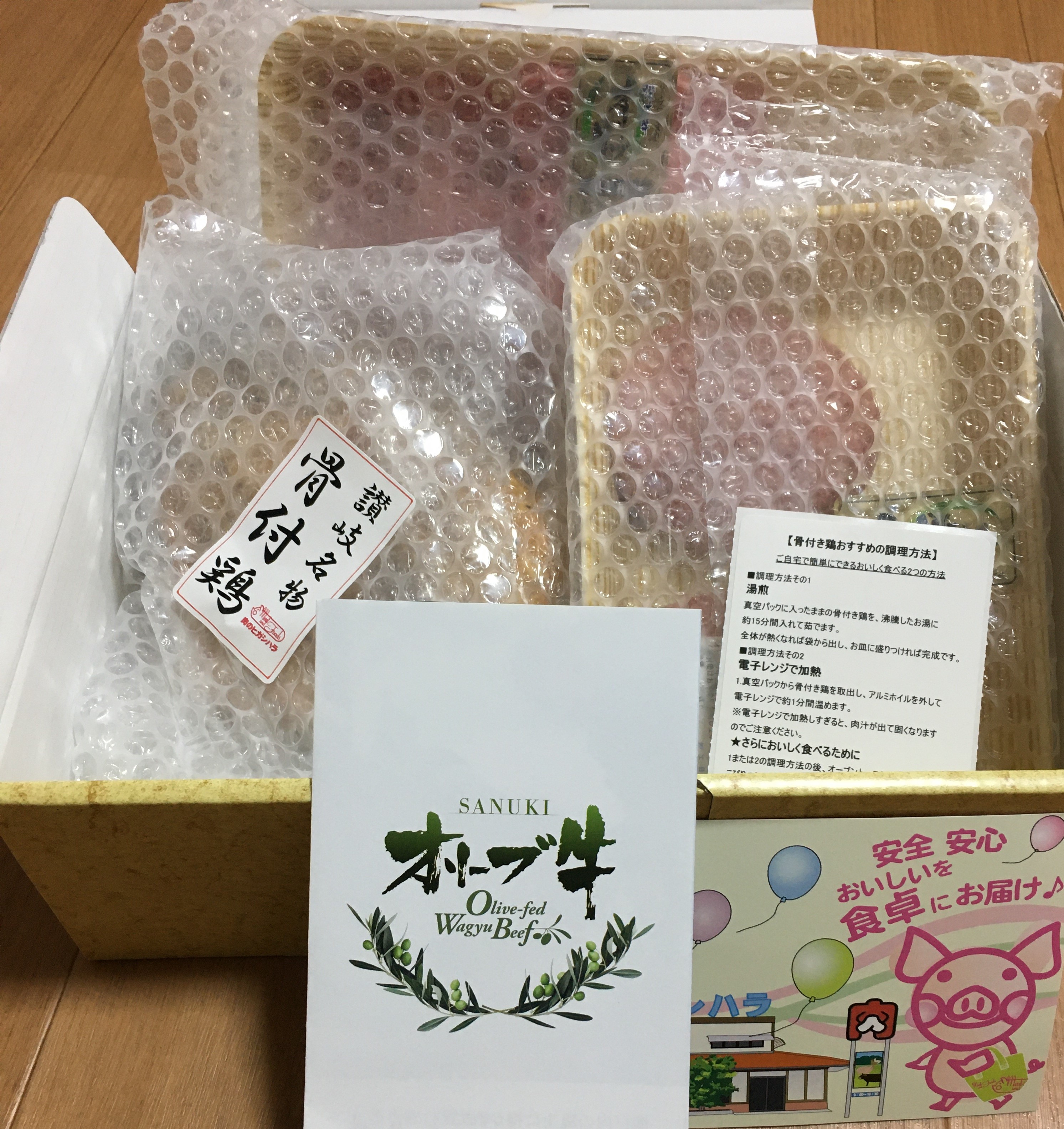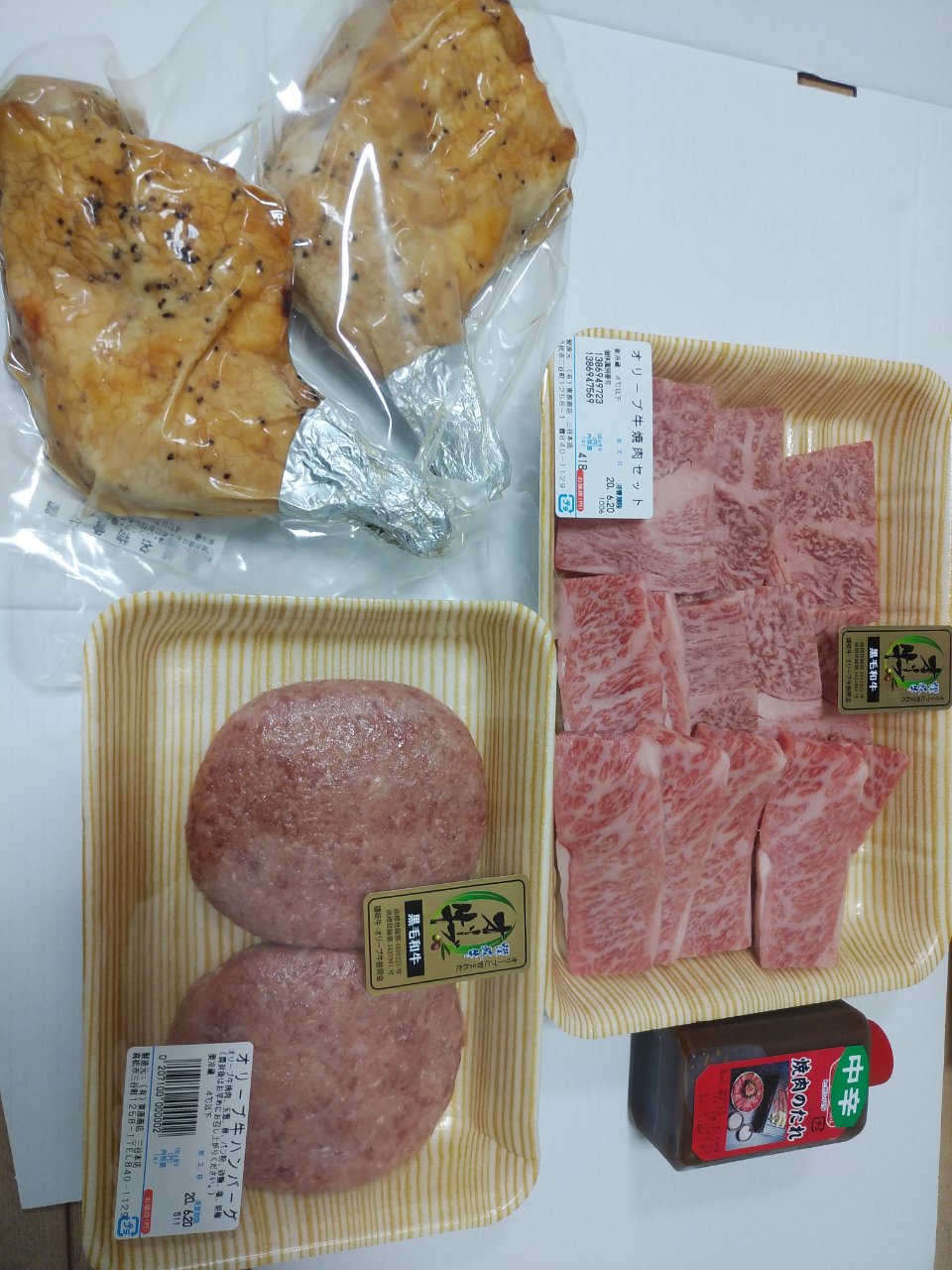 ギフト用の紙箱の中には木目調のトレイに入った焼き肉とハンバーグ、骨付き鶏は真空パック。