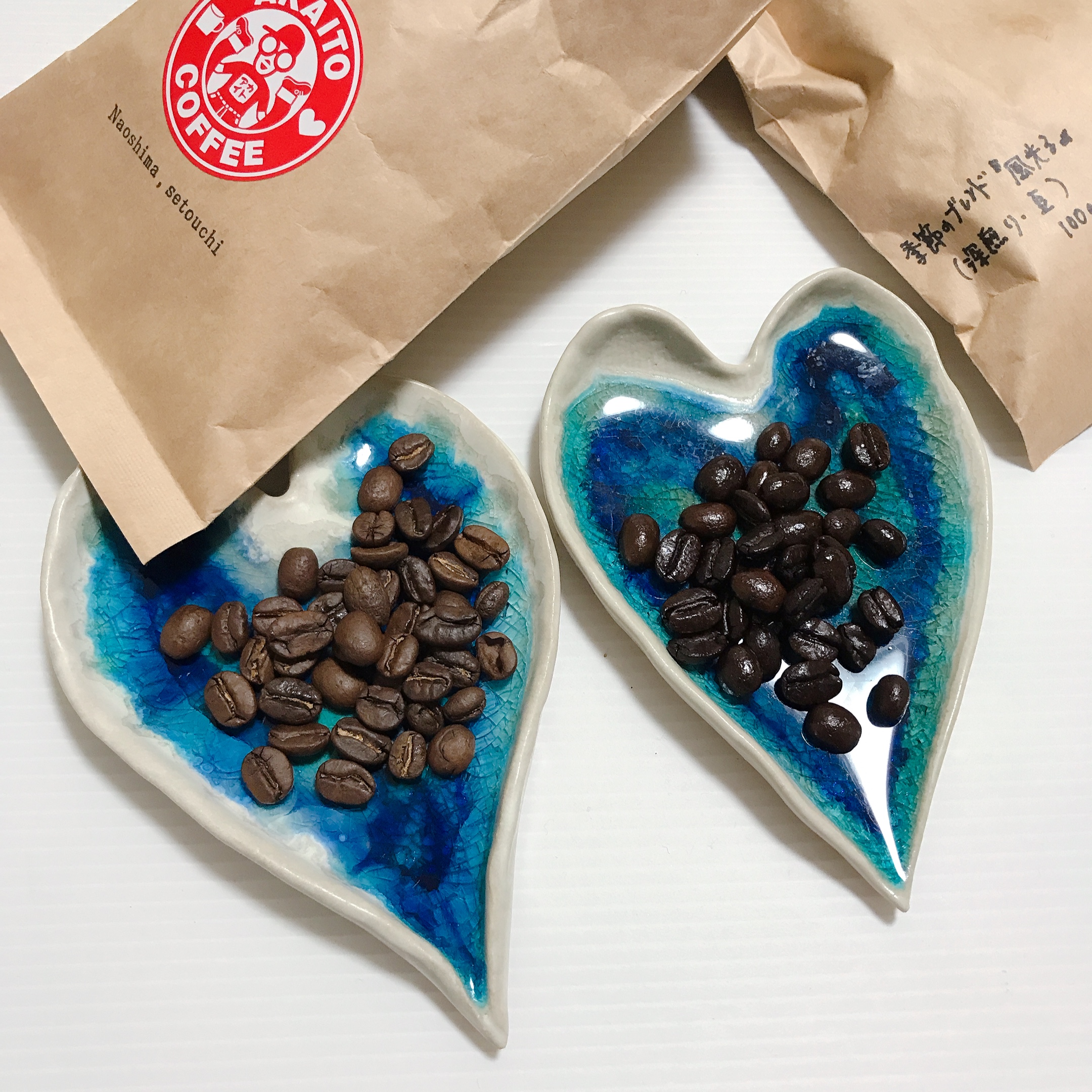 小型手回しロースターを使用して少量づつ焙煎した「コーヒー豆」のセットです。「アカイトブレンド」は、ブラジルとコロンビアを主とした中深煎りのブレンド。やさしい口当たりのコーヒーは起き抜けから身体にすーっと染み渡ります。特別ではなく日常に寄り添えるコーヒーです。「季節の深煎りブレンド」は、焙煎度の違う3種類の深煎り豆をアフターミックスしました。甘みと、コクのバランスが特徴であるながらも季節の味わいを感じられるすっきりした味わいです。焙煎したての豆で届くので、引き立ての香りを自宅で楽しめます。