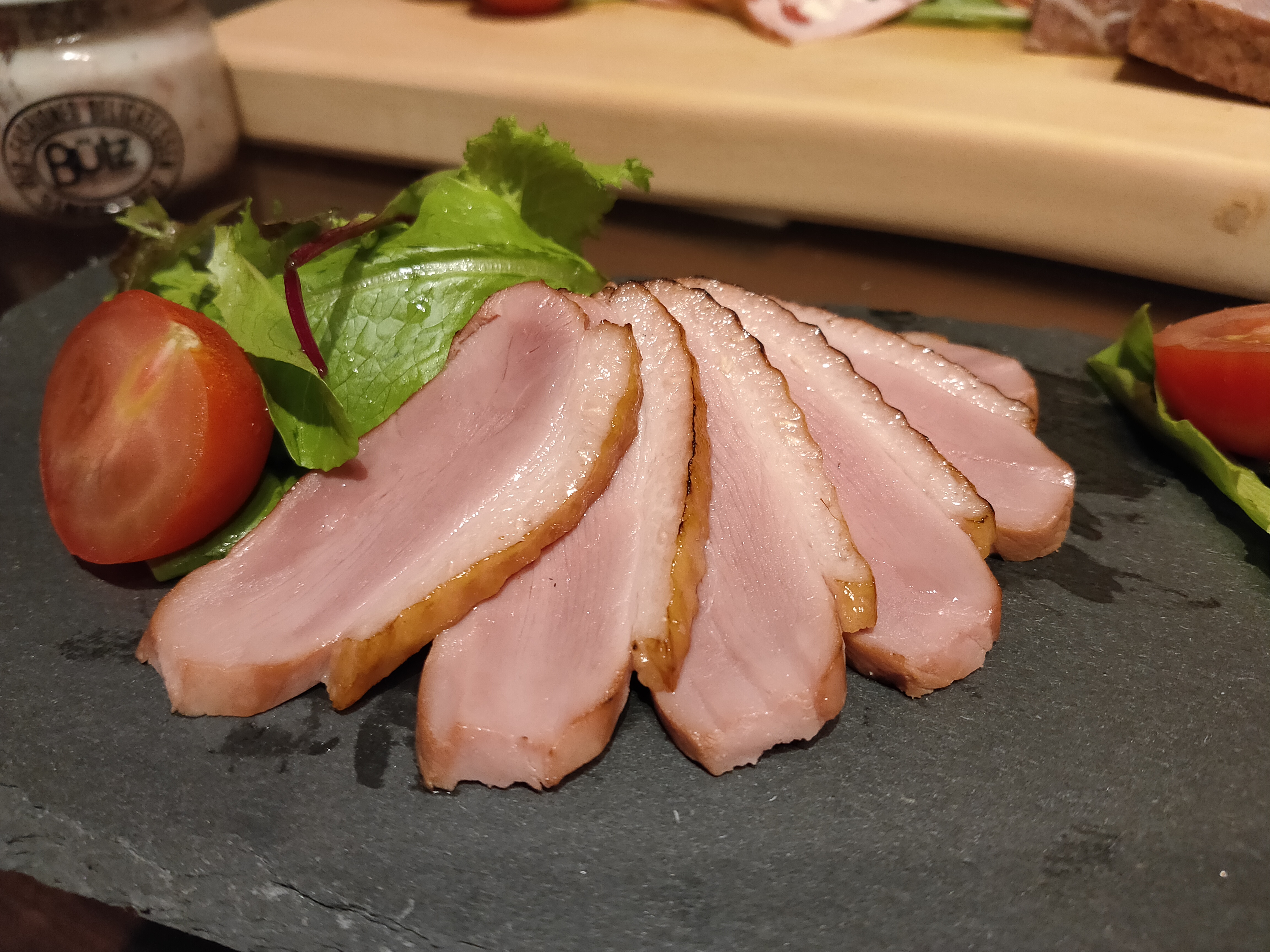 合鴨のスモークは軽くあぶると、脂が溶け出しより美味しくお召し上がりいただけます。