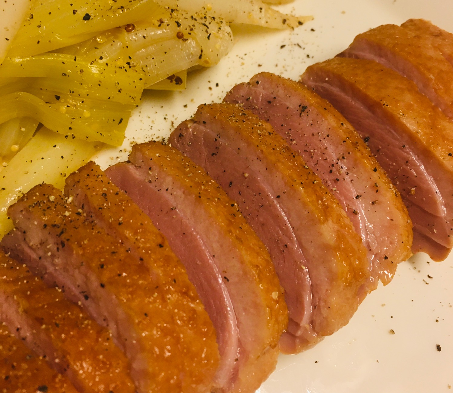 お料理としての鴨は、低温調理のフレッシュな肉感が好きなので、期待と不安が大きかった合鴨のスモークですが、いい意味で裏切られる一品でした。軽くオーブンであたため、フランス風付け合わせとして、ポワローネギのヴィネグレットを合わせました。薫製の風味と食肉としての合鴨の微妙なバランス、弾力のある食感、ワインにぴったりの塩気。よくある薫製ハムの凡庸なニュアンスはなく、職人さんの技巧の確かさが味わいに反映された見事な逸品です。