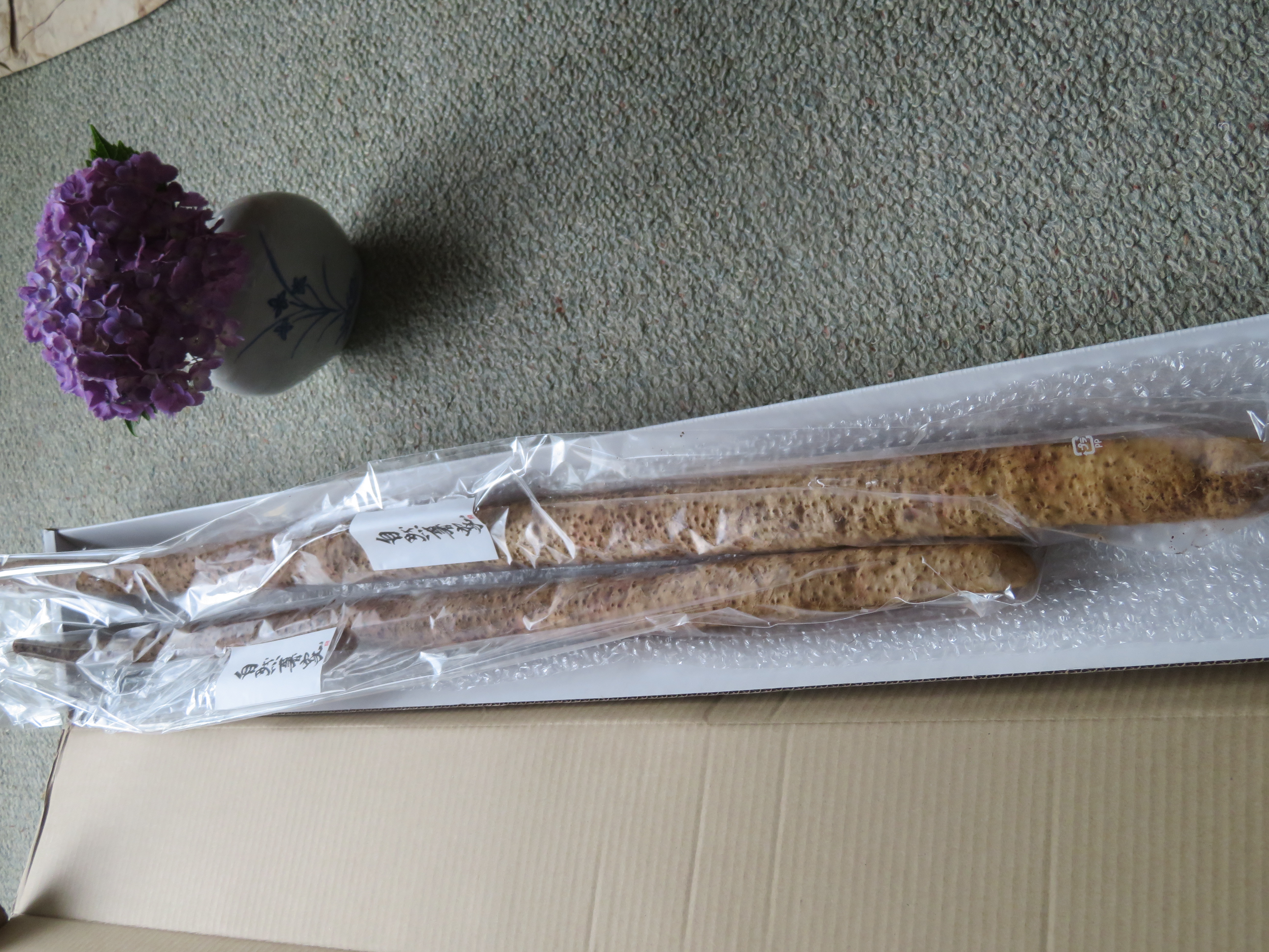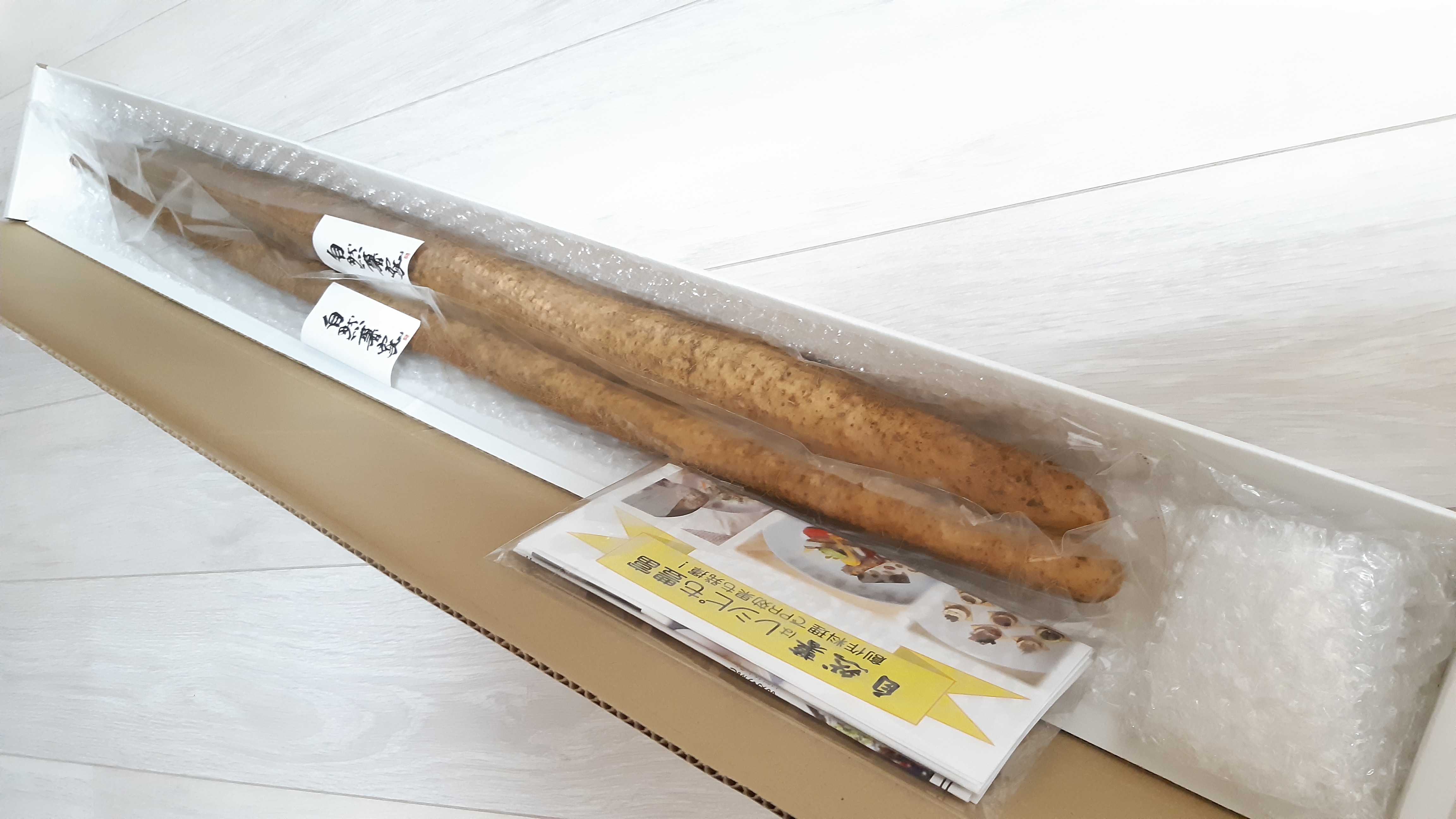 開けてびっくり!!想像以上に太い自然薯が…なんと2本!申し訳ございません…大きさにびっくりしました。そんな自然薯をまずは自然薯鉄板と自然薯の磯辺揚げにしました!