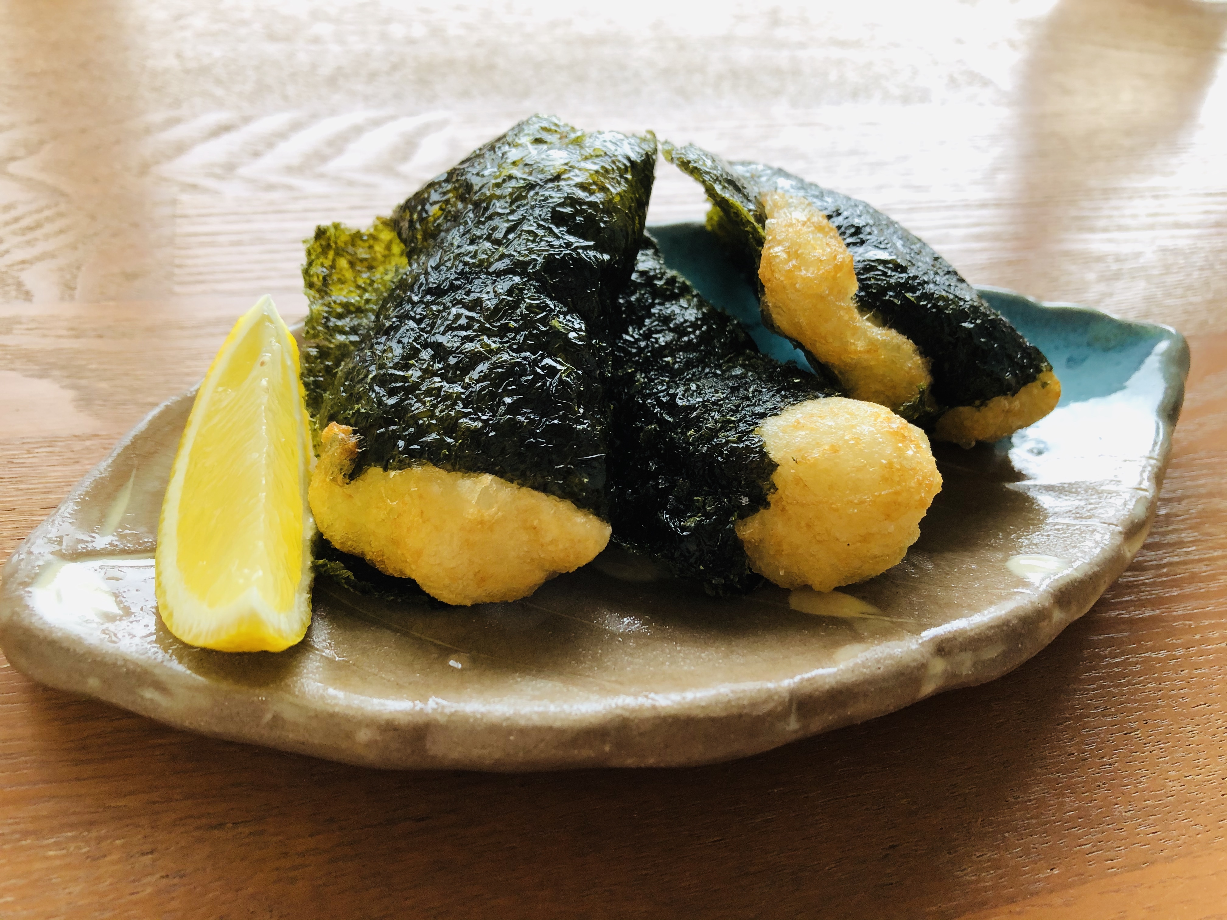 自然薯鉄板は真ん中にうずらの卵を落とし、磯辺揚げには海苔で巻きカラッと揚げてみました!!