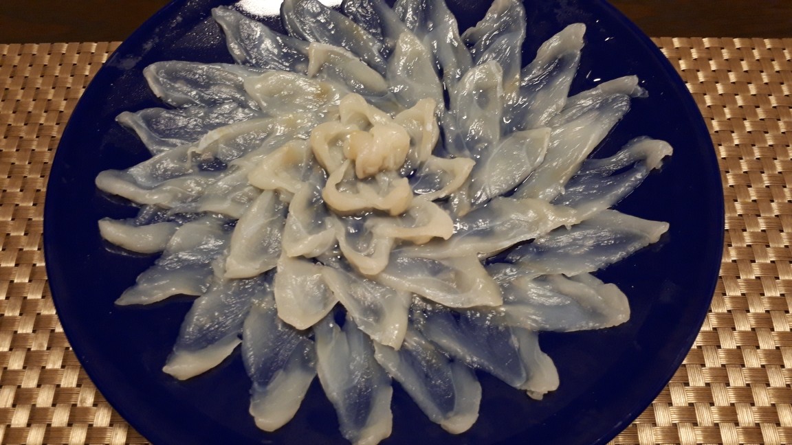 下関のふぐは伝統的に熟成させて食されます。弊社でもふぐの刺身は丁寧に3枚卸しをして、薄皮をとり、さらしに巻いて、余計な水分を取り除きます。その際に、ふぐは熟成されて、旨味が増加されます。ふぐは、熟成されても身が柔らかくなりにくく、歯ごたえが損なわれません。刺身に1番良い時を見計らって、皿が透けるように薄く、しかしふぐの旨味が充分に感じられる厚さに仕上げています。ぜひ天然のトラフグをご賞味ください。