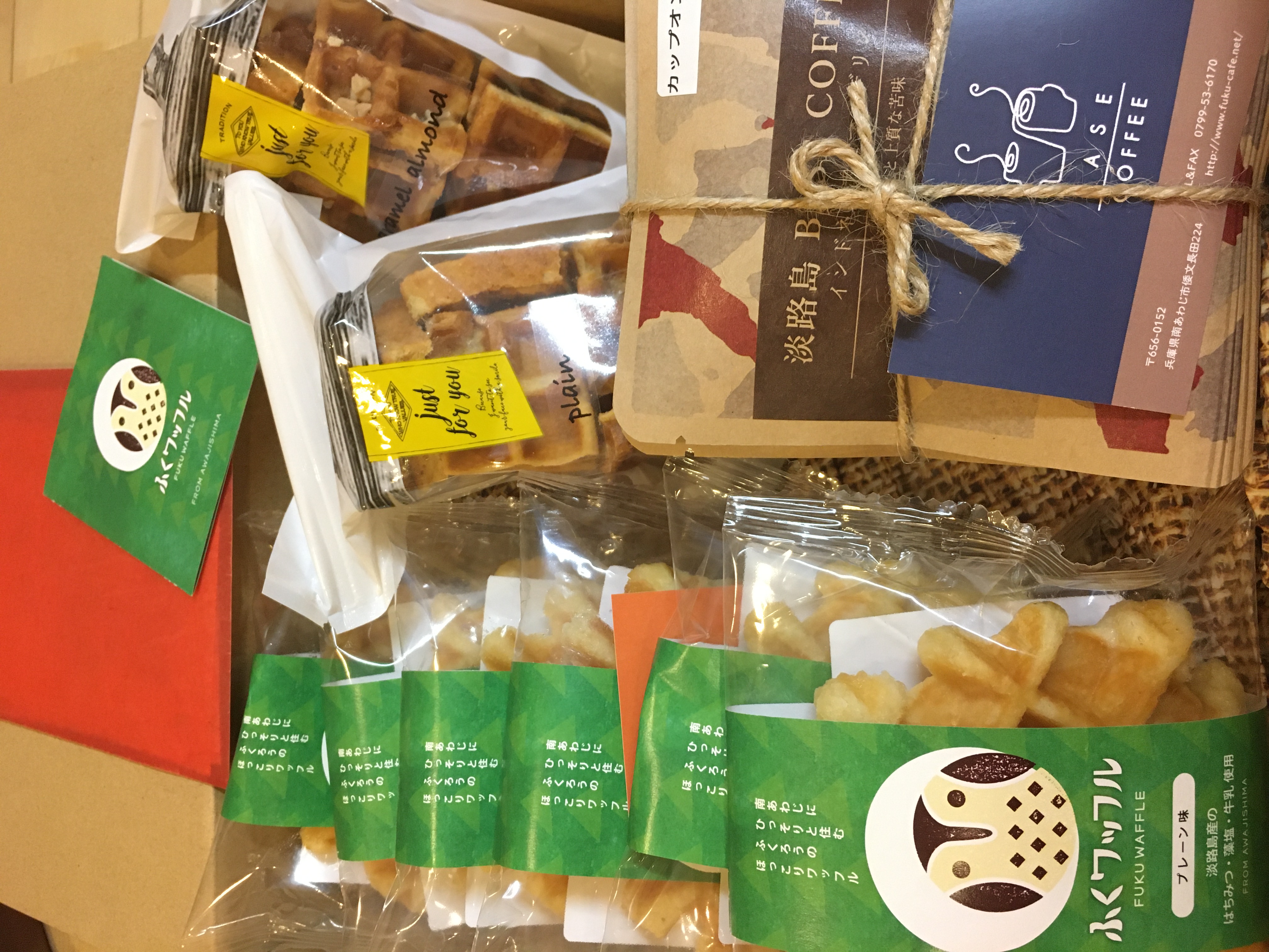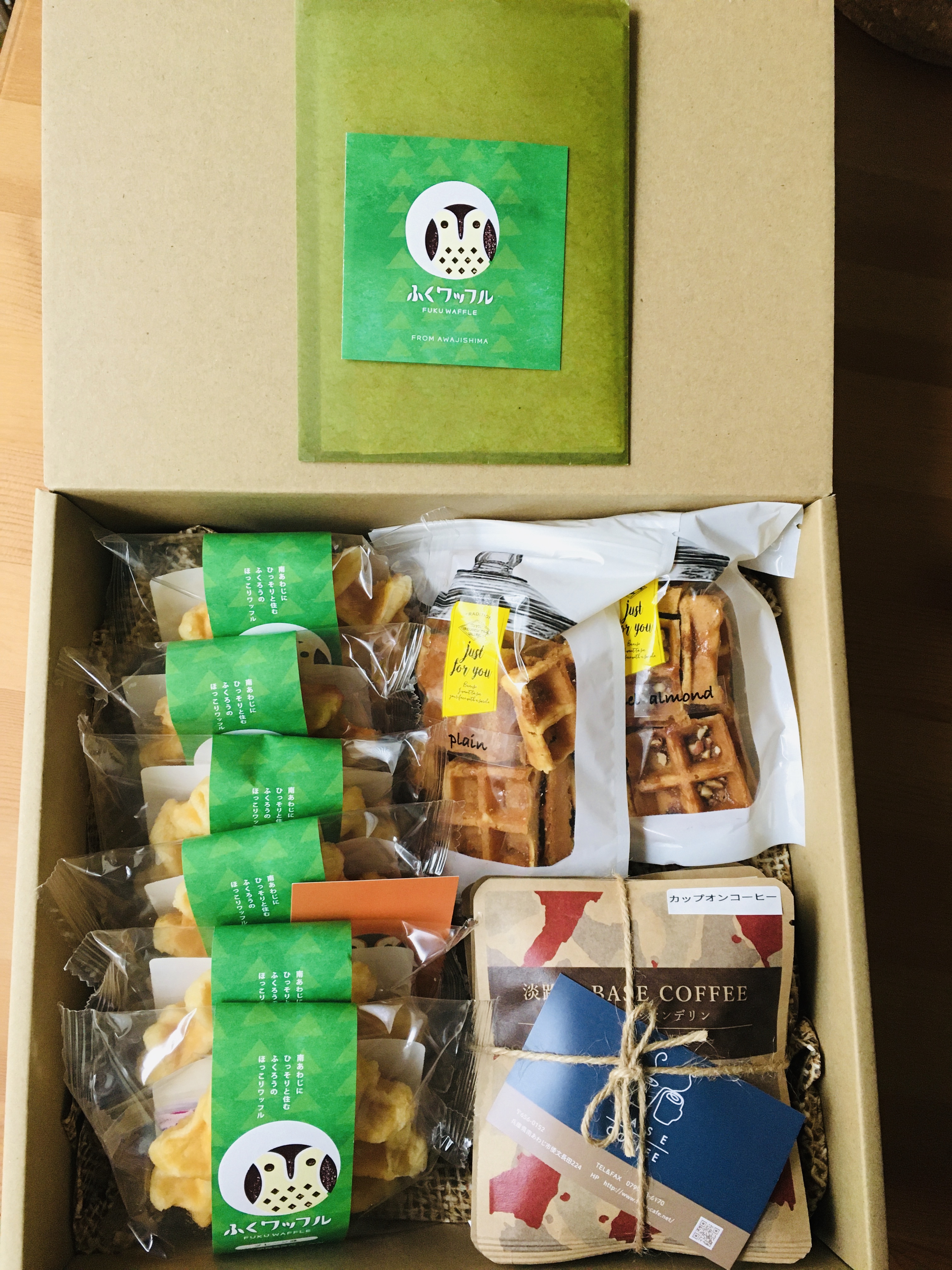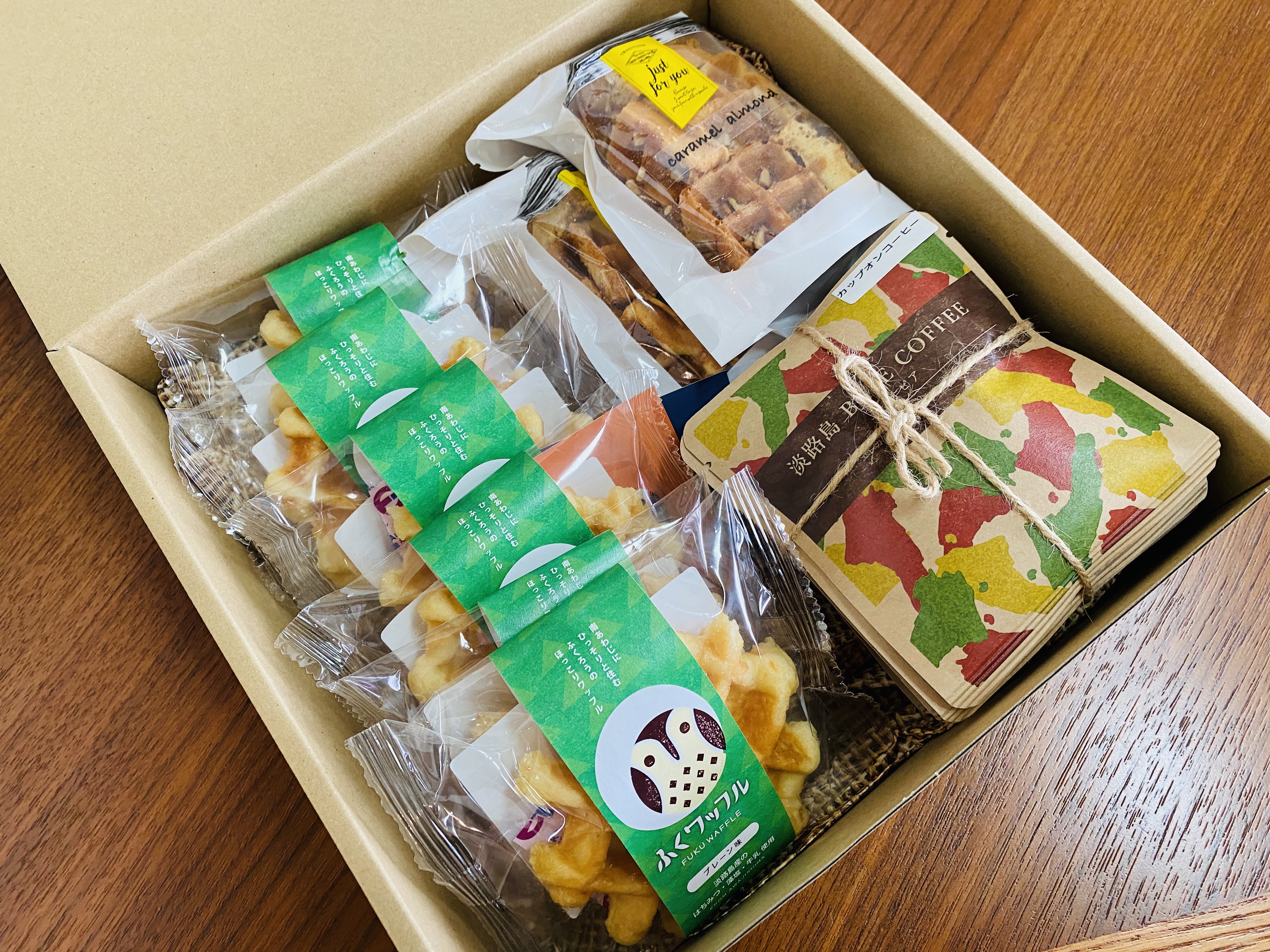 フクロウのモチーフが印象的な、スイーツとコーヒーのセットです。淡路島の牛乳、藻塩、蜂蜜を使用したふくワッフルと、淡路島の牛乳、北坂養鶏場のこだわり卵「さくら」、発酵バターを使用した、焼きたてベルギーワッフルをラスクにしたワッフルラスク2種(プレーンとキャラメルアーモンド)。さらに月1000個のペースで売れている、上級豆しか使用しないこだわりの自家焙煎、カップオン珈琲5種セット。ショップの人気トップ3が入ったセットです。