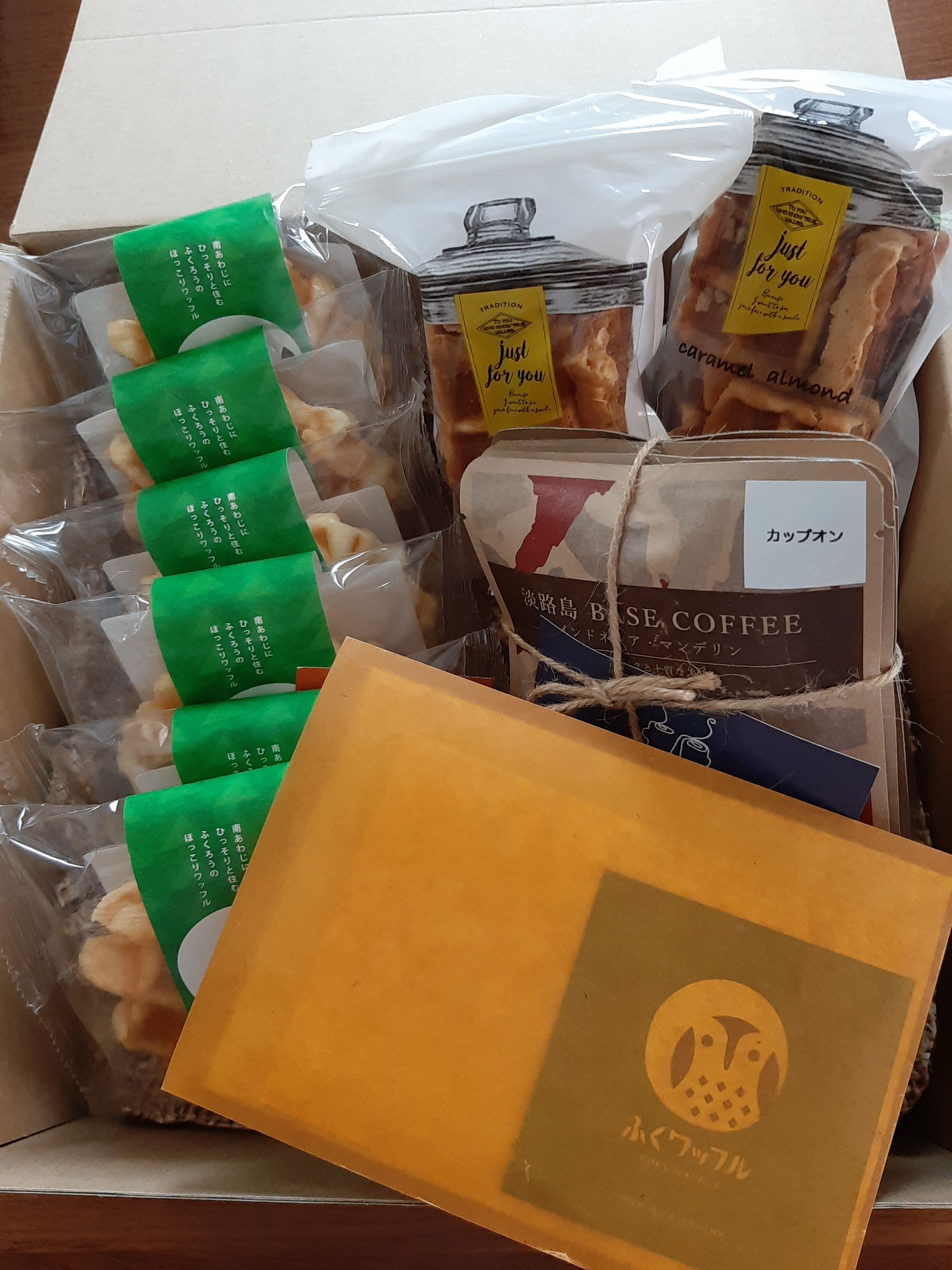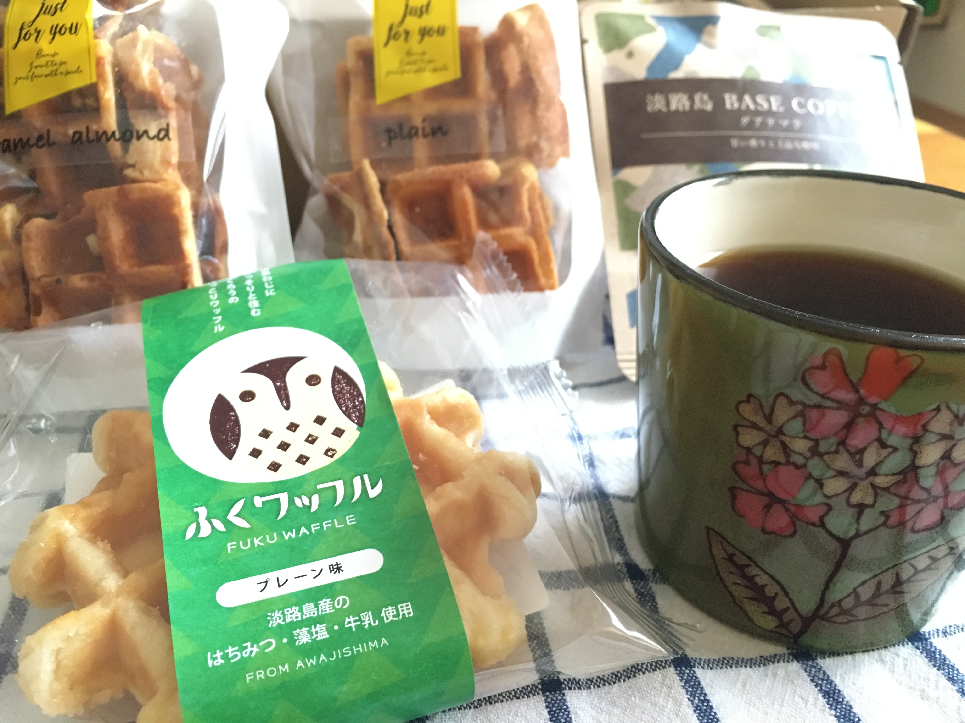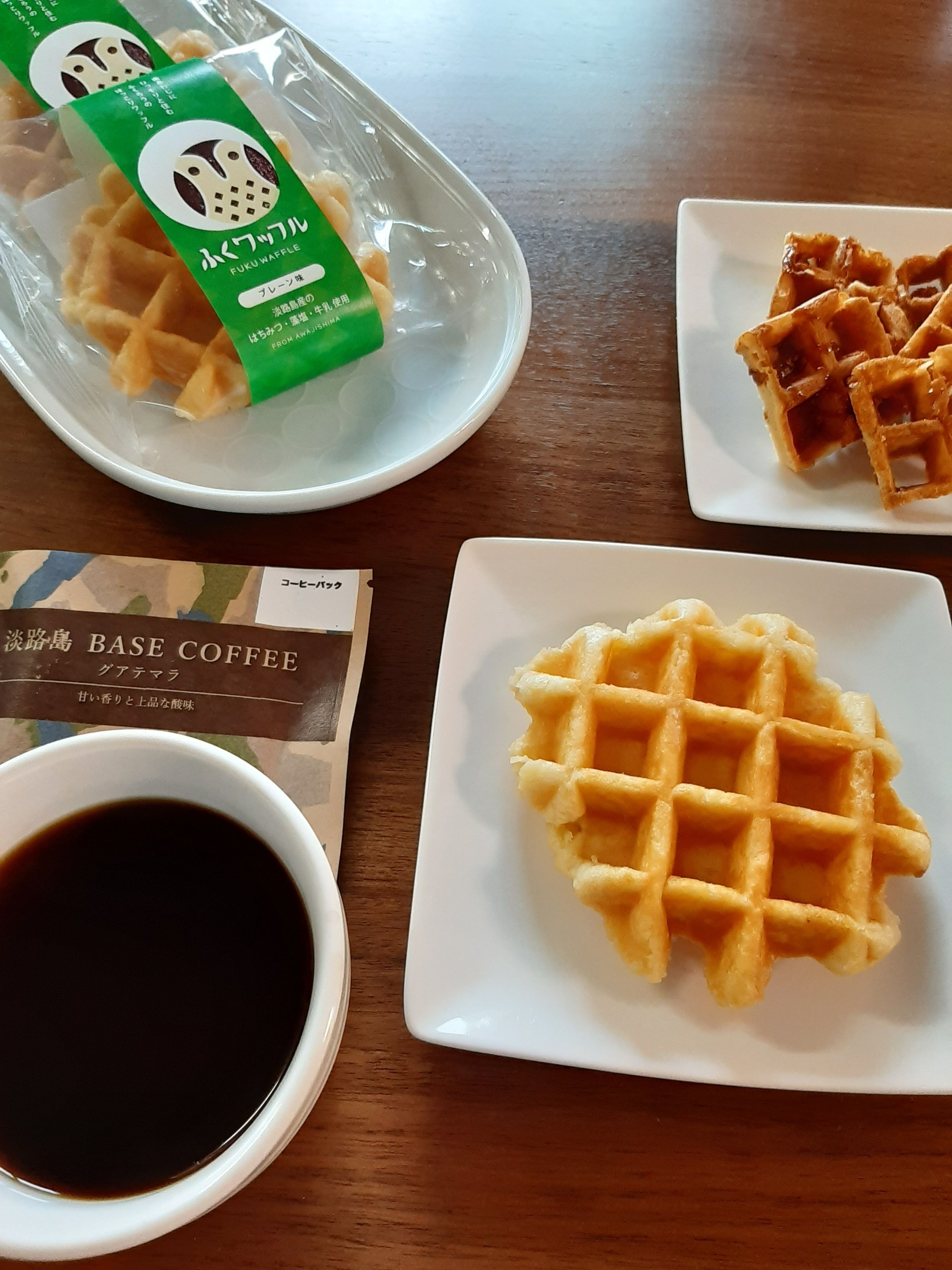 フクロウのモチーフが印象的な、スイーツとコーヒーのセットです。淡路島の牛乳、藻塩、蜂蜜を使用したふくワッフルと、淡路島の牛乳、北坂養鶏場のこだわり卵「さくら」、発酵バターを使用した、焼きたてベルギーワッフルをラスクにしたワッフルラスク2種(プレーンとキャラメルアーモンド)。さらに月1000個のペースで売れている、上級豆しか使用しないこだわりの自家焙煎、カップオン珈琲5種セット。ショップの人気トップ3が入ったセットです。