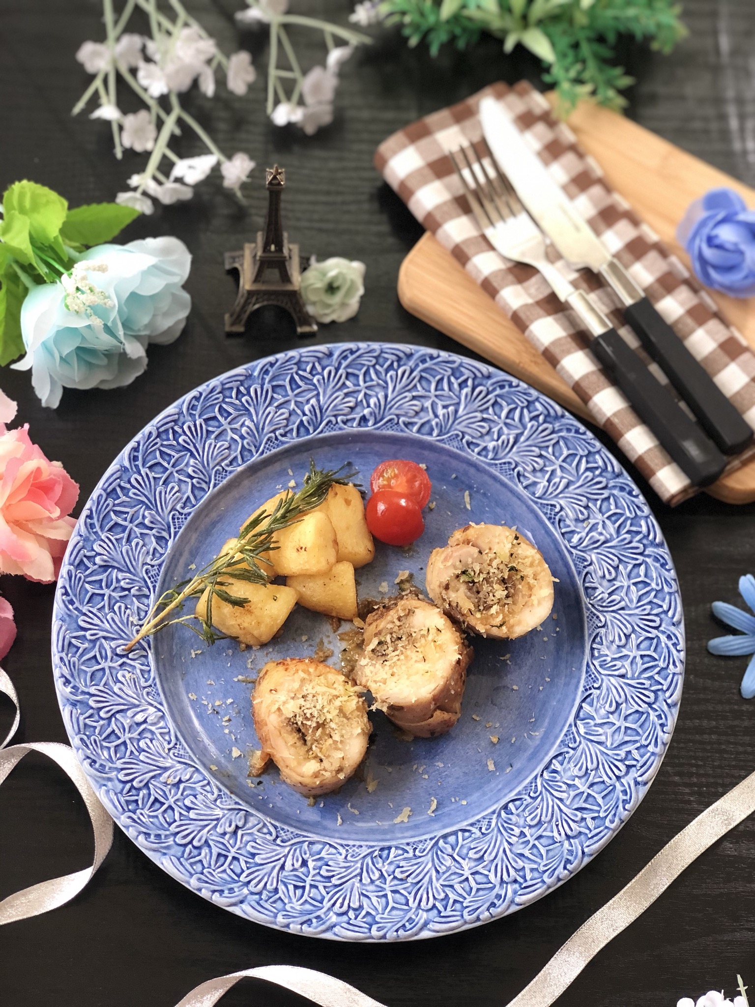 バロティーヌとは、開いた鶏肉、鳩や鴨などに詰め物を敷き筒状に巻き込んだフランス料理です。日南鶏もも肉に、香り豊かなポルチーニ茸、マッシュルーム、生ハム、エシャロットなどを詰めています。仕込み済みのお肉に、フライパンで焼き色をつけて頂き、付属のグレイビーソースをかけ、最後に手作りのカリカリハーブパン粉をふりかけて完成。「簡単な仕上げレシピ付」なので、難しい工程をすることなく、簡単なひと手間を加えるだけで本格的なプロの味が自宅で楽しめます。付け合わせもセットになっているので、特別な日のディナーなどにもおすすめです。